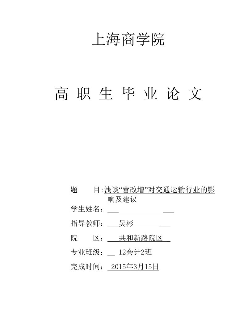上海商学院高职生毕业论文目:浅谈“营改增”对交通运输行业的影响及建议学生姓名:指导教师:吴彬院区:共和新路院区专业班级:12会计2班完成时间:2015年3月15日摘要2013年4月10日,国务院总理李克强主持召开国务院常务会议,决定自8月1日起将交通运输业和部分现代服务业试点在全国范围内推广开,并适当扩大部分现代服务业范围,力争“十二五”期间全面完成“营改增”改革。“营改增”可以完善我国税制,提高我国交通运输业的国际竞争力,但是从改革初期来看,制度的不完善、增值税抵扣链条的断裂等各方面原因导致了交通运输企业税负上升、利润下降的情况,交通运输企业如何应对“营改增”带来的负面影响值得我们进一步研究。但是从长期来看,“营改增”有利于交通运输企业的发展。本文主要研究“营改增”对交通运输行业的影响及意义,以及改革后交通运输企业的账务处理变化。关键词:营改增交通运输业税负目录一“营改增”的背景和主要内容二“营改增”对交通运输行业的意义4三“营改增”对交通运输行业的税负及利润的影响四“营改增”账务处理7(一)一般纳税人账务处理7(二)小规模纳税人账务处理五、改进建议9总结11致谢…参考文献13