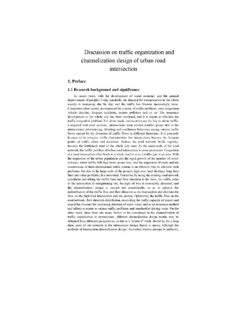 Discussion on traffic organization andchannelization design of urban roadintersection1.PrefaceCongestion often occurs,accompanied by a series of traffic problems:road congestionCompared with road sections,intersections form several conflict points due to theflows caused by the diversion of traffic flows in different directions.It is preciselybecome the bottleneck zone of the whole ciry mad As the main node of the roadconditions and taking the traffie flow and flow direetion as the basis,the traffic orderat the intersection is straightening out.the right of way is reasonably allocated,andflow on the high-load interscetion and the scction.Optimizing the traffic flow on theexport has become the increasing attention of many cities,and as an economic methodother hand,sinee thcre arc many factors to he considcred in the channclization oftraffic organization at intersections.different channelization design results may betechnology and norms also focus on "stay"in the application,although a series ofdomestic issued about the intersection design speoifications,Such as "urban rondrelevant intersection design implementation regulations,but in the relevant theoreticalresearch and channelization design system is rarely seen.Therefore,the intersection1.2 Development status of urban intersection formscomplex system,is such a key link,there are five processing forms.That is,no signallight control level intersection node,signal light control level intersection 2 node,extended signal light control level intersection node,plane ring node and1.2.1 Control plane intersections with signal lightspedestrians,they are filly competent to their work.but there are also a lot ofof Parliament in London.It is a painted signal devioe with no lights,and the signal isinstalled.The lamp was changed from red glass to grcen glass.The first traffic lightdid not last long.however,and the poorly designed gas pipe exploded,killing theand Petrovka Street.It was an arrow light made by a German company.Two traffielights with movable "wings".much like railvay signals,were installed on Pushkinzone and asking them to stop and wait in the red zone util they moved to the greenzone.I'raffic lights have improved over the years.In 1926,the world's first automaticto change the traffie lights to flash vellow at night,which greatly reduced the numbercomputer centralized coordination induction control signal system,which marked thegenerally combined with the traffic surveillance system to form a traffic control centerBy the early 1980s,more than 300 cities around the world had traffic coutrol centers.1.2.2 Plane roundaboutCircular intersections are a special form of plane intersections.Circular orthe intersection oircle the island in the same direction,which can nvoid direct crossto environmental protection.The disadvantage is that it covers an area and departs awill gradually decrease,genemlly can only march at the same speed step by step,ifTherefore,in 1963.Britain began to reduce the diameter of roundabout to aboutone-third of the diameter of the tangent circle at the outer edge of the roundabout,and