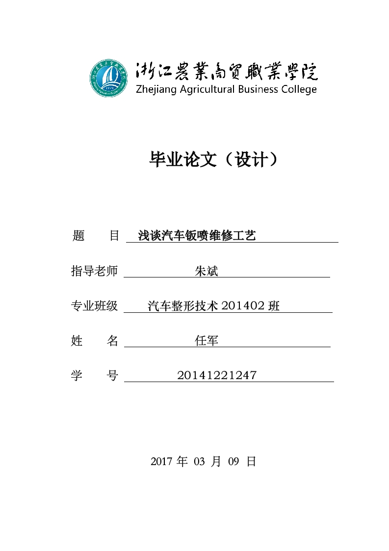 Zhejiang Agricultural Business College毕业论文(设计)题目浅谈汽车钣喷维修工艺指导老师朱斌专业班级汽车整形技术201402班姓名任军学号201412212472017年03月09日浙江农业商贸职业学院毕业论文(设计)摘要:汽车是目前社会发展中使用最为普遍的交通工具,日常生活中每天都需要汽车。对于汽车分析以及探究的课题持续增多,比如汽车制造、维修保养等部分。最为重要的是汽车维修业务,近期汽车事故逐渐增多,怎样提升汽车在遭遇事故之后的质量就变成大众分析的关键点。众多周知假如汽车被碰撞那么车身就会产生变形和破损等不良后果,如此为车主造成了众多问题,钣喷维修是处理上述问题的模式,利用上述工艺去除车主的问题。上述问题表面上十分简单,然而做起来异常繁杂,因此在大部分时候都要我们格外关注。接下来我们针对上述问题开展分析,希望可以给大家带来帮助。关键词:汽车维修;钣喷维修;工艺目录引言…1汽车钣喷维修的相关概述1.3汽车钣喷维修的主要工艺流程22.1按车身承载方式分类23.1前后保险杠修复..64事故车钣喷维修工艺4.1板件更换...7101112