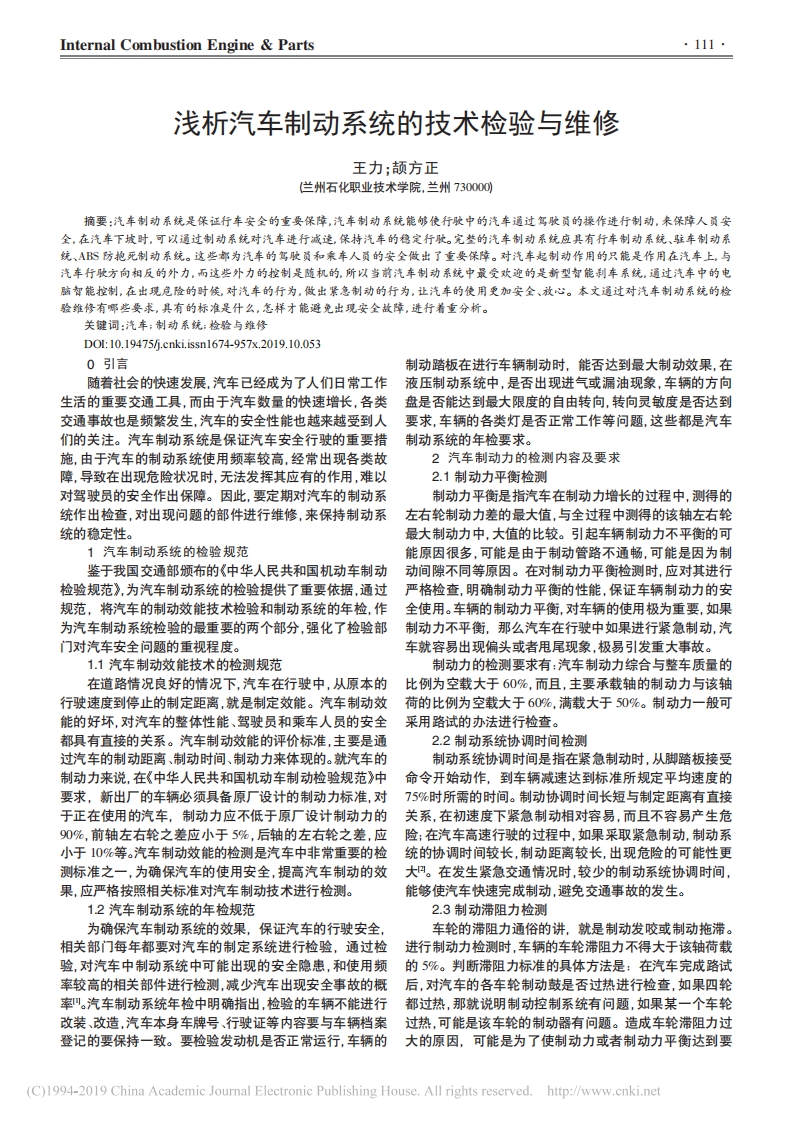 Internal Combustion Engine Parts浅析汽车制动系统的技术检验与维修王力;颉方正(兰州石化职业技术学院,兰州730000摘要:汽车制动系统是保证行车安全的重要保障,汽车制动系统能够使行收中的汽车通过驾耿员的操作进行制动,来保障人员安全,在汽车下城时,可以通过制动系统对汽车进行减速,保持汽车的稳定行驶。完整的汽车制动系统应具有行车制动系统、驻车制动系统、AS防抱死制动系统。这些都为汽车的驾驶员和乘车人员的安全做出了重要保障。对汽车起制动作用的只能是作用在汽车上,与汽车行驶方向相反的外力,而这些外力的控制是随机的。所以当前汽车制动系统中最受欢迎的是新型智能制车系统。通过汽车中的电脑智能控制,在出现危险的时候,对汽车的行为,做出紧急制动的行为,让汽车的使用更加安全、放心。本文通过对汽车制动系统的检验维修有哪些要求,具有的标准是什么,怎样才能避免出现安全故障,进行着重分析。关键词:汽车:制动系统:检验与雏修D0:10.19475f.cnki.issn1674-957x.2019.10.0530引言制动踏板在进行车辆制动时,能否达到最大制动效果,在随着社会的快速发展,汽车已经成为了人们日常工作液压制动系统中,是否出现进气或漏油现象,车辆的方向生活的重要交通工具,而由于汽车数量的快速增长,各类盘是否能达到最大限度的自由转向,转向灵敏度是否达到交通事故也是频繁发生,汽车的安全性能也越来越受到人要求,车辆的各类灯是否正常工作等问题,这些都是汽车们的关注。汽车制动系统是保证汽车安全行驶的重要措制动系统的年检要求。施,由于汽车的制动系统使用频率较高,经常出现各类故2汽车制动力的检测内容及要求障,导致在出现危险状况时,无法发挥其应有的作用,难以2.1制动力平衡检测对驾驶员的安全作出保障。因此,要定期对汽车的制动系制动力平衡是指汽车在制动力增长的过程中,测得的统作出检查,对出现问题的部件进行维修,来保持制动系左右轮制动力差的最大值,与全过程中测得的该轴左右轮统的稳定性。最大制动力中,大值的比较。引起车辆制动力不平衡的可1汽车制动系统的检验规范能原因很多,可能是由于制动管路不通畅,可能是因为制鉴于我国交通部颁布的《中华人民共和国机动车制动动间隙不同等原因。在对制动力平衡检测时,应对其进行检验规范》,为汽车制动系统的检验提供了重要依据,通过严格检查,明确制动力平衡的性能,保证车辆制动力的安规范,将汽车的制动效能技术检验和制动系统的年检,作全使用。车辆的制动力平衡,对车辆的使用极为重要,如果为汽车制动系统检验的最重要的两个部分,强化了检验部制动力不平衡,那么汽车在行驶中如果进行紧急制动,汽门对汽车安全问题的重视程度。车就容易出现偏头或者甩尾现象,极易引发重大事故。1.1汽车制动效能技术的检测规范制动力的检测要求有:汽车制动力综合与整车质量的在道路情况良好的情况下,汽车在行驶中,从原本的比例为空载大于60%,而且,主要承载轴的制动力与该轴行驶速度到停止的制定距离,就是制定效能。汽车制动效荷的比例为空载大于60%,满载大于50%。制动力一般可能的好坏,对汽车的整体性能、驾驶员和乘车人员的安全采用路试的办法进行检查。都具有直接的关系。汽车制动效能的评价标准,主要是通2.2制动系统协调时间检测过汽车的制动距离、制动时间、制动力来体现的。就汽车的制动系统协调时间是指在紧急制动时,从脚踏板接受制动力来说,在《中华人民共和国机动车制动检验规范》中命令开始动作,到车辆减速达到标准所规定平均速度的要求,新出厂的车辆必须具备原厂设计的制动力标准,对75%时所需的时间。制动协调时间长短与制定距离有直接于正在使用的汽车,制动力应不低于原厂设计制动力的关系,在初速度下紧急制动相对容易,而且不容易产生危90%,前轴左右轮之差应小于5%,后轴的左右轮之差,应险:在汽车高速行驶的过程中,如果采取紧急制动,制动系小于10%等。汽车制动效能的检测是汽车中非常重要的检统的协调时间较长,制动距离较长,出现危险的可能性更测标准之一,为确保汽车的使用安全,提高汽车制动的效大四。在发生紧急交通情况时,较少的制动系统协调时间,果,应严格按照相关标准对汽车制动技术进行检测。能够使汽车快速完成制动,避免交通事故的发生。1.2汽车制动系统的年检规范2.3制动滞阻力检测为确保汽车制动系统的效果,保证汽车的行驶安全,车轮的滞阻力通俗的讲,就是制动发咬或制动拖滞。相关部门每年都要对汽车的制定系统进行检验,通过检进行制动力检测时,车辆的车轮滞阻力不得大于该轴荷载验,对汽车中制动系统中可能出现的安全隐患,和使用频的5%。判断滞阻力标准的具体方法是:在汽车完成路试率较高的相关部件进行检测,减少汽车出现安全事故的概后,对汽车的各车轮制动鼓是否过热进行检查,如果四轮率四。汽车制动系统年检中明确指出,检验的车辆不能进行都过热,那就说明制动控制系统有问题,如果某一个车轮改装、改造,汽车本身车牌号、行驶证等内容要与车辆档案过热,可能是该车轮的制动器有问题。造成车轮滞阻力过登记的要保持一致。要检验发动机是否正常运行,车辆的大的原因,可能是为了使制动力或者制动力平衡达到要(C)1994-2019 China Academic Journal Electronic Publishi
