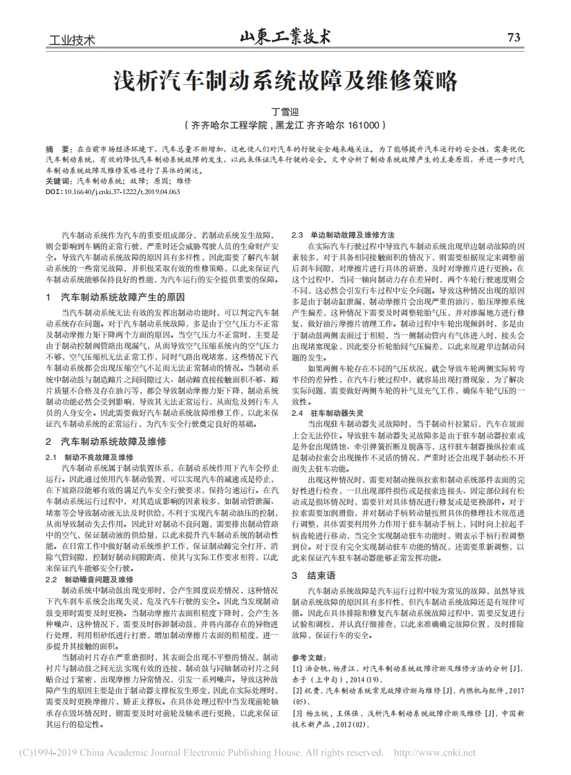 工业技术73浅析汽车制动系统故障及维修策略丁雪迎(齐齐哈尔工程学院,黑龙江齐齐哈尔161000)摘要:在当前市场经济环境下,汽车总量不断增加,这也使人们对汽车的行驶安全越来越关注。为了能够提升汽车远行的安全性,需要优化汽车制动系统,有效的降低汽车制动系统故障的发生,以此来保证汽车行驶的安全。文中分析了制动系统故障产生的主要原因,并进一步对汽车制动系统故障及维修策略进行了具体的阐述。D0I:10.16640/1cmk.37-1222/L2019.04.063汽车制动系统作为汽车的重要组成部分,若制动系统发生故障,2.3单边制动故障及维修方法则会影响到车辆的正常行驶,严重时还会威胁驾驶人员的生命财产安在实际汽车行驶过程中导致汽车制动系统出现单边制动故障的因全。导致汽车制动系统故障的原因具有多样性,因此需要了解汽车素较多,对于具备相同接触面积的情况下,则需要根据规定来调整前动系统的一些常见故障,并积极采取有效的维修策略,以此来保证汽后刹车间隙,对摩擦片进行具体的研磨,及时对摩擦片进行更换。在车制动系统能够保持良好的性能,为汽车运行的安全提供重要的保障。这个过程中,当同一轴向制动力存在差异时,两个车轮行驶速度则会不同,这必然会引发行车过程中安全问题。导致这种情况出现的原因1汽车制动系统故障产生的原因多是由于制动红泄漏,制动摩擦片会出现严重的油污,胎压摩擦系统当汽车制动系统无法有效的发挥出制动功能时,可以判定汽车制产生偏差,这种情况下需要及时调整轮胎气压,并对渗漏地方进行修动系统存在问题。对于汽车制动系统故障,多是由于空气压力不正常复,做好油污摩擦片清理工作。制动过程中车轮出现倾斜时,多是由及制动摩擦力矩下降两个方面的原因。当空气压力不正常时,主要是于制动鼓两侧表面过于相楂,当一侧制动管内有气体进入时,接头会由于制动控制阀管路出现漏气,从而导致空气压缩系统内的空气压力出现堵塞现象,因此要分析轮胎间气压偏差,以此来规避单边制动问不够,空气压缩机无法正常工作,同时气路出现堵塞,这些情况下汽车制动系统都会出现压缩空气不足而无法正常制动的情况。当制动系如果两侧车轮存在不同的气压状况,就会导致车轮两侧实际转弯统中制动鼓与制造蹄片之间间隙过大、制动蹄直接接触面积不够、蹄半径的差异性,在汽车行驶过程中,就容易出现打滑现象,为了解决片质量不合格及存在油污等,都会导致制动摩擦力矩下降,制动系统实际问题,需要做好两侧车轮的补气及充气工作,确保车轮气压的一制动功能必然会受到影响,导致其无法正常运行,从而危及到行车人致性。员的人身安全。因此需要做好汽车制动系统故障维修工作,以此来保2.4驻车制动器失灵证汽车制动系统的正常运行,为汽车安全行驶奠定良好的基础。当出现驻车制动器失灵故障时,当手制动杆拉紧后,汽车在坡面上会无法停住。导致驻车制动器失灵故障多是由于驻车制动器拉索或2汽车制动系统故障及维修是外套出现锈蚀、牵引弹簧折断及脱落等,这样驻车制器操纵拉索或2.1制动不良故障及维修是制动拉索会出现操作不灵活的情况,严重时还会出现手制动松不开汽车制动系统属于制动装置体系,在制动系统作用下汽车会停止而失去驻车功能。运行。因此通过使用汽车制动装置,可以实现汽车的减速或是停止,出现这种情况时,需要对制动操纵拉索和制动系统部件表面的完在下坡路段能够有效的满足汽车安全行驶要求,保持匀速运行。在汽好性进行检查,一旦出现部件损伤或是接索连接头、固定部位间有松车制动系统运行过程中,对其造成影响的因素较多,如制动管泄漏、动或是损坏情况时,需要针对具体情况进行修复或是更换部件。对于堵塞等会导致制动液无法及时供给,不利于实现汽车制动油压的控制,拉索需要加润滑脂,并对制动手柄转动量按照具体的修理技术规范进从而导致制动失去作用。因此针对制动不良问题,需要排出制动管路行调整,具体需要利用外力作用于驻车制动手柄上,同时向上拉起手中的空气,保证制动液的供给量,以此来提升汽车制动系统的制动性柄齿轮进行移动,当完全实现制动驻车功能时,则表示手柄行程调整能。在日常工作中做好制动系统维护工作,保证制动蹄完全打开,消到位。对于没有完全实现制动驻车功能的情况,还需要重新调整,以除气管间隙,控制好制动间隙距离,使其与实际工作要求相符,以此此来保证汽车驻车制动器能够正常发挥功能。来保证汽车能够安全行驶。2.2制动噪音问题及维修3结束语制动系统中制动鼓出现变形时,会产生圆度误差情况,这种情况汽车制动系统故障是汽车运行过程中较为常见的故障,虽然导致下汽车刹车系统会出现失灵,危及汽车行驶的安全。因此当发现制动制动系统故障的原因具有多样性,但汽车制动系统故障还是有规律可鼓变形时需要及时更换。当制动摩擦片表面粗糙度下降时,会产生各循。因此在具体排除和修复汽车制动系统故障过程中,需要反复进行种噪声,这种情况下,需要及时拆卸制动鼓,并将内部存在的异物进试验和调校,并认真仔细排查,以此来准确确定故障位置,及时排除行处理,利用粗砂纸进行打磨,增加制动摩擦片表面的粗糙度,进一故障,保证行车的安全。步提升其接触的面积。当制动衬片存在严重磨损时,其表