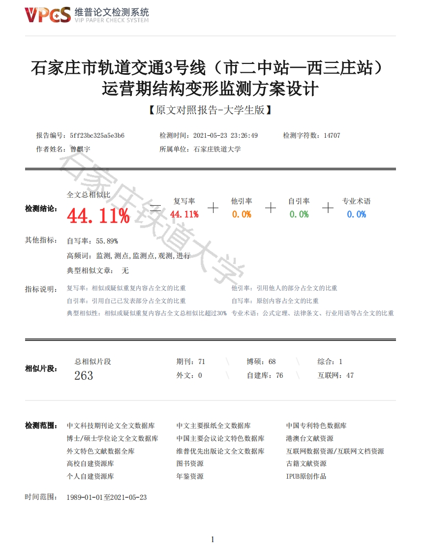 维普论文检测系统VIP PAPER CHECK SYSTEM石家庄市轨道交通3号线(市二中站一西三庄站)运营期结构变形监测方案设计【原文对照报告-大学生版】报告编号:5ff23bc325a5e3b6检测时间:2021-05-2323:26:49检测字符数:14707作者姓名:曾麒宇所属单位:石家庄铁道大学全文总相似比复写率他引率自引率专业术语检测结论:44.11%44.11%0.0%0.0%0.0%其他指标:自写率:55.89%高频词:监测,测点,监测点,观测,进行典型相似文章:无指标说明:复写率:相似或疑似重复内容占全文的比重他引率:引用他人的部分占全文的比重自引率:引用自己已发表部分占全文的比重自写率:原创内容占全文的比重典型相似性:相似或疑似重复内容占全文总相似比超过30%专业术语:公式定理、法律条文、行业用语等占全文的比重总相似片段期刊:71博硕:68综合:1相似片段:263外文:0自建库:76互联网:47检测范围:中文科技期刊论文全文数据库中文主要报纸全文数据库中国专利特色数据库博士/硕士学位论文全文数据库中国主要会议论文特色数据库港澳台文献资源外文特色文献数据全库维普优先出版论文全文数据库互联网数据资源/互联网文档资源高校自建资源库图书资源古籍文献资源个人自建资源库年鉴资源IPUB原创作品时间范围:1989-01-01至2021-05-23维普论文检测系统VIP PAPER CHECK SYSTEM原文对照颜色标注说明:■自写片段■复写片段(相似或疑似重复)口引用片段(引用)■专业术语(公式定理、法律条文、行业用语等)第1章绪论1.1地铁变形监测的意义随着我国城市化建设的不断加快,地铁工程建设在各大城市日趋普遍。以地铁为代表的轨道交通在缓解城市交通拥挤等问题上起到了巨大作用,体现出了巨大优势。作为一种安全、便捷、清洁的新型交通方式,地铁工程的建设,为城市经济发展,环境保护,响应我国可持续发展战略起到了难以估量的积极作用。因此在我国现代城市建设中,地铁工程建设技术愈发成熟,建设规模也越来越大。但地铁工程在建设和运营过程中,受到其内部和外部因素的影响,会存在一定的质量和安全问题,需要做到及时处理,以保证铁路结构和运营的安全,避免交通线路的中断等问题,因此,需要定期对地铁结构进行变形监测。地铁主体结构一般建设在城市地下,有时也会在地上建设高架桥用于部分结构,地质环境较为复杂,隧道狭窄,且同时存在许多城市地下管线等市政设施。封闭的地铁环境,一旦发生安全事故,其应急疏散难度较大,会给群众生命安全带来极大威胁。图1-1墨西哥地铁地面轨道桥体垮塌事故2维普论文检测系统VIP PAPER CHECK SYSTEM图1-2渗水塌陷引发瓦斯爆炸地铁结构的变形和沉降的主要原因有以下几点,一是主要由于地质构造的演变等导致地基变形,内部应力受到变化。二是地铁线路会穿过不同水文地质条件的地层,造成不同程度的沉降,这种不均匀的沉降会给地铁结构带来较大影响。三是地铁项目会由于城市中的一些大型建筑的修建施工,对地铁结构造成变形。同时,地铁结构的沉降变形也会给周边环境,如建筑物和市政地下管线等带来沉降变形等影响。因此不单单只为了保证地铁结构自身的安全,还要考虑到其周边环境的安全。必须对地铁隧道结构进行变形监测,掌握地铁运营后车辆荷载和运行对车站和区间隧道结构及轨道线路的影响。1.2国内外变形监测技术现状现代科学技术的快速发展,也为变形监测手段带来了技术革新。现代变形监测技术大致可分为地下、地面和空间三个方向:(1)目前,地下变形监测技术主要应用于岩土内部变形和结构体变形监测。地下变形监测技术自动化的实现,得益于沉降仪、测斜仪和应变计的广泛使用。利用光纤传感器,可应用于以往易受到电磁干扰的传统检测设备所无法监测到的点位上,从而可以进行远距离地下变形监测。(2)传统地面观测技术主要使用经纬仪、水准仪、全站仪等仪器。激光三维扫描技术和测量机器人使得现代观测技术测量效率提高,自动化程度也大大提高,地面变形监测技术的自动化得以初步实现。利用三维激光扫描技术获取监测对象的三维表面数据较为迅捷便利,在文物保护建模,地面景观形体测量,工程量计算及高陡边坡地形测量等应用中能够体现出巨大优势。测量机器人是一种自动全站仪,和传统全站仪相比较,它具有目标自动识别装置和驱动照准部旋转的步进马达。测量机器人监测系统有着两种方式,分为固定持续式和移动式。移动式也被称为常规搬站式,这种方式可以利用全站仪内置的软件程序在全站仪测量时实现自动控制。将测量机器人长期固定于测站上的方式被称为固定持续监测式,可以实现在无人值守的情况下,进行全天候连续监测,完成数据自动处理和远程监控。(3)空间变形监测技术能够利用卫星传感器对地面构筑物进行变形监测。目前可分为机载激光三维扫描技术、D-InSAR技术和GPS技术等。机载激光三维扫描技术可以获取的三维地形数据相比于传统监测技术更大。D-ISAR技术可以在全天候情况下,实现无接触工作,可以进行大面积范围的监测地面微小形变,10000k2的地表数据只需一幅图像即可,且空间分辨率高达5m×20m。在形变监测领域,GS技术可以利用其全球坐标系统,进行地球板块运动的监测,为监测地震提供决策信息。[1]1.3地铁变形监测的主要内容运营期线路监测的主要内容应包括线路隧道、车站、高架桥梁、路基和轨