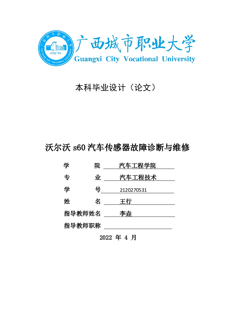 广西城市职业大学Guangxi City VocationalUniversity本科毕业设计(论文)沃尔沃s60汽车传感器故障诊断与维修学院汽车工程学院专业汽车工程技术学号2120270531名王行指导教师姓名李垚指导教师职称2022年4月摘要发动机是汽车的“心脏”,而传感器则是发动机的“眼睛”和“耳朵”。现在市面上流行的汽车,大多数都配备两个或两个以上。根据安装位置可以分为前传感器和后传感器。前传感器诊断发动机做工后,尾气中的含量,通常安装在发动机的尾气排放管处:后传感器是用来诊断三元催化剂的工作情况,通常安装在汽车三元催化剂后。传感器的寿命原本可达3年,但是由于每个车主驾驶习惯不同、300℃以上的工作温度、汽车剧烈抖动,进而加快其寿命缩减。其中最直接的原因有两个,积碳和中毒。传感器失效后会导致油耗增加、年检不合格和发动机抖动,因此,定期对传感器进行诊断和维修是非常有必要的。AbstractThe engine is the "heart"of the car,and the sensors are the "eyes"and "ears"of the engine.Most popular cars on the market today areequipped with two or more.According to the installation position canbe divided into the front oxygen sensor and the rear oxygen sensor.Thefront oxygen sensor detects the oxygen content in the tail gas afterthe engine works,and is usually installed in the exhaust pipe of theengine.The post oxygen sensor is used to detect the working conditionof the ternary catalyst,usually installed in the automobile ternarycatalyst.The life of the oxygen sensor can reach 3 years originally,but due to the different driving habits of each owner,the workingtemperature of 300C or more,the car shaking violently,and thenaccelerate its lifereduction.Two of the most immediate causes are carbondeposition and poisoning.Oxygen sensorfailure will lead toincreased fuel consumption,annual inspection failure and engine jitter,so it is very necessary to regularly detect and clean the oxygen sensor.Key words:Oxygen sensor;Life expectancy reduction;Carbondeposition;Poisoning;