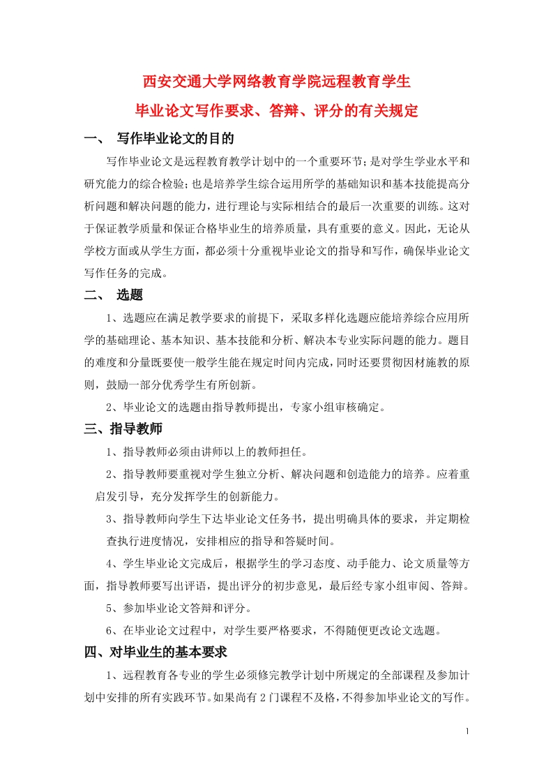 西安交通大学网络教育学院远程教育学生毕业论文写作要求、答辩、评分的有关规定一、写作毕业论文的目的写作毕业论文是远程教育教学计划中的一个重要环节:是对学生学业水平和研究能力的综合检验:也是培养学生综合运用所学的基础知识和基本技能提高分析问题和解决问题的能力,进行理论与实际相结合的最后一次重要的训练。这对于保证教学质量和保证合格毕业生的培养质量,具有重要的意义。因此,无论从学校方面或从学生方面,都必须十分重视毕业论文的指导和写作,确保毕业论文写作任务的完成。二、选题1、选题应在满足教学要求的前提下,采取多样化选题应能培养综合应用所学的基础理论、基本知识、基本技能和分析、解决本专业实际问题的能力。题目的难度和分量既要使一般学生能在规定时间内完成,同时还要贯彻因材施教的原则,鼓励一部分优秀学生有所创新。2、毕业论文的选题由指导教师提出,专家小组审核确定。三、指导教师1、指导教师必须由讲师以上的教师担任。2、指导教师要重视对学生独立分析、解决问题和创造能力的培养。应着重启发引导,充分发挥学生的创新能力。3、指导教师向学生下达毕业论文任务书,提出明确具体的要求,并定期检查执行进度情况,安排相应的指导和答疑时间。4、学生毕业论文完成后,根据学生的学习态度、动手能力、论文质量等方面,指导教师要写出评语,提出评分的初步意见,最后经专家小组审阅、答辩。5、参加毕业论文答辩和评分。6、在毕业论文过程中,对学生要严格要求,不得随便更改论文选题。四、对毕业生的基本要求1、远程教育各专业的学生必须修完教学计划中所规定的全部课程及参加计划中安排的所有实践环节。如果尚有2门课程不及格,不得参加毕业论文的写作。2、学生必须按安排要求及时与指导教师联系、定期汇报工作进展情况,根据导师对论文提出的修改意见及时进行修改,直到导师认可为止。并将作好的论文按时送交指导教师,在规定的时间进行毕业论文答辩。3、每位毕业班学生必须认真对待毕业论文的写作,根据西安交通大学远程教育指导教师所列选题选定题目,在认真研究的基础上独立完成毕业论文。培养和坚持优良的学风,在规定的时间范围内按时写出反映本人最高水平的论文。不允许抄袭他人的研究成果,更不允许由别人代作。发现类似的情节,论文不予通过。4、写作毕业论文的具体要求论文的总体结构应分为以下几部分:题目、摘要、目录、前言、正文、结论、参考文献和附录等几部分组成。论文应力求有作者自己的创见和观点,中心突出,层次分明,论述清楚,结构严谨,文字流畅,论证有理有据,具有说服能力。整篇论文字数专升本、高起本层次不少于8000字。具体字数根据专业的不同,按照指导老师的要求进行写作。字迹要工整清洁。(1)、毕业论文的结构题目:即标题,它的主要作用是概括整篇论文的中心内容。因此,题目要确切、鲜明、简短、精炼。目录:反映论文的纲要。目录应列出通篇论文各组成部分的大小标题,分别层次,逐项标注页码,并包括注明参考文献、附录、图版、索引等附属部分的页次,以便读者查找。摘要:摘要是论文的高度概括,是全文的缩影,是长篇论文不可缺少的组成部分。要用中英文分别书写,一篇摘要不多于400字。结尾要注明3-5个关键词。前言:前言相当于论文的开头,它是三段式论文的第一段(后二段是正文和结论)。前言与摘要写法不完全相同,摘要要写得高度概括、简略,前言可以稍加具体一些,文字以800字左右为宜。前言一般应包括以下几个内容:①为什么要写这篇论文,要解决什么问题,主要观点是什么。②对本论文研究主题范围内已有文献的评述(包括与课题相关的历史的回顾,资料来源、性质及运用情况等)。③说明本论文所要解决的问题,所采用的研究手段、方式、方法。明确研究2工作的界限和规模。④概括本课题研究所取得的成果及意义。正文:论文的正文是作者对自己的研究工作详细的表述。应包括以下内容:①理论分析部分:详细说明所使用的分析方法和计算方法等基本情况:指出所应用的分析方法、计算方法、实验方法等哪些是已有的,哪些是经过自己改进的,哪些是自己创造的,以便指导老师审查和纠正,这一部分所占篇幅不宜过多,应以简练、明了的文字概略表述。②课题研究的方法与手段,分别以下面几种方法说明。用实验方法研究课题,应具体说明实验用的装置、仪器、原材料的性能等是否标准,并应对所有装置、仪器、原材料做出检验和标定。对实验的过程和操作方法,力求叙述得简明扼要,对实验结果的记录、分析、对人所共知的或细节性的内容不必过分详述。用理论推导的手段和方法达到研究目的的,这方面内容要精心组织,做到概念准确,判断推理符合客观事物的发展规律,要做到言之有序,言之有理,以论点为中枢,组织成完整而严谨的内容整体。用调查研究的方法达到研究目的的,调查目标、对象、范围、时间、地点,调查的过程和方法等,这些内容与研究的最终结果有关系,但不是结果本身,所以一定要简述。③结果与讨论是全文的心脏,一般要占较多的篇幅。在写作时,应对研究成果精心筛选,把那些必要而充分的数据、现象、样品、认识等选出来,写进去,作为分析的依据,应尽量避免事无巨细,