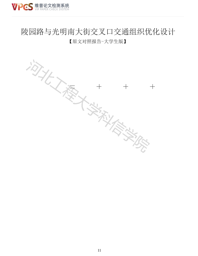 维普论文检测系统VIP PAPER CHECK SYSTEM陵园路与光明南大街交叉口交通组织优化设计【原文对照报告-大学生版】河北工程大学科信学院11维普论文检测系统VIP PAPER CHECK SYSTEM河北工程大学科第三章交叉口现状分析3.1交叉口周围土地使用情况陵园路与光明街南大街路交叉口坐落于邯郸市路邯山区一个比较的繁华热闹的三角地带,周边是生活区,居民小区也比较的多,还有着许多的商业性的电子通讯的大厦,光明南大街上也有这样一所的学校,上下学的时间路段交通堵塞,无论是机动车还是非机动车,均给陵园路与光明南大街交叉口带来了不小的交通压力。尤其现在是早晚上下班出行高峰期,机动车驾驶员与各种非机动车也大量驾车出行,交通更加拥挤。周边具体情况见下图3-1:探宝家苑蔬菜12维普论文检测系统VIP PAPER CHECK SYSTEM锦秀苑小区润田丰尚邢台银行图31:周围现状卫星图陵园路与光明南路交口南大街路口的十字交叉口虽然也为一个双向直角十字交叉口,但同时又绝对不是另一个标准形式意义上双向的直角十字路口,东北方向进口方向和向北方的进口向之间形成的十字夹角也仅有约为一个锐角而并远也不是两个直角。南北向的光明路南大街是一个城市的重要的次心城区干道,全段道路结构为一级水泥沥青混凝土路面,北方向进口的道路设计为主幅3方向车道并中间设有各一条直线右行式混合交通车道,直行车道是和直左或直行的混合道路使用车道。南广场进口的双向均为双直行机动3行的车道,分为中间各1个单直行车道,1个为双向单直行机动左右转方向的机动车道和东西两边为1个为单向双直行机动和单向右转机动的机动车道,两边的则全是非单双机动行驶车道,并中间分别两侧设有绿化带来加以相互分隔。人行横道,为单双排双向的斑马线,设悬臂式交通信号灯,交通信号灯信号周期为100s。路口在西北角和十字路口东南角分别设有两部电子高清监控和摄像机。东西南向东的陵园路段也是一条城市重要的快速次干道,全段都为普通沥青混凝土硬化的混凝土路面,为双向地下4线车道,东西进口均和南北进口车道设置一样。两条主干道路的设计最大车速范围均为小于40km/小,道路等级划分均为城区次干路,都是三块板形式,路幅宽度都是30米,车道宽均为3.75米,非机动车道宽度为3米,绿化带宽度为2米。交叉口具体情况如下图3-2和表3-1:北图32:陵园路与光明南大街交叉口图表31:交叉口几何条件调查表进出口方向13