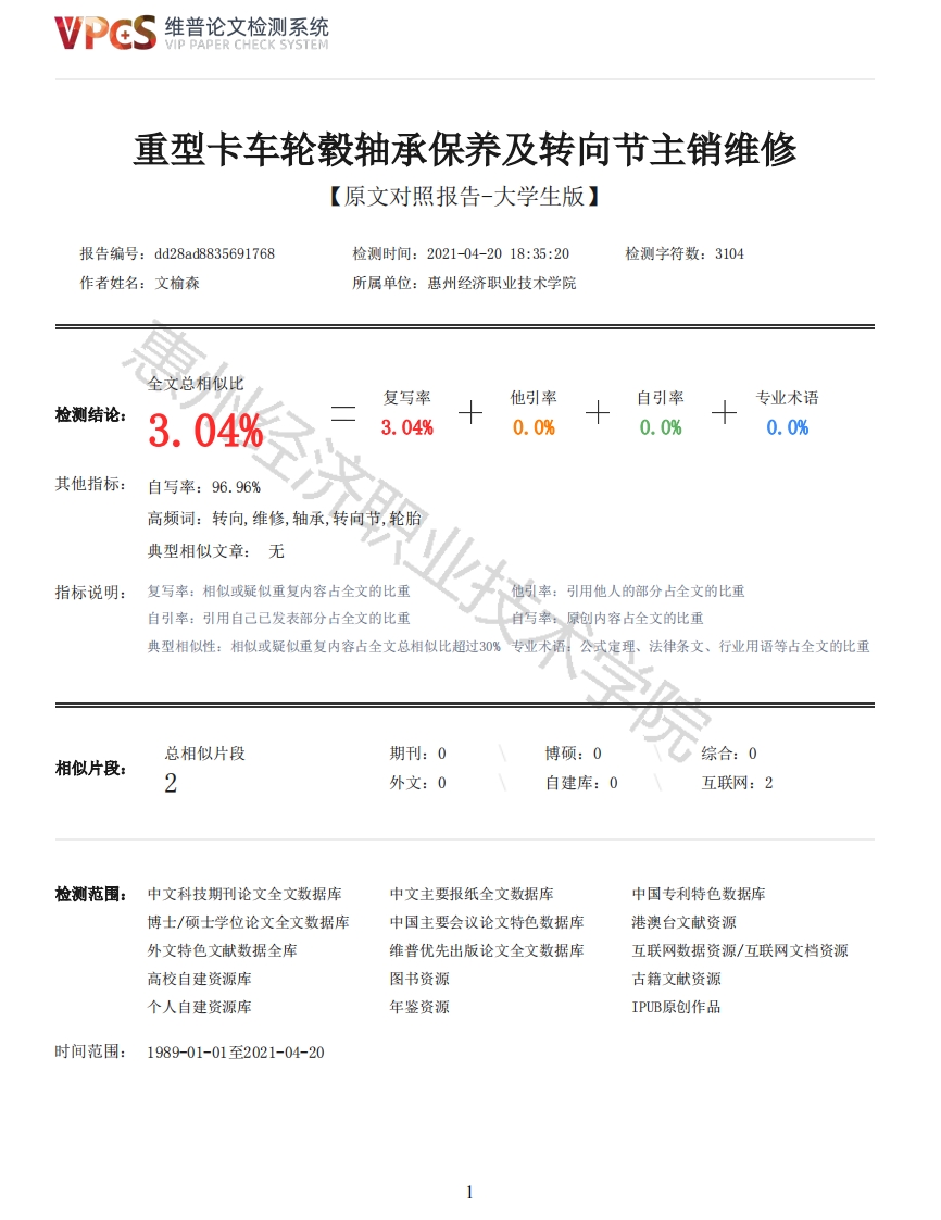维普论文检测系统/IP PAPER CHECK SYSTEM重型卡车轮毂轴承保养及转向节主销维修【原文对照报告-大学生版】报告编号:dd28ad8835691768检测时间:2021-04-2018:35:20检测字符数:3104作者姓名:文榆森所属单位:惠州经济职业技术学院全文总相似比复写率他引率自引率专业术语检测结论:3.04%3.04%0.0%0.0%0.0%其他指标:自写率:96.96%高频词:转向,维修,轴承,转向节,轮胎典型相似文章:无指标说明:复写率:相似或疑似重复内容占全文的比重他引率:引用他人的部分占全文的比重自引率:引用自己已发表部分占全文的比重自写率:原创内容占全文的比重典型相似性:相似或疑似重复内容占全文总相似比超过30%专业术语:公式定理、法律条文、行业用语等占全文的比重总相似片段期刊:0博硕:0综合:0相似片段:2外文:0自建库:0互联网:2检测范围:中文科技期刊论文全文数据库中文主要报纸全文数据库中国专利特色数据库博士/硕士学位论文全文数据库中国主要会议论文特色数据库港澳台文献资源外文特色文献数据全库维普优先出版论文全文数据库互联网数据资源/互联网文档资源高校自建资源库图书资源古籍文献资源个人自建资源库年鉴资源IPUB原创作品时间范围:1989-01-01至2021-04-20维普论文检测系统VIP PAPER CHECK SYSTEM原文对照颜色标注说明:■自写片段■复写片段(相似或疑似重复)引用片段(引用)■专业术语(公式定理、法律条文、行业用语等)Huizhou Economics And Polytechnic College毕业设计(项目)题目名称重型卡车轮毂轴承保养及转向节主销维修学生姓名:文榆森学号:1822010128班级:18汽车维修1班指导教师:黎武雄技术学院提交日期:2021年4月20日汽车与机械工程学院毕业论文成绩评定表学生姓名专业班级指导教师姓名指导教师职称设计(项目)题目指导师指导教师评定成绩指导教师签名20年月日意见考核考核小组评定成绩考核小组组长签名20年月日2维普论文检测系统VIP PAPER CHECK SYSTEM组意见学院领导意见评定等级毕业设计(项目)承诺书对于本人的毕业设计(项目)作如下承诺:1.按学院规定时间完成毕业设计(项目),逾期不能完成毕业设计(项目),同意推迟毕业。2.本人毕业设计(项目)系自己独立完成,被查属于剽窃、抄袭、请他人代作等情况,其后果由本人承担。3.本人完全了解学校关于收集、保存、使用毕业设计(项目)的规定,学校有权保留、送交毕业设计(项目)的纸质版和电子版,允许毕业设计(项目)被查阅和借阅,学校可以公布毕业设计(项目)的全部或部分内容,可以采用影印、扫描等复制手段保存本毕业设计(项目)。作者签名:文榆森时间:2021.4.20摘要本文论述了一例格江淮尔发重卡轮毂轴承保养和转向节主销维修操作过程。本文图文并茂,通过真实的轮毂轴承保养机刹车片转向节主销总成,说明维修保养所需的设备工具、操作步骤、动作要领和注意事项。关健词:江淮格尔发重卡轮毂轴承保养转向主销维修操作流程目录1项目名称52完成项目的条件53轮毂轴承及转向节维修保养流程6学院4总结11致谢13参考文献13格尔发重卡轮胎保养及维修操作流程1项目名称格尔发重卡轮毂轴承保养及转向节主销维修。2完成项目的条件1.人员要求2人或者4人配合(具体要看实际情况为准),以下以两人为例,分为甲、乙,甲为主手,乙为副手。2.作业时间50~70分钟。3.施工工具与材料三角木、千斤顶、木头、锤子、钢丝钳、拉玛、套筒、扭矩扳手、容器、气管、吹枪、纸巾等。(注:这维修保养需要有一定的力气。)3轮毂轴承及转向节维修保养流程3.1客户将汽车开入待维修区然后到前台说明故障情况,前台人员安排维修人员进行维修。1.甲迎接车辆,并检验试车确认故障后将车开入维修工位。2.甲将车开到维修工位上停稳后拉好制动器、打开驾驶室门开引擎盖拉。3