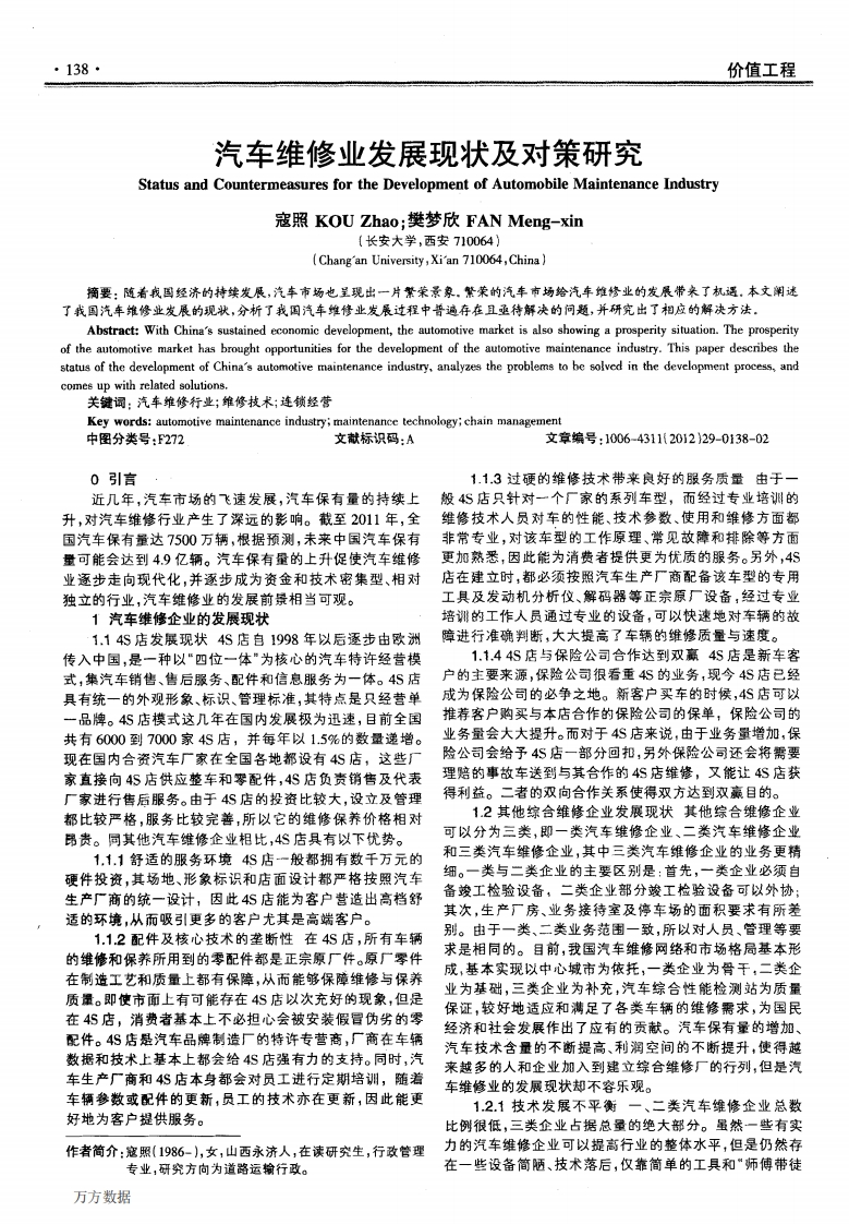138*价值工程汽车维修业发展现状及对策研究Status and Countermeasures for the Development of Automobile Maintenance Industry寇照KOU Zhao;樊梦欣FAN Meng-xin(长安大学,西安710064)Chang'an University,Xi'an 710064,China)了我国汽车维修业发展的现状,分析了我国汽车维修业发展过程中普通存在且亟待解决的问题,并研究出了相应的解决方法.Abstract:With China's sustained economic development,the automotive market is also showing a prosperity situation.The prosperityof the automotive market has brought opportunities for the development of the automotive maintenance industry.This paper describes thestatus of the development of China's automotive maintenance industry,analyzes the problems to be solved in the development process,andcomes up with related solutions.关键词:汽车维修行业;维修技术;连锁经营Key words:automotive maintenance industry;maintenance technology;chain management中图分类号:272文献标识码:A文章编号:1006-4311{201229-0138-020引言1.13过硬的维修技术带来良好的服务质量由于一近几年,汽车市场的飞速发展,汽车保有量的持续上般4S店只针对一个厂家的系列车型,而经过专业培训的升,对汽车维修行业产生了深远的影响。截至2011年,全维修技术人员对车的性能、技术参数、使用和雏修方面都国汽车保有量达7500万辆,根据预测,未来中国汽车保有非常专业,对该车型的工作原理、常见故障和排除等方面量可能会达到4.9亿辆。汽车保有量的上升促使汽车维修更加熟悉,因此能为消黄者提供更为优质的服务。另外,4S业逐步走向现代化,并逐步成为资金和技术密集型、相对店在建立时,都必须按照汽车生产厂商配备该车型的专用独立的行业,汽车维修业的发展前景相当可观。工具及发动机分析仪、解码器等正宗原厂设备,经过专业1汽车维修企业的发展现状培训的工作人员通过专业的设备,可以快速地对车辆的故1.14S店发展现状4S店自1998年以后逐步由欧洲障进行准确判断,大大提高了车辆的维修质量与速度。传入中国,是一种以“四位一体”为核心的汽车特许经营模1.1.44S店与保险公司合作达到双赢4S店是新车客式,集汽车销售、售后服务、配件和信息服务为一体。4S店户的主要来源,保险公司很看重4S的业务,现今4S店已经具有统一的外观形象、标识、管理标准,其特点是只经营单成为保险公司的必争之地。新客户买车的时候,4S店可以一品牌。4S店模式这几年在国内发展极为迅速,目前全国推荐客户购买与本店合作的保险公司的保单,保险公司的共有6000到7000家4S店,并每年以1.5%的数量递增。业务量会大大提升。而对于4S店来说,由于业务量增加,保现在国内合资汽车厂家在全国各地都设有4S店,这些厂险公司会给予4S店一部分回扣,另外保险公司还会将需要家直接向4S店供应整车和零配件,4S店负责销售及代表理赔的事故车送到与其合作的4S店维餐,又能让4S店获厂家进行售后服务。由于4S店的投资比较大,设立及管理得利益。二者的双向合作关系使得双方达到双赢目的。都比较严格,服务比较完善,所以它的维修保养价格相对1.2其他综合维修企业发展现状其他综合维修企业昂贵。同其他汽车维修企业相比,4S店具有以下优势。可以分为三类,即一类汽车维修企业、二类汽车维修企业1.1.1舒适的服务环境4S店一般都拥有数千万元的和三类汽车维修企业,其中三类汽车维修企业的业务更精硬件投资,其场地、形象标识和店面设计都严格按照汽车细。一类与二类企业的主要区别是:首先,一类企业必须自生产厂商的统一设计,因此4S店能为客户营造出高档舒备竣工检验设备,二类企业部分竣工检验设备可以外协:适的环境,从而吸引更多的客户尤其是高端客户。其次,生产厂房、业务接待室及停车场的面积要求有所差1.1.2配件及核心技术的垄断性在4S店,所有车辆别。由于一类、二类业务范围一致,所以对人员、管理等要的维修和保养所用到的零配件都是正宗原厂件。原厂零件求是相同的。目前,我国汽车维修网络和市场格局基本形在制造工艺和质量上都有保障,从而能够保障维修与保养成,基本实现以中心城市为依托,一类企业为骨干,二类企业为基础,三类企业为补充,汽车综合性能检测站为质量质量。即使市面上有可能存在4S店以次充好的现象,但是保证,较好地适应和满足了各类车辆的维修需求,为国民在4S店,消费者基本上不必担心会被安装假冒伪劣的零经济和社会发展作出了应有的贡献。汽车保有量的增加、配件。4S店是汽车品牌制造厂的特许专营商,厂商在车辆汽车技术含量的不断提高、利润空间的不断提升,使得越数据和技术上基本上都会给4S店强有力的支持。同时,汽来越多的人和企业加入到建立综合维修厂的行列,但是汽车生产厂商和4S店本身都会对员工进行定期培训,随着车维修业的发展现状却不容乐观。车辆参数或配件的更新,员工的技术亦在更新,因此能更121技术发展不平衡一、二类汽车维修企业总数好地为客户提供服务。比例很低,三类企业占据总量的绝大部分。虽然一些有实作者简介:寇照(1986-),女,山西永济人,在读研究生,行政管理力的汽车维修企业可以提高行业的整体水平,但是仍然存专业,研究方向为道路运输行政。在一些设备简陋、技术落后,仅靠简单的工具和“师傅带徒万方数据Value Engineering弟“的经验来从事汽车维修的企业,真正具有对汽车进行店,类似于4S店,总部和加盟店通过统一的店名、标