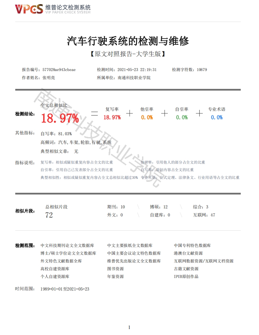 维普论文检测系统汽车行驶系统的检测与维修【原文对照报告-大学生版】报告编号:577028ae943 cbeae检测时间:2021-05-2322:19:31检测字符数:10679作者姓名:张明亮所属单位:南通科技职业学院全文总相似比复写率他引率自引率专业术语检测结论:18.97%18.97%0.0%0.0%0.0%其他指标:自写率:81.03%高频词:汽车,车架,轮胎,行驶,系统典型相似文章:无指标说明:复写率:相似或疑似重复内容占全文的比重引用他人的部分占全文的比重自引率:引用自己已发表部分占全文的比重自写率:原创内容占全文的比重典型相似性:相似或疑似重复内容占全文总相似比超过30%专业术语:公式定理、法律条文、行业用语等占全文的比重总相似片段期刊:10博硕:12综合:3相似片段:72外文:0自建库:0互联网:47检测范围:中文科技期刊论文全文数据库中文主要报纸全文数据库中国专利特色数据库博士/硕士学位论文全文数据库中国主要会议论文特色数据库港澳台文献资源外文特色文献数据全库维普优先出版论文全文数据库互联网数据资源/互联网文档资源高校自建资源库图书资源古籍文献资源个人自建资源库年鉴资源IPUB原创作品时间范围:1989-01-01至2021-05-23维普论文检测系统VIP PAPER CHECK SYSTEM原文对照颜色标注说明:■自写片段■复写片段(相似或疑似重复)引用片段(引用)■专业术语(公式定理、法律条文、行业用语等)南通科技职业学院毕业论文(设计)课程名称汽车行驶系统的故障诊断与维修专业及班级新能源3181学号18082130126姓名张明亮指导老师孔庆勇2021年4月13日汽车行驶系统故障诊断与维修摘要愈来愈多的家庭为了节省在路上的时间,一般都会选择汽车作为出行的一个主要工具,这都极大的带动了我国汽车相关产品的发展。行驶系统是汽车中一个非常重要的配件。汽车的行驶系统的主要组成零部件有车架、车轮、悬架和车轴等小零件。汽车的行车系统可以通过汽车发动机产生的动力,可以使得与地面的接触带来强大的行驶驱动力量,这种力量可以让车辆正常在路上行驶,就算遇到那种弯弯曲曲不平坦的路面,通过良好的汽车行驶系统也可以减少不同程度的驱动力量给驾驶者带来的舒适感的差异,再加上较好的配合转向系统的使用,这样可以一路保持车辆的平稳行驶。但是通过很多现实的案例分析发现,有很多人会忽视行驶系统,更想不起来去对它进行维护和保养,汽车的行驶系统是一个车是否可以安全上路的重要标志,而在汽车高速发展的今天,汽车的行驶系统也应该结合具体车型具体分析。关键词汽车行驶系统行驶系统的发展如何保障行驶系统的安全Fault Diagnosis and Maintenance of Automotive Air Conditioning SystemAbstractMore and more families in order to save time on the road,generally choose cars as a main toolto travel,which has greatly driven the development of China's automobile related products.Drivingsystem is a very important accessory in the car.The main components of the car's driving system aresmall parts such as frames,wheels,suspension,and axles.Car driving system can be through theengine,can make the contact with the ground to bring strong driving force,this force can make thevehicle normal driving on the road,even if the kind of curved uneven road,through a good cardriving system can reduce different degrees of driving force to bring driver comfort difference,coupled with the use of the steering system,so that you can keep the smooth running of the vehicleall the way.But through a lot of realistic case analysis found that there are a lot of people will2维普论文检测系统VIP PAPER CHECK SYSTEMignore the driving system,more unimaginable to its maintenance and maintenance,the car drivingsystem is an important symbol of a car can safely on the road,and in today's rapid development,thecar driving system should also be combined with specific model specific analysis.Key words Automobile driving system Development of driving system How to ensure the safety ofdriving system目录2汽车是行驶系统13车架与车桥…33.1车架的功能要求与结构…33.11车架的功能与要求…33.12车架的分类与结构…33.13车架的维修…3.14G0D车身技术简介…74车轮与轮胎……84.11车轮的功能组合与分类.…84.12车轮的结构……84.21轮胎的功用………94.22充气式轮胎的结构…94.23直接间接式胎压监测装置……105.2弹性元件0…135.3减震器…135.31概述…135.32双向作用筒式减震器…13致谢…71引言随着社会的发展与技术的进步,一方面汽车作为生活工具得到大范围普及,另一方面机械电子技术快速发展,汽车自动传动系统的不断更新成熟,也给行驶系统提出了更加严格的要求,同时也给研发新技术的汽车带来了一些促进条件。汽车的行驶系统能有今天的成熟,它也是经过很多个阶段改进与发展,它主要有自动转速的早期阶段、液压转速的早期阶段、发展到电控电气变速阶段,在前面几个阶段的基础上,再加上能够非常自如的掌控自动变速器系统,就这样行驶系统就步入了智能自动变速的高科技阶段。在经济性与环保性行驶舒适性等方面也取得不错的进展,鉴于其诸多优点,自动传送系统已经在汽车上得到广泛运用。随着互联网的普及信息技术与传统技术开始快速融合,在这种环境下汽车的传动系统逐渐由传统机械向信息化的的方向发展,对此大力发展汽车的传动系统明确汽车的发展前景,对我国的国民经济推动有着重大的意义。2汽车行驶系统汽车的传动系统按结构的不同大致可分为三类:轮式,履带式,车轮履带式。现在的汽车