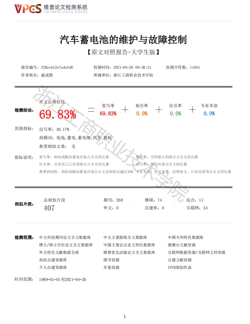 维普论文检测系统VIP PAPER CHECK SYSTEM汽车蓄电池的维护与故障控制【原文对照报告-大学生版】报告编号:f28ecb12e7 edefd6检测时间:2021-04-2609:58:21检测字符数:11564作者姓名:戚成凯所属单位:浙江工商职业技术学院全文总相似比复写率他引率自引率专业术语检测结论:69.83%69.83%0.0%0.0%0.0%其他指标:自写率:30.17%高频词:电池,蓄电,蓄电池,汽车,极板典型相似文章:无指标说明:复写率:相似或疑似重复内容占全文的比重他引率:引用他人的部分占全文的比重自引率:引用自己已发表部分占全文的比重自写率:原创内容占全文的比重典型相似性:相似或疑似重复内容占全文总相似比超过30%专业术语:公式定理、法律条文、行业用语等占全文的比重总相似片段期刊:268博硕:74综合:11相似片段:407外文:0自建库:0互联网:54检测范围:中文科技期刊论文全文数据库中文主要报纸全文数据库中国专利特色数据库博士/硕士学位论文全文数据库中国主要会议论文特色数据库港澳台文献资源外文特色文献数据全库维普优先出版论文全文数据库互联网数据资源/互联网文档资源高校自建资源库图书资源古籍文献资源个人自建资源库年鉴资源IPUB原创作品时间范围:1989-01-01至2021-04-26维普论文检测系统VIP PAPER CHECK SYSTEM原文对照颜色标注说明:■自写片段■复写片段(相似或疑似重复)口引用片段(引用)■专业术语(公式定理、法律条文、行业用语等)ZHEJIANG BUSINESS TECHNOLOGY INSTITUTE电子信息学院毕业设计(论文)汽车蓄电池的维护与故障控制专业汽车检测与维修技术班级汽修1822学生学号1601211106学生姓名戚成凯校外指导教师XXX校内指导教师叶香美二零二一年四月毕业设计(论文)诚信承诺书1.本人郑重地承诺所呈交的毕业设计(论文),是在指导教师的指导下严格按照学校和学院有关规定独立完成的。2.本人在毕业设计(论文)中引用他人的观点和参考资料均加以注释和说明。3.本人承诺在毕业设计(论文)选题和研究内容过程中没有抄袭他人研究成果和伪造相关数据等行为,符合学校查重率要求。4.在毕业毕业设计(论文)中对侵犯任何方面知识产权的行为,由本人承担相应的法律责任。毕业论文(设计)作者签名:2021年月日汽车蓄电池的维护与故障控制摘要:蓄电池是汽车上重要的零部件之一,汽车中的蓄电池是驱动汽车的主要电能来源,它为汽车的启动工作提供了电源,使得汽车的发电机停止转动,并同时供给汽车的发动,点火及灯光照明等用电,对汽车的点火启动以及行驶有着至关重要的作用。随着我国车载动力用电装置的进一步增加及完善,对于车辆蓄电池的技术要求也愈来越2维普论文检测系统VIP PAPER CHECK SYSTEM高,其性能对于汽车的性能是有着至关重要的意义。本文主要是介绍了各种新型汽车蓄电池的基础结构、工作原理及其功能特征,指出了各种新型汽车蓄电池存在的常见故障及排除措施,提出了各种新型汽车蓄电池维护的具体保养措施,使蓄电池产品发挥最佳的使用价值。关键词:蓄电池:基本原理;维护方法:故障现象:排除方法目录蓄电池的发展历程v一、蓄电池分类与功用11.1蓄电池的分类11.2蓄电池的功用2二、蓄电池的结构及基本原理32.1蓄电池的基本结构32.2蓄电池的工作原理32.2.1蓄电池电动势的产生32.2.2蓄电池放电过程的电化反应42.2.3蓄电池充电过程的电化反应42.2.4蓄电池充放电后电解液的变化42.2.5蓄电池放电充电过程5三、汽车蓄电池的维护方法73.1蓄电池外部表面的检查73.2蓄电池电解液液面高度的检查73.3蓄电池电解液密度的检查73.4蓄电池负荷电压的检查83.5蓄电池在使用及保养方面需要注意的问题8四、常见汽车蓄电池故障排除检修94.1蓄电池极板硫化94.2蓄电池漏电94.3蓄电池存电偏少94.3.1蓄电池存电偏少的主要表现9商职业技术学院4.3.2蓄电池存电偏少的主要原因104.3.3蓄电池存电偏少处理方法104.4蓄电池漏液114.5蓄电池变形11五、蓄电池故障的预防125.1日常使用要点125.2蓄电池检查12六、常见案例分析136.1案例一136.1.1故障现象136.1.2故障分析136.1.3故障排除136.2案例二146.2.1故障现象146.2.2故障分析146.2.3故障排除14七、总结16参考文献17蓄电池的发展历程3