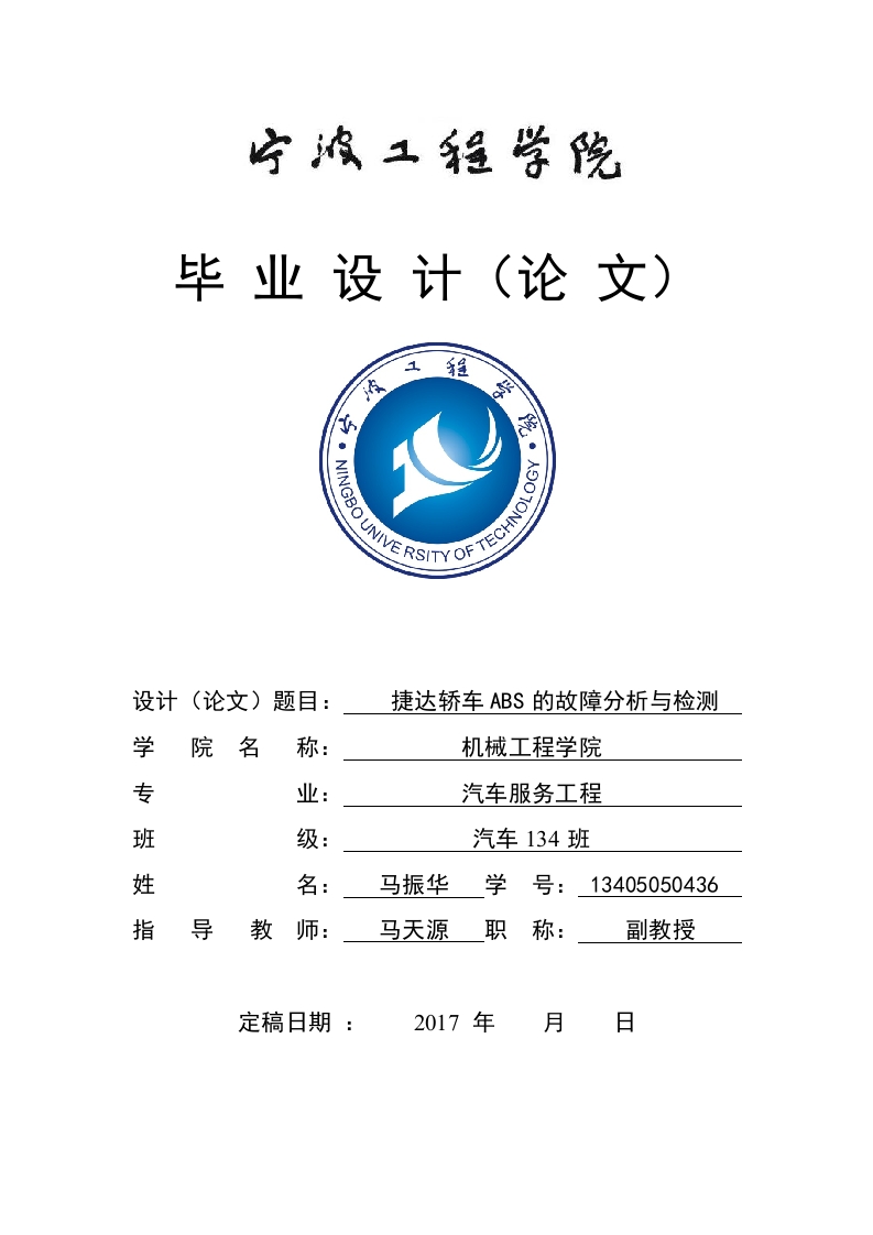 毕业设计(论文)NINGBO UNIVE RSITY OF TECHNOLOG设计(论文)题目:捷达轿车ABS的故障分析与检测学院名称:机械工程学院专业:汽车服务工程班级:汽车134班姓名:马振华学号:13405050436指导教师:马天源职称:副教授2017年月日诚信承诺我谨在此承诺:本人所写的毕业论文《捷达轿车ABS的故障分析与检测》均系本人独立完成,没有抄袭行为,凡涉及其他作者的观点和材料,均作了注释,若有不实,后果由本人承担。承诺人(签名):年月中文摘要摘要伴随交通运输业的发展,机动车安全性愈发受人注意。其中制动机能的优劣直接影响着一辆车的安全性。因为汽车的使用工况是不确定的,所以汽车的制动就要去适应各种不同的情况,要随之路面情况及时的做出改变,在这种背景下ABS就应运而生。本文以捷达轿车的ABS为研究对象,简单介绍ABS的工作原理、结构特点、工作过程,重点介绍其故障分析与检测,从设备检测、部件检测和检测案例,全面的分析ABS的各种故障的检测流程。关键词:捷达;ABS;故障;检测I