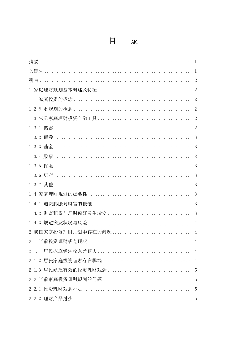 目录摘要关键词…121家庭理财规划基本概述及特征1.1家庭投资的概念1.2理财规划的概念…21.3常见家庭理财投资金融工具21.3.1储蓄231.3.3基金1.3.4股票31.3.6房产.31.3.7其他.…1.4家庭理财规划的必要性31.4.1通货膨胀对财富的侵蚀31.4.2财富积累与理财偏好发生转变1.4.3规避突发状况与风险.·2我国家庭投资理财规划中存在的问题42.1当前投资理财规划现状2.1.1居民家庭经济收入差距大...2.1.2居民家庭投资理财存在弊端....2.2当前家庭投资理财规划的问题..·2.2.2理财产品过少…52.2.3市场诚信缺失.…62.2.5不能有效地权衡风险和收益..62.2.6分散风险意识不强......2.2.7不愿请专业人士帮忙.....73解决家庭投资理财规划问题的对策73.1加强对理财的观念.·73.2提高对理财风险的认知程度3.3加强对金融体系的创新和开发...73.4完善金融的发展体系..…883.6综合评估风险承受能力,匹配相应的理财产品.....63.7加强对产品细节的了解.·83.8减低理财服务门槛,普及大众理财8694结论11中小企业财务管理问题与对策摘要:随着我国经济的持续发展,居民收入不断增加,手中积蓄也不断增长,因此,如何将这些资金有效利用以实现保值、增值,则成为家庭理财的重要内容。我国家庭理财的概念引入较晚,许多家庭的理财手段依然局限在存款储蓄方面。针对此,本文从当前家庭理财规划的现状出发,发现当前家庭对于投资理财规划的理解过于片面,思想过于保守,自身目标不明确且也不愿意相信请理财专业人士帮忙,同时还有投资市场错综复杂,诚信缺失等问题。通过对问题的分析,对症下药得出加强对理财观念,完菩金融的发展体系等意见建议,以期对提高家庭理财效率,推动社会资源优化配置提供借鉴。为我国家庭理财投资提供一些参考意义。bstract:With the continuous development of China's economy,residents'incomes continue toincrease,and the savings in their hands also continue to grow.Therefore,how to effectivelyuse these funds to achieve value preservation and appreciation has become an important partof family finance.The concept of family finance in our country was introduced late,and manyfami lies'financial management methods are still limited to deposits and savings.In view ofthis,this article starts from the current status of family financial planning,and finds thatthe current family's understanding of investment financial planning is too one-sided,thethinking is too conservative,its own goals are unclear and unwi lling to believe in askingfinancial professionals to help,and the investment market is complicated,Lack of integrityand other issues.Through the analysis of the problem,the right medicine is taken to drawopinions and suggestions on strengthening financial management concepts and improving thefinancial development system,in order to provide reference for improving the efficiency offami ly financial management and promoting the optimal al location of social resources.Providesome reference significance for China's family financial investmentKeywords:Family investment and financial management;financial planning;countermeasures;suggestions