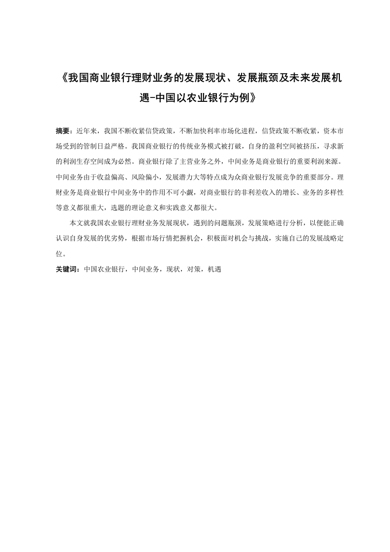《我国商业银行理财业务的发展现状、发展瓶颈及未来发展机遇-中国以农业银行为例》摘要:近年来,我国不断收紧信贷政策,不断加快利率市场化进程,信贷政策不断收紧,资本市场受到的管制日益严格。我国商业银行的传统业务模式被打破,自身的盈利空间被挤压,寻求新的利润生存空间成为必然。商业银行除了主营业务之外,中间业务是商业银行的重要利润来源。中间业务由于收益偏高、风险偏小,发展潜力大等特点成为众商业银行发展竞争的重要部分。理财业务是商业银行中间业务中的作用不可小觑,对商业银行的非利差收入的增长、业务的多样性等意义都很重大,选题的理论意义和实践意义都很大。本文就我国农业银行理财业务发展现状,遇到的问题瓶颈,发展策略进行分析,以便能正确认识自身发展的优劣势,根据市场行情把握机会,积极面对机会与挑战,实施自己的发展战略定位。关键词:中国农业银行,中间业务,现状,对策,机遇Development of Financial Management Business in CommercialBanks in China,Development Bottlenecks and FutureDevelopment Opportunities-A Case Study of Agricultural BankAbstract:In recent years,China has been tightening credit policy,speeding up the process of interestrate marketization,tightening credit policy,and increasingly strict control of capital markets.Thetraditional business model of Chinese commercial banks has been broken,their own profit space hasbeen squeezed,and it is inevitable to seek new profit living space.In addition to the main business,theintermediate business is an important source of profit for commercial banks.Due to the characteristicsof high income,low risk and high development potential,intermediary business has become animportant part of the development competition of commercial banks.Financial management business isthe role of commercial banks in the intermediary business can not be underestimated,the growth ofnon-differential income of commercial banks,business diversity and other significance are verysignificant,the theoretical and practical significance of topics are very great.This paper analyzes the current situation,problem bottleneck and development strategy of ouragricultural bank's financial management business,so as to correctly understand the advantages anddisadvantages of its own development,grasp the opportunity according to the market situation,activelyface the opportunities and challenges,and implement its own development strategy orientation.Key words:Agricultural Bank of China,intermediate business,current situation,countermeasures,opportunities目录1.1我国商业银行理财业务发展问题的研究背景和研究意义11.1.1我国商业银行理财业务发展问题的研究背景.…11.1.2我国商业银行理财业务发展问题的研究意义11.2文献综述…1.2.1国内研究.…21.2.2国外研究…21.3论文研究方法和内容31.3.1研究方法.31.3.2研究内容.3第2章我国商业银行理财业务的发展现状…42.1理财业务发展势头强劲42.2理财产品种类逐渐增加..42.3理财业务发展条件更加成熟…第3章我国商业银行理财业务存在的问题和遇到的瓶颈.63.1理财产品的风险管理滞后.63.2理财人员知识结构不健全,专业的理财规划师严重缺乏63.3理财产品营销不规范,产品透明度不高…3.4商业银行理财业务缺乏自主创新能力.73.5对公众理财知识的宣传教育力度不够.….83.6理财业务售后服务不到位.8第4章解决我国商业银行理财业务问题的解决对策.…94.1尽快实现零售业务转型…4.2强化以客户为中心的的经营理念…94.3加强产品差异化程度,加大理财产品的创新力度104.4加强业务风险管理…104.5引进高级人才,强化服务理念…11第5章我国商业银行理财业务未来发展机遇…5.1金融不断创新…5.2金融市场不断完善.…5.3利率市场化…13第6章总结….14参考文献:15致谢…