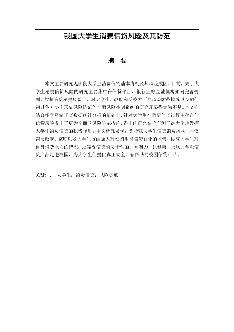 我国大学生消费信贷风险及其防范摘要本文主要研究现阶段大学生消费信贷基本情况及其风险成因。目前,关于大学生消费信贷风险的研究主要集中在信贷平台、银行业等金融机构如何完善机制、控制信贷消费风险上,对大学生、政府和学校方面的风险防范措施以及如何通过各方协作形成风险防范的全面风险控制系统的研究还显得尤为不足。本文在结合相关网站调查数据统计分析的基础上,针对大学生在消费信贷过程中存在的信贷风险提出了更为全面的风险防范措施,得出的研究结论有利于最大化地发挥大学生消费信贷的积极作用。本文研究发现,要防范大学生信贷消费风险,不仅需要政府、家庭以及大学生方面加大对校园消费信贷行业的监管、提高大学生对自身消费能力的把控,还需要信贷消费平台的共同努力,让健康、正规的金融信贷产品走进校园,为大学生们提供真正安全、有帮助的校园信贷产品。关键词:大学生:消费信贷:风险防范目录摘要I目录一、绪论-1--1(二)研究意义-1二、大学生消费信贷风险研究现状(一)大学生消费信贷风险的现状与成因研究(二)大学生消费信贷的防范措施研究-3三、大学生信贷消费基本情况及其风险成因分析(一)统计数据来源与调查内容介绍(二)大学生进行信贷消费的原因5(三)大学生信贷消费的方式-6(四)大学生在信贷消费过程中存在的风险分析-8四、大学生消费信贷风险的防范措施12(一)全面风险管理理论13(二)直接风险防范措施13(三)间接风险防范措施16五、研究结论20参考文献-21