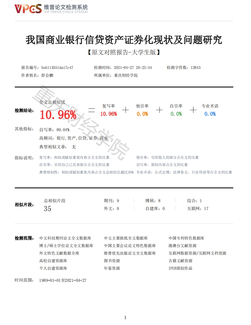 维普论文检测系统/IP PAPER CHECK SYSTEM我国商业银行信贷资产证券化现状及问题研究【原文对照报告-大学生版】报告编号:5eb113551da17c47检测时间:2021-04-2720:23:54检测字符数:12843作者姓名:舒会鹏所属单位:重庆财经学院全文总相似比复写率他引率自引率专业术语检测结论:10.96%10.96%0.0%0.0%0.0%其他指标:自写率:89.04%高频词:银行,资产,信贷,证券,商业典型相似文章:无指标说明:复写率:相似或疑似重复内容占全文的比重他引率:引用他人的部分占全文的比重自引率:引用自己已发表部分占全文的比重自写率:原创内容占全文的比重典型相似性:相似或疑似重复内容占全文总相似比超过30%专业术语:公式定理、法律条文、行业用语等占全文的比重总相似片段期刊:9博硕:8综合:1相似片段:35外文:0自建库:0互联网:17检测范围:中文科技期刊论文全文数据库中文主要报纸全文数据库中国专利特色数据库博士/硕士学位论文全文数据库中国主要会议论文特色数据库港澳台文献资源外文特色文献数据全库维普优先出版论文全文数据库互联网数据资源/互联网文档资源高校自建资源库图书资源古籍文献资源个人自建资源库年鉴资源IPUB原创作品时间范围:1989-01-01至2021-04-27维普论文检测系统VIP PAPER CHECK SYSTEM原文对照颜色标注说明:■自写片段■复写片段(相似或疑似重复)口引用片段(引用)■专业术语(公式定理、法律条文、行业用语等)毕业论文题目:我国商业银行信贷资产证券化发展现状及问题研究学院:金融学院年级:2017级专业:金融学(CFA)学生姓名:舒会鹏学号:201711442指导教师:谢灵斌职称:副教授日期:2021年3月28日目录摘要3一、商业银行信贷资产证券化概述4(一)商业银行信贷资产证券化概念4(二)我国商业银行实施信贷资产证券化的意义4(三)商业银行信贷资产证券化基本原理5二、我国商业银行信贷资产证券化发展现状6(一)商业银行长期占据信贷ABS市场的主导地位6(二)我国商业银行信贷资产证券化正处于快速发展期9(三)信贷ABS产品持有结构保持稳定9(四)主流银行参加日趋活跃,地方性银行数量逐年有所新增11三、我国商业银行信贷资产证券化存在的问题12(一)我国商业银行自身内部存在缺陷12(二)面临外部经济环境和市场的挑战12(三)资本市场建设不完善,投资群体范围狭窄122维普论文检测系统VIP PAPER CHECK SYSTEM(四)信用评级标准不够完善,缺乏权威信用评级机构13(五)我国商业银行信贷资产证券化的会计制度与税务制度不完善13(六)缺乏市场监管和健全的法律体系13(七)我国商业银行信贷资产证券化存在信用风险问题14四、推进商业银行信贷资产证券化的措施建议15(一)提高商业银行自身竞争力15(二)营造良好的金融市场和宏观经济环境15(三)拓展发行市场,拓宽投资者群体15(四)完善信用评级制度,建立权威信用评级机构16(五)调整相关会计制度和税收政策16(六)完善相关金融制度和法律法规16(七)要积极探索多种信用提升和增级模式17参考文献18C我国商业银行信贷资产证券化发展现状及问题研究201711442舒会鹏行政班17CFA指导教师谢灵斌摘要:2012年信贷资产证券化交易业务正式开始重启以来,中国的许多商业银行都积极参与开展,通过信贷资产证券化这一交易方式来积极地盘活了我国的一些企业贷款。但是因为当前中国的商业银行信贷资产证券化交易业务尚且正在初始时期,时间较晚,发展周期相对较短,发展不够成熟,风险较大。与此同时,在现如今中国商业银行在开展该项业务时,仍然存在着许多地方亟待加以完善和改进,为了深入探索分析我国商业银行开展的信贷资产证券化业务的真正实际成效和意义,以及找出该项业务的具体内容所存在的一些问题,本文就此展开相关的研究。叙述我国商业银行信贷资产证券化的现状和存在的问题,继而提出相应的建议。关键词:商业银行:信贷资产证券化:风险ABSTRACT:Since the formal restart of credit asset securitization business in 2012,manycommercial banks in China have actively participated in the development of credit assetsecuritization,which has actively invigorated some enterprise loans in China.But at present,thecredit asset securitization business of China's commercial banks is still in the initial stage,withrelatively late time,relatively short development cycle,immature development and high risk.At thesame time,in today's China's commercial banks in developing the business,there are still manyplaces to be improved.In order to deeply explore and analyze the real actual effect andsignificance of the credit asset securitization business carried out by China's commercial banks,and find out some problems existing in the specific content of the business,this paper carries outrelevant research.This paper describes the current situation and existing problems of credit assetsecuritization of commercial banks in China,and then puts forward corresponding suggestions.Key words:Commercial banks;Securitization of credit assets;risk随着近几年我国市场经济的迅猛发展和社会主义经济发展模式的逐渐转变,信贷资产证券化已经逐渐地成为了当今我国社会主义现代市场经济的生活过程中的一种普遍现象。但与其他的国外的一些国家及甚至是我们相临近的一些国家进行比较,我国商业银行资产证券化的发展有些止步不前。所以,描述自重启以来的发展过程经历,近年来的变化以及现实状况是很有必要的。找出发展中存在的阻碍商业银行信贷资产证券化发展的问题并提出政策建议,有利于商业