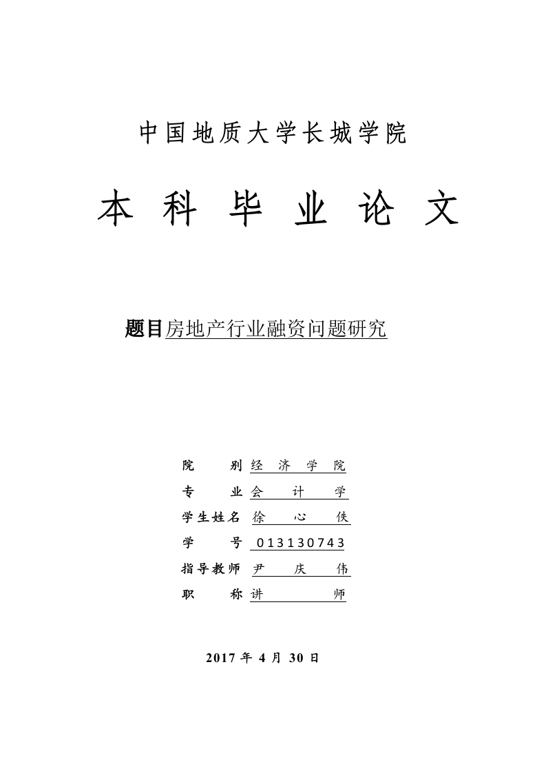 中国地质大学长城学院本科毕业论文题目房地产行业融资问题研究院别经济学院专业会计学学生姓名徐心学号013130743指导教师尹庆职称讲师2017年4月30日摘要对于我国的经济发展来说,房地产作为重要的发展项目,已经在我国的市场经济发展中占据一定的重要地位。房地产的发展大力促进了我国社会经济的发展。我国房地产的特点是必须有大量的资金作为发展的支持,这就说明房地产是属于资金密集型的企业。所以,对于房地产行业的可持续性发展的前提就是扩大融资的渠道,这是迅速发展房地产行业的基础,也是最主要的一个工作。但是,作为房地产企业的经营者,不能盲目的使用融资方法,必须前提是考虑这种融资的方式是不是适合本身的产业发展。结合集资企业的好处和坏处,合理选择适合自身房地产行业发展的集资手段。现在,我国的房地产行业存在一定的风险,我国的市场经济迅猛发展,各行各业都开始有了很大的发展途径,竞争越来越激烈。所以,房地产行业风险逐渐增加,现在,个别地方的房价上涨的非常快,这样导致房地产有了很大的开发规模和投资金额。针对这种情况,我国开始出台相关政策来有效的对房地产开发进行监督,所以,现在最主要的就是怎么扩大融资的渠道,这是对房地产开发最重要的事情。关键词:房地产企业;企业融资:创新融资ABSTRACTThe real estate industry is one of pillar industries in our country,and its healthy development ofour country plays an important role in the development of national economy.And the real estateindustry is a capital-intensive industry,thus effectively solve the financing problem is one of theimportant conditions to promote its healthy development.Real estate enterprises solve thefinancing problem,must consider the cost of the various financing channels and the advantagesand disadvantages,combining with the status of the enterprise's external capital markets,according to the national financial policy,bank reform direction,the system of issuing stocks,corporate bonds,etc.,choose the most suitable for enterprise's financing channels.With thehigh-speed development of economy in recent years,real estate investment appeared signs ofoverheating,the risk of real estate industry began to increase,including increased financial risk,local commercial housing price increases quickly,real estate development scale,the fastinvestment growth of all development.Therefore,countries also began to strengthen thespecification of the real estate industry,especially the supervision and management of real estatefinance.Under the new policy,the situation,the real estate enterprises should be how to carry outthe enterprise financing activities,is now the most urgent problem for real estate.Key words:Real estate enterprise;Corporate finance;Innovative financing