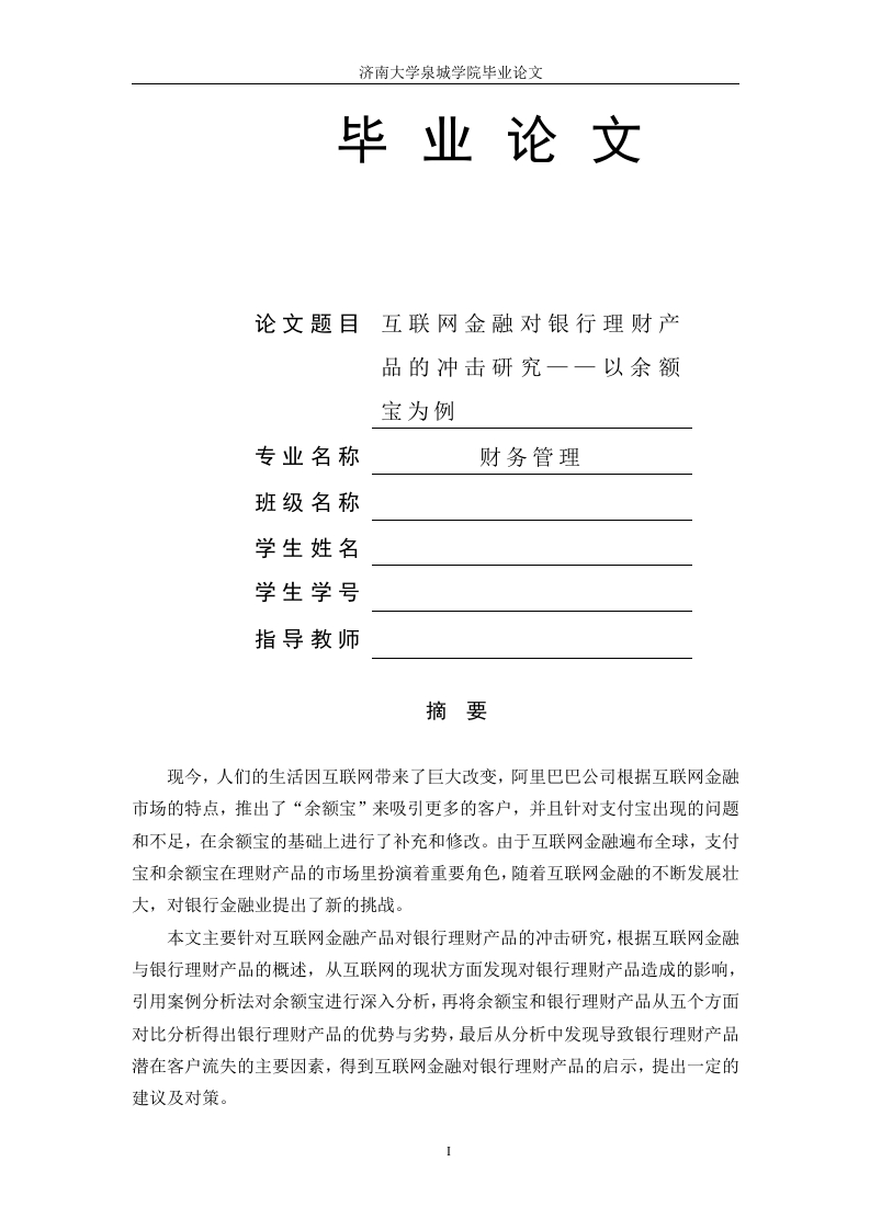 济南大学泉城学院毕业论文毕业论文论文题目互联网金融对银行理财产品的冲击研究一一以余额宝为例专业名称财务管理班级名称学生姓名学生学号指导教师摘要现今,人们的生活因互联网带来了巨大改变,阿里巴巴公司根据互联网金融市场的特点,推出了“余额宝”来吸引更多的客户,并且针对支付宝出现的问题和不足,在余额宝的基础上进行了补充和修改。由于互联网金融遍布全球,支付宝和余额宝在理财产品的市场里扮演着重要角色,随着互联网金融的不断发展壮大,对银行金融业提出了新的挑战。本文主要针对互联网金融产品对银行理财产品的冲击研究,根据互联网金融与银行理财产品的概述,从互联网的现状方面发现对银行理财产品造成的影响,引用案例分析法对余额宝进行深入分析,再将余额宝和银行理财产品从五个方面对比分析得出银行理财产品的优势与劣势,最后从分析中发现导致银行理财产品潜在客户流失的主要因素,得到互联网金融对银行理财产品的启示,提出一定的建议及对策。关键词:互联网金融;余额宝;银行理财产品;冲击ABSTRACTNowadays,people's life because of the Internet has brought the huge change,alibaba company according to the characteristics of the Internet financial market,launched the "balance"to attract more customers,and to pay treasure to the problemsand shortcomings,on the basis of the balance of treasure the complement andmodification.Because of the Internet financial all over the world,pay treasure totreasure and balance plays an important role in the financial product market,alongwith the continuous development of the Internet financial,puts forward a newchallenge for banking sector.This paper focuses on the impact of the Internet financial products of bankfinancing products research,according to the overview of the Internet financial andbanking financial products,from the aspects of the status quo of the Internet foundthat the effects on the bank financial products,reference case analysis method toanalyse the balance of Po,and the balance Po and bank financial products from fiveaspects that the bank finance product advantages and disadvantages,from the analysisof the final result in bank financial products the main factors of potential customerchurn,finance for Internet bank financial products enlightenment,put forward someSuggestions and countermeasures.Key words:Internet finance;Yu 'E Bao;Bank financial products;impact