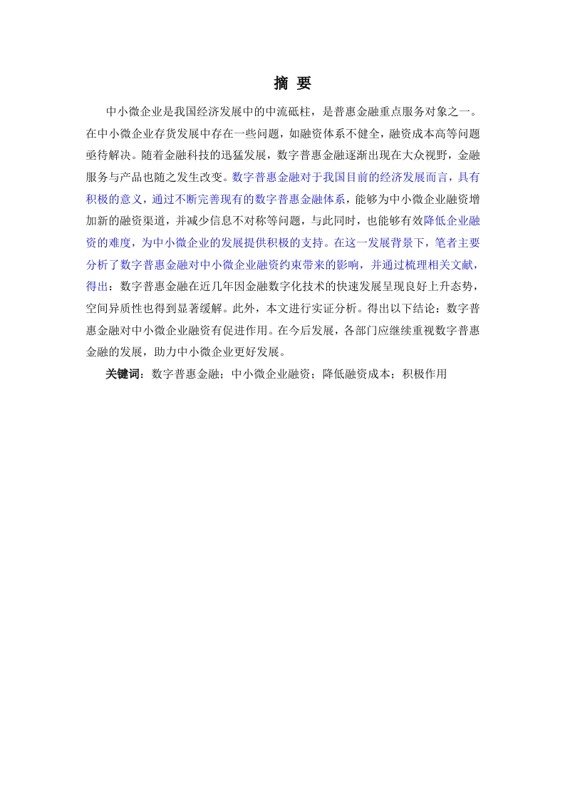 摘要中小微企业是我国经济发展中的中流砥柱,是普惠金融重点服务对象之一。在中小微企业存货发展中存在一些问题,如融资体系不健全,融资成本高等问题亟待解决。随着金融科技的迅猛发展,数字普惠金融逐渐出现在大众视野,金融服务与产品也随之发生改变。数字普惠金融对于我国目前的经济发展而言,具有积极的意义,通过不断完善现有的数字普惠金融体系,能够为中小微企业融资增加新的融资渠道,并减少信息不对称等问题,与此同时,也能够有效降低企业融资的难度,为中小微企业的发展提供积极的支持。在这一发展背景下,笔者主要分析了数字普惠金融对中小微企业融资约束带来的影响,并通过梳理相关文献,得出:数字普惠金融在近几年因金融数字化技术的快速发展呈现良好上升态势,空间异质性也得到显著缓解。此外,本文进行实证分析。得出以下结论:数字普惠金融对中小微企业融资有促进作用。在今后发展,各部门应继续重视数字普惠金融的发展,助力中小微企业更好发展。关键词:数字普惠金融:中小微企业融资;降低融资成本:积极作用The impact of digital inclusive finance on the financingconstraints of micro enterprisesAbstract:Micro enterprises are the mainstay of China's economic development andone of the key service objects of inclusive finance.There are some problems in theinventory development of small and micro enterprises,such as imperfect financingsystem and high financing cost.With the rapid development of financial technology,digital inclusive finance has gradually emerged in the public view,and financialservices and products have changed accordingly.In the current increasingly fierceeconomic competition,China accelerates the pace of the development of digitalinclusive finance,promotes the improvement of the digital inclusive finance system,adds new financing channels for the financing of small and micro enterprises,reducesinformation asymmetry and other problems,reduces financing costs,and improves thesurvival rate of small and micro enterprises.For the study of inclusive financialinfluence on micro,small and medium enterprises financing constraints,based on thereference tidy now inclusive financial development,and on the basis of micro,smalland medium enterprises financing literature,found that digital inclusive financialfinancial digital technology's rapid development in recent years due to rising goodposture,spatial heterogeneity has been significantly reduced.In addition,this papercarries out empirical analysis.The following conclusions are drawn:Digital inclusivefinance can promote the financing of small,medium and micro enterprises.In thefuture,all departments should continue to pay attention to the development of digitalinclusive finance to help the better development of small,medium and microenterprises.Key words:Digital Inclusive Finance;Inclusive finance;reduce financing costs;positive role目录一、前言5(一)研究背景与研究意义51、研究背景2、研究意义5(二)普惠金融及数字普惠金融的概念界定51、普惠金融定义…52、数字普惠金融定义6(三)文献综述7二、数字普惠金融体系对中小微企业融资约束影响的分析…8(一)数字普惠金融现状分析及趋势发展…8】、数字普惠金融现状分析.82、数字普惠金融趋势发展.(二)中小微企业融资约束现状分析及趋势发展1、中小微企业融资约束现状分析…2、中小微企业融资趋势发展11三、数字普惠金融对中小微企业融资约束影响的实证分析…(一)样本选取与数据来源…(二)模型设计与变量说明.121、研究假设…2、模型构建13(三)数字普惠金融对中小微企业融资约束影响的分析1、描述性统计2、基准回归…43、回归结果及分析16(四)实证结论17四、总结与启示门(一)国际方面加强数字普惠金融推广交流17(二)因内方面将传统普惠金融及数字普惠金融优势互补、完善监管体系17