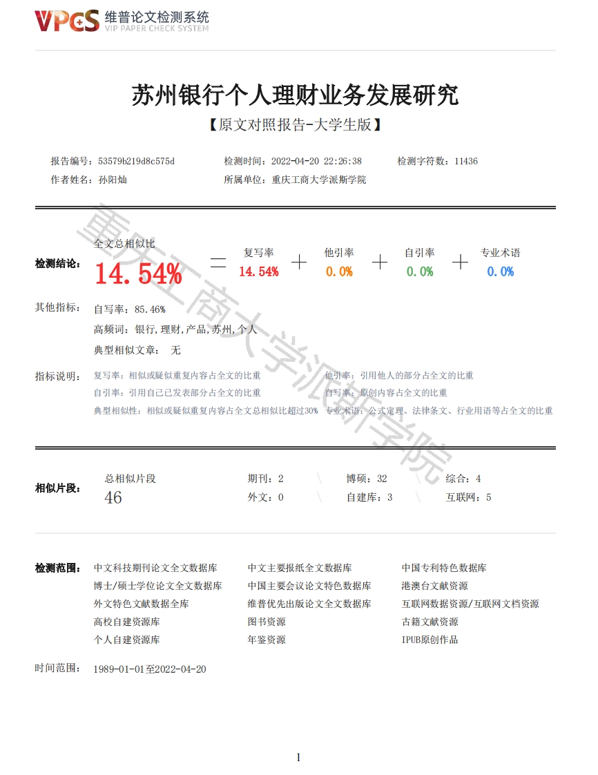 维普论文检测系统VIP PAPER CHECK SYSTEM苏州银行个人理财业务发展研究【原文对照报告-大学生版】报告编号:53579b219d8c575d检测时间:2022-04-2022:26:38检测字符数:11436作者姓名:孙阳灿所属单位:重庆工商大学派斯学院全文总相似比复写率他引率自引率专业术语检测结论:14.54%14.54%0.0%0.0%0.0%其他指标:自写率:85.46%高频词:银行,理财,产品,苏州,个人典型相似文章:无指标说明:复写率:相似或疑似重复内容占全文的比重他引率:用他人的部分占全文的比重自引率:引用自己已发表部分占全文的比重自写率:原创内容占全文的此重典型相似性:相似或疑似重复内容占全文总相似比超过30%专业术语:公式定理、法律条文、行业用语等占全文的比重总相似片段期刊:2博硕:32综合:4相似片段:46外文:0自建库:3互联网:5检测范围:中文科技期刊论文全文数据库中文主要报纸全文数据库中国专利特色数据库博士/硕士学位论文全文数据库中国主要会议论文特色数据库港澳台文献资源外文特色文献数据全库维普优先出版论文全文数据库互联网数据资源/互联网文档资源高校自建资源库图书资源古籍文献资源个人自建资源库年鉴资源IPUB原创作品时间范围:1989-01-01至2022-04-20维普论文检测系统VIP PAPER CHECK SYSTEM原文对照颜色标注说明:■自写片段■复写片段(相似或疑似重复)口引用片段(引用)■专业术语(公式定理、法律条文、行业用语等)重庆工商大学派斯学院毕业论文题目苏州银行个人理财业务发展研究学院金融学院专业年级2018级金融学2班学生姓名孙阳灿学号2018303054指导教师刘萌职称讲师日期2022年4月25日目录大学派关键词·······Abstract.Key Words·····一、苏州银行个人理财业务发展现状··1.苏州银行简介············2.苏州银行个人理财业务概述····3.自营类个人理财产品··········4.代销类个人理财产品·········二、苏州银行个人理财业务发展存在的问题··1.产品缺乏创新力,存在同质化··········2.营销手段落后,客户体验不佳·······3.缺乏专业的个人理财业务人员、产品开发人员···三、苏州银行个人理财业务发展建议···········2维普论文检测系统VIP PAPER CHECK SYSTEM92.完善营销策略·········3.培养专业人才,引进投研人才・・・・四、结语···········11苏州银行个人理财业务发展研究重庆工商大学派斯学院2018级金融学2班孙阳灿指导教师:刘萌摘要:随着我国居民收入水平的不断提高,居民对金融服务的需求也在不断提升,人们也逐渐开始思考如何将多余的钱通过投资加以保值和增值,于是开始关注个人理财产品,个人理财业务也日益成为商业银行新的盈利增长点,为广大投资者提供多元化理财产品。2018年4月27日,中国人民银行等有关部门出台了《关于规范金融机构资产管理业务的指导意见》(简称“资管新规”),对国内商业银行的个人理财业务发展作出了新指示、新要求。在当前这种机遇与挑战并存的背景下,商业银行个人理财业务进入了一个全新的转型发展期。本文从苏州银行个人理财业务的发展现状入手,发现其个人理财业务存在产品缺乏创新力、存在同质化,营销手段落后、客户体验不佳,缺乏专业个人理财业务人员和产品开发人员等问题,并针对相关问题提出了相应的优化方案,包括加大产品创新力度、完善营销策略、培养和引进专业人才,以助力苏州银行个人理财业务长远发展,并为我国其他同类城市商业银行个人理财业务的发展提供参考。关键词:个人理财业务:理财产品:苏州银行Abstract:With the continuous improvement of China's residents'income level,the residents'demand for financial services is also increasing.People gradually began to think about how topreserve and increase the value of excess money through investment,so they began to pay attentionto personal financial products.Personal financial business has increasingly become a new profitgrowth point of commercial banks and provide diversified financial products for investors.On April27,2018,the people's Bank of China and other relevant departments issued the guidance onregulating the asset management business of financial institutions (hereinafter referred to as the"new asset management regulations),which made new instructions and requirements for thedevelopment of personal financial management business of domestic commercial banks.Under thebackground of both opportunities and challenges,the personal financial management business ofcommercial banks has entered a new period of transformation and development.Starting from thedevelopment status of Bank of Suzhou's personal finance business,this paper finds that its personalfinance business has some problems,such as lack of innovation,homogenization,backward marketingmeans,poor customer experience,lack of professional personal finance business personnel andproduct developers,and puts forward corresponding optimization schemes for relevant problems,including increasing product innovation,improving marketing strategies,cultivating and introducingprofessionals,In order to help the long-term development of personal finance business of Bank ofSuzhou,and provide reference for the development of personal finance business of commercial banks inother similar cities in China.Key Words:Personal financial services;Financial products;Bank of Suzhou引言随着我国经济实力的增强,居民的个人财富持续增加以及个人可配置资产的迅速积累,人们对金融服务的需求也随之提升。2004年9月,中国银监会批准商业银行发售人民币理财产品