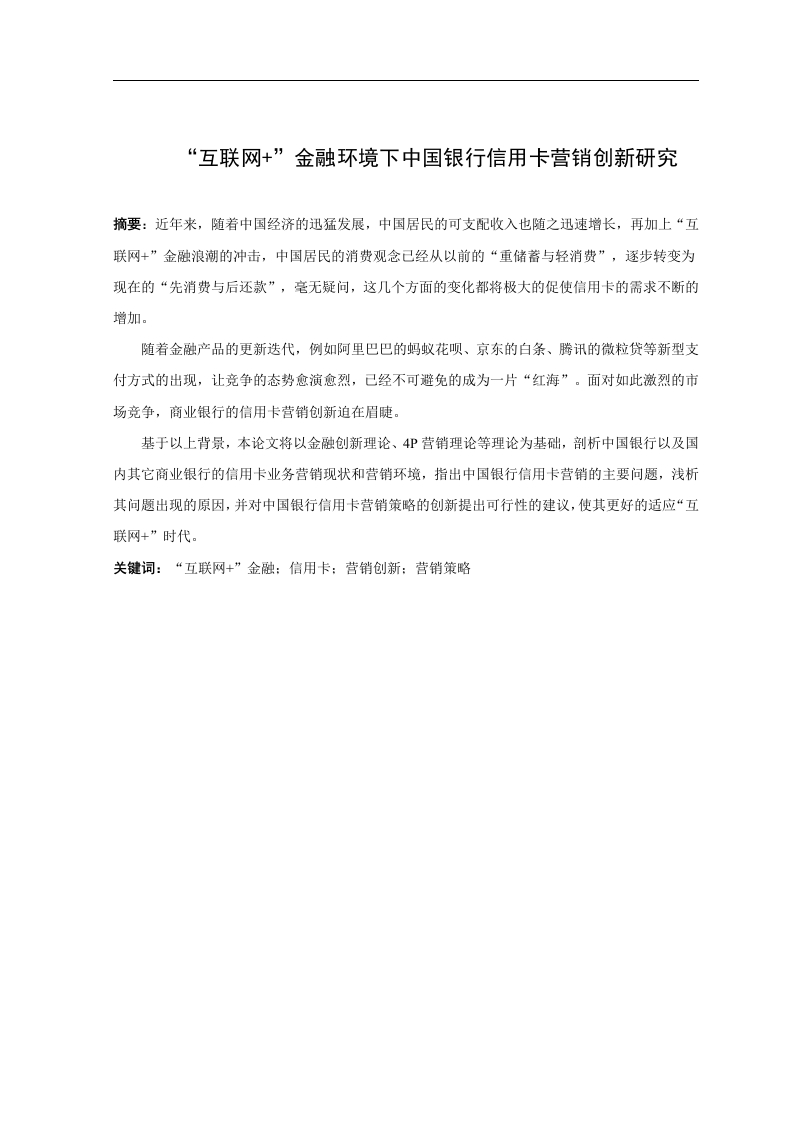 “互联网+”金融环境下中国银行信用卡营销创新研究摘要:近年来,随着中国经济的迅猛发展,中国居民的可支配收入也随之迅速增长,再加上“互联网+”金融浪潮的冲击,中国居民的消费观念己经从以前的“重储蓄与轻消费”,逐步转变为现在的“先消费与后还款”,毫无疑问,这几个方面的变化都将极大的促使信用卡的需求不断的增加。随着金融产品的更新迭代,例如阿里巴巴的妈蚁花呗、京东的白条、腾讯的微粒贷等新型支付方式的出现,让竞争的态势愈演愈烈,己经不可避免的成为一片“红海”。面对如此激烈的市场竞争,商业银行的信用卡营销创新迫在眉睫。基于以上背景,本论文将以金融创新理论、4P营销理论等理论为基础,剖析中国银行以及国内其它商业银行的信用卡业务营销现状和营销环境,指出中国银行信用卡营销的主要问题,浅析其问题出现的原因,并对中国银行信用卡营销策略的创新提出可行性的建议,使其更好的适应“互联网+”时代。关键词:“互联网+”金融:信用卡:营销创新:营销策略Research on credit card marketing innovation of bank ofChina under "Internet plus"financial environmentAbstract:In recent years,with the rapid development of the Chinese economy,the disposable incomeof Chinese residents has also increased rapidly.Coupled with the impact of the "Internet plus"financialwave,the consumption concept of Chinese residents has changed from the previous "Consumption"hasgradually changed into the current "consumption first and repayment later".There is no doubt that thesechanges will greatly promote the continuous increase in the demand for credit cards.With the updated iteration of financial products,such as the emergence of new payment methodsAlibaba ants spend chant,Jingdong IOUs,Tencent particles loans,so that the competitive situationintensified,the inevitable has become a "Red Sea."In the face of such fierce market competition,commercial bank credit card marketing innovation is imminent.Based on the above background,this paper will be of financial innovation theory,theory of 4Pmarketing theory,the paper analyzes the Bank of China and other domestic commercial bank's creditcard business marketing status and marketing environment,the Bank of China pointed out that the mainproblem of credit card marketing,analysis of the causes of its problems,It also made feasiblesuggestions on the innovation of the Bank of China's credit card marketing strategy to adapt it to the"Internet"era.Keywords:"Internet plus"Finance:Credit Cards:Marketing Innovation:Marketing Strategies目录第1章绪论…11.1研究背景和意义…11.1本论文的背景分析.11.1.2本论文的研究意义1.2.1国内研究.21.2.2国外研究…21.3课题研究方法和内容…1.3.1研究方法.31.3.2研究的基本内容与拟解决的主要问题.…第2章理论基础.52.1金融创新理论52.24P营销理论.2.3PEST分析法…第3章中国银行信用卡的营销现状…63.1国内商业银行的信用卡业务营销现状63.2国内商业银行信用卡营销环境分析.93.2.1政治环境分析93.2.2经济环境分析…3.2.3社会环境分析.123.2.4技术环境分析.…3.3中国银行营销现状15第4章中国银行信用卡营销问题及原因分析…184.1中国银行信用卡营销主要问题…184.2中国银行信用卡营销问题分析..184.2.1产品创新不足,同质化严重…184.2.2营销渠道渐较为单一、效率低下,线上线下融合度有待提升.184.2.3促销方式吸引力不足,营销活动少19第5章中国银行信用卡营销创新策略.205.1创新信用卡产品,产品个性化设计.…5.2创新营销渠道,线上线下相融合2053创新促销方式,提高社会认可度…参考文献:.2324