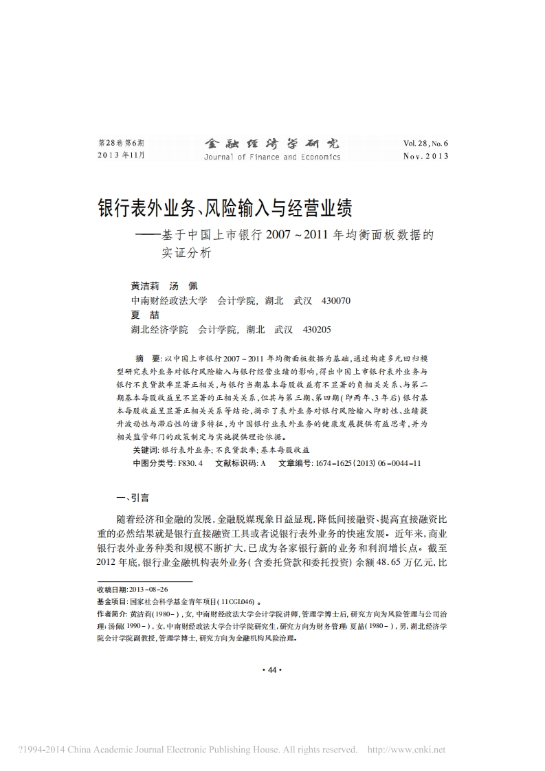 第28卷第6期Vol.28,No.62013年11月Journal of Finance and Economics银行表外业务、风险输入与经营业绩一基于中国上市银行2007~2011年均衡面板数据的实证分析黄洁莉汤佩中南财经政法大学会计学院,湖北武汉430070夏喆湖北经济学院会计学院,湖北武汉430205摘要:以中国上市银行2007~2011年均衡面板数据为基础,通过构建多元回归模型研究表外业务对银行风险输入与银行经营业绩的影响,得出中国上市银行表外业务与银行不良货款率显著正相关,与银行当期基本每股收益有不显著的负相关关系、与第二期基本每股收益呈不显著的正相关关系,但其与第三期、第四期(即两年、,3年后)银行基本每股收益呈显著正相美关系等结论,揭示了表外业务对银行风险输入即时性、业绩提升波动性与滞后性的诸多特征,为中国银行业表外业务的健康发辰提供有蓝思考,并为相关监管部门的政策制定与实施提供理论依据。关键词:银行表外业务:不良货款率:基本每股收蓝中图分类号:F830.4文献标识码:A文章编号:1674-1625(2013)06-0044-11一、引言随着经济和金融的发展,金融脱媒现象日益显现,降低间接融资、提高直接融资比重的必然结果就是银行直接融资工具或者说银行表外业务的快速发展。近年来,商业银行表外业务种类和规模不断扩大,已成为各家银行新的业务和利润增长点。截至2012年底,银行业金融机构表外业务(含委托贷款和委托投资)余额48.65万亿元,比收稿日期:2013-08-26基金项目:国家社会科学基金青年项目(11CGD4)。作者简介:黄洁莉(1980-),女,中南财经政法大学会计学院讲师,管理学博士后,研究方向为风险管理与公司治理:汤佩(1990-),女,中南财经政法大学会计学院研究生,研究方向为财务管理:夏苗(1980-),男,湖北经济学院会计学院副教授,管理学博士,研究方向为金融机构风险治理。?1994-2014 China Academic Journal Electronic Publishing House.All rights reserved.http://www.cnki.net银行表外业务、风险输入与经营业绩年初增加8万亿元,增长率达19.68%:表外资产相当于表内总资产的36.41%①。相较于银行表外业务的创新步伐,表外业务监管却相对滞后,由于缺乏风险对冲机制和有效“防火墙”,极易引致表外风险向表内传导,产生银行输入型风险,从而引发不同程度的金融风险。基于此,2013年两会的政府工作报告中特别提出应“引导金融机构稳健经营,加强对局部和区域性风险以及金融机构表外业务风险的监管,提高金融支持经济发展的可持续性”②。金融机构和监管部门如何在金融持续创新中正视“表外业务风险”,未雨绸缪,加强监管和防范,不断发挥其在支持实体经济发展中的正能量,已成为一个迫在眉睫的问题。本文以中国上市银行为样本,以银行表外业务与其风险后果、经营业绩的相关关系为研究对象,为真实揭示中国上市银行表外业务发展现状及其对表内项目的影响提供理论依据,也为中国银行业风险(尤其是输入型金融风险)的防范、金融市场的稳定健康发展提供有益素材。二、文献回顾与研究假设根据2000年中国人民银行发布的《商业银行表外业务风险管理指引》(银发P000]344号)规定,银行表外业务(Of-Balance Sheet business)是指商业银行所从事的,按照现行的会计准则不记入资产负债表内,不形成现实资产负债,但能改变损益的业务。具体包括担保类、承诺类和金融衍生交易类三种类型的业务。以表外业务为表征的银行多元化经营究竞是降低了银行自身风险还是引入了新的风险因素?表外业务是否给银行带来相关经营业绩提升?针对这些问题,国内外学者进行了许多有益的研究并取得一定成果,但尚未达成共识。(一)银行表外业务与银行风险的关系有学者认为,随着商业银行业务的不断创新,其表外业务日益膨胀,给银行带来巨大利润的同时也带来了巨大风险。Angbazo山1997)认为,表外业务增大了银行的利率风险和流动性风险敞口,银行的违约风险和利率风险也随之升高。黄隽和章艳红(2010)日对美国商业银行风险所进行的实证研究表明,非利息收入占比对银行稳定程度在统计上具有显著性的负面影响。陈德胜等(2006)指出中国银行业落后的风险管理体上制约了表外业务的发展,且表外业务与银行的风险敞口呈正相关关系。然而,也有学者提出不同意见。如宋婷婷和杜春雷(2011)4指出,目前国内商业银行表内、表外业务的相对比例变化对银行风险的彭响尚不显著。一个可能的解释是:由于国内银行表外信贷承诺仍是表外业务的绝对主体,适用统一的表内外信用风险管理体系。同时,国内衍生产品的广度和深度有限,有关金融创新工具的开发尚不充分,因此,与跨业经营相关的“影子银行”并未显著成形,从而避免了有关风险的表外回流。n367986330.shtml.?1994-2014 China Academic Journal Electronic Publishing House.All rights reserved.http://www.cnki.net面对上述不同观点,为研究中国银行表外业务是否给银行带来相应风险输人,本文提出如下假设:假设1:银行表外业务给银行带来了风险输入,即表外业务规模越大,银行风险越大。(二)银行表外业务与银行经营业绩的关系一般而言,在信息不对称的情况下,通常认为表外业务数量与银行未来短期的盈利呈正向关系。Khambata and Bagdi(2003)月在对日本20家银行所进行的研究结果表明,公司的规模越大,表外业务的发展程度越高,公司的盈利水平也相应的越高。Casu et al.(2005)9发现,在20世纪90年代,银行业的非传统收人