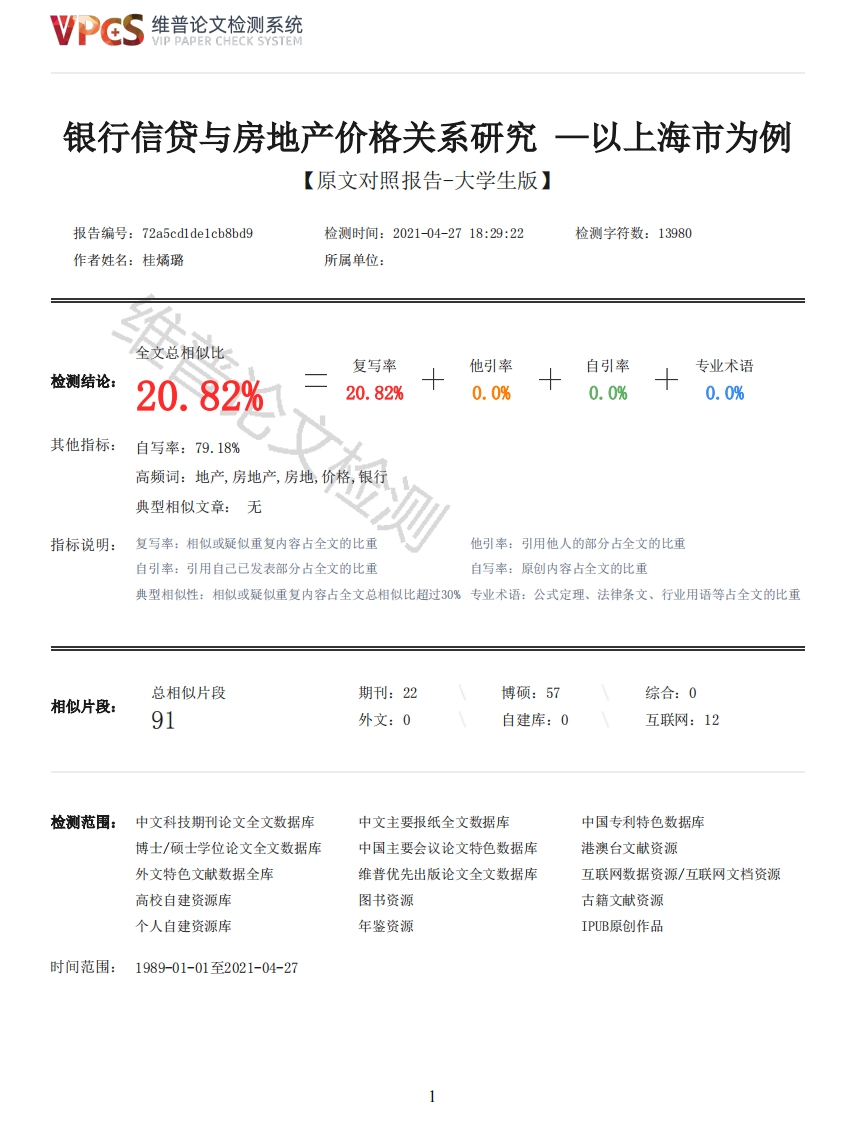 维普论文检测系统/IP PAPER CHECK SYSTEM银行信贷与房地产价格关系研究一以上海市为例【原文对照报告-大学生版】报告编号:72a5 cdlde1cb8bd9检测时间:2021-04-2718:29:22检测字符数:13980作者姓名:桂燏璐所属单位:全文总相似比复写率他引率自引率专业术语检测结论:20.82%20.82%0.0%0.0%0.0%其他指标:自写率:79.18%高频词:地产,房地产,房地,价格,银行典型相似文章:无指标说明:复写率:相似或疑似重复内容占全文的比重他引率:引用他人的部分占全文的比重自引率:引用自己已发表部分占全文的比重自写率:原创内容占全文的比重典型相似性:相似或疑似重复内容占全文总相似比超过30%专业术语:公式定理、法律条文、行业用语等占全文的比重总相似片段期刊:22博硕:57综合:0相似片段:91外文:0自建库:0互联网:12检测范围:中文科技期刊论文全文数据库中文主要报纸全文数据库中国专利特色数据库博士/硕士学位论文全文数据库中国主要会议论文特色数据库港澳台文献资源外文特色文献数据全库维普优先出版论文全文数据库互联网数据资源/互联网文档资源高校自建资源库图书资源古籍文献资源个人自建资源库年鉴资源IPUB原创作品时间范围:1989-01-01至2021-04-27维普论文检测系统VIP PAPER CHECK SYSTEM原文对照颜色标注说明:■自写片段■复写片段(相似或疑似重复)口引用片段(引用)■专业术语(公式定理、法律条文、行业用语等)ZHEJIANGYUEXIU UNIVERSITY毕业论文(2021届)银行信贷与房地产价格关系研究一以上海市为例学院专业金融工程班级金融工程1702班学号201730203020047学生姓名桂燏璐指导教师王引之日期2021年5月银行信贷与房地产价格关系研究一以上海市为例摘要银行信贷和房地产价格之间的联系十分密切,为了探究其中的关系,本文梳理了二者之间的影响机制,分析了上海市银行信贷和房地产价格的发展现状,最后建立VAR模型,实证分析的结果表明:第一、上海市银行信贷规模可以对房地产价格进行解释和预判,而房地产价格不能反映信贷规模。第二、银行信贷总额的增长会提高房价,但是随着时间的推移这种促进作用趋于平稳。第三,银行贷款利率的上升短期会抑制房价的上涨,但随着时间的推移,这种抑制作用逐渐减弱。对此,本文分别从政府、银行业和房地产业提出对策建议,对于政府而言,应该合理调控房价,健全监管机制,稳定土地价格:对于银行业而言,应适当加强风险管控,调整贷款结构,控制贷款规模:对于房地产业而言,应增加融资渠道,优化产业结构,设定相应警报值。关键词上海市:银行信贷:房地产价格2维普论文检测系统VIP PAPER CHECK SYSTEMRESEARCH ON THE RELATIONSHIP BETWEEN BANK CREIT AND REAL ESTATE PRICES -TAKE SHANGHAI AS ANEXAMPLEABSTRACTThe relationship between bank credit and real estate price is very close.In order to explorethe relationship,this paper combs the influence mechanism between them,analyzes the developmentstatus of bank credit and real estate price in Shanghai,and finally establishes a VAR model.Theresults of empirical analysis show that:first,the scale of Bank credit in Shanghai can explain andpredict the real estate price,The real estate price can not reflect the scale of credit.Second,the growth of the total amount of bank credit will increase the house price,but with the passage oftime,this promoting effect tends to be stable.Third,the rise of bank loan interest rate willinhibit the rise of house prices in the short term,but this inhibitory effect gradually weakenswith the passage of time.In this regard,this paper puts forward countermeasures and suggestionsfrom the government,the banking industry and the real estate industry:For the banking industry,weshould strengthen the risk control,adjust the loan structure and control the loan scale:For thereal estate industry,we should increase financing channels,optimize the industrial structure,andset the corresponding alarm value.KEY WORDS Shanghai;bank credit:Real estate prices目录摘要IABSTRACTII引言11银行信贷与房地产价格关系的理论分析11.1银行信贷对房地产价格的影响机制11.1.1房地产投资开发企业贷款对房地产价格的影响11.1.2个人住房贷款对房地产价格的影响21.2房地产价格对银行信贷的影响机制31.2.1房价变动的预期效应对银行信贷的影响31.2.2房地产价格对银行信贷的影响32上海市银行信贷与房地产价格关系的现实表现42.1上海市房地产信贷的历史和发展现状42.2上海市房地产业发展现状63上海市银行信贷与房地产价格实证分析83.1模型的构建和变量的选取83.2变量的数据处理93.3实证检验及结论分析93.3.1单位根检验93.3.2最优滞后期的选择93.3.3模型的平稳性检验103.3.4格兰杰(Granger)因果检验103.3.5脉冲响应和方差分解114结论与政策建议13参考文献16谢辞18引言随着经济全球化的发展,各国经济间的影响不断扩大,房地产市场作为经济发展的重要行业之一,不仅影响到国内市场,也调动着世界经济。纵观房地产市场的发展,可以发现银行信贷和房地产价格之间有着十分紧密的联系。上海作为国际大都市,对于长三角地区其他城市的发展起着龙头作用,其发展过程,更值得其他城市借鉴。近3