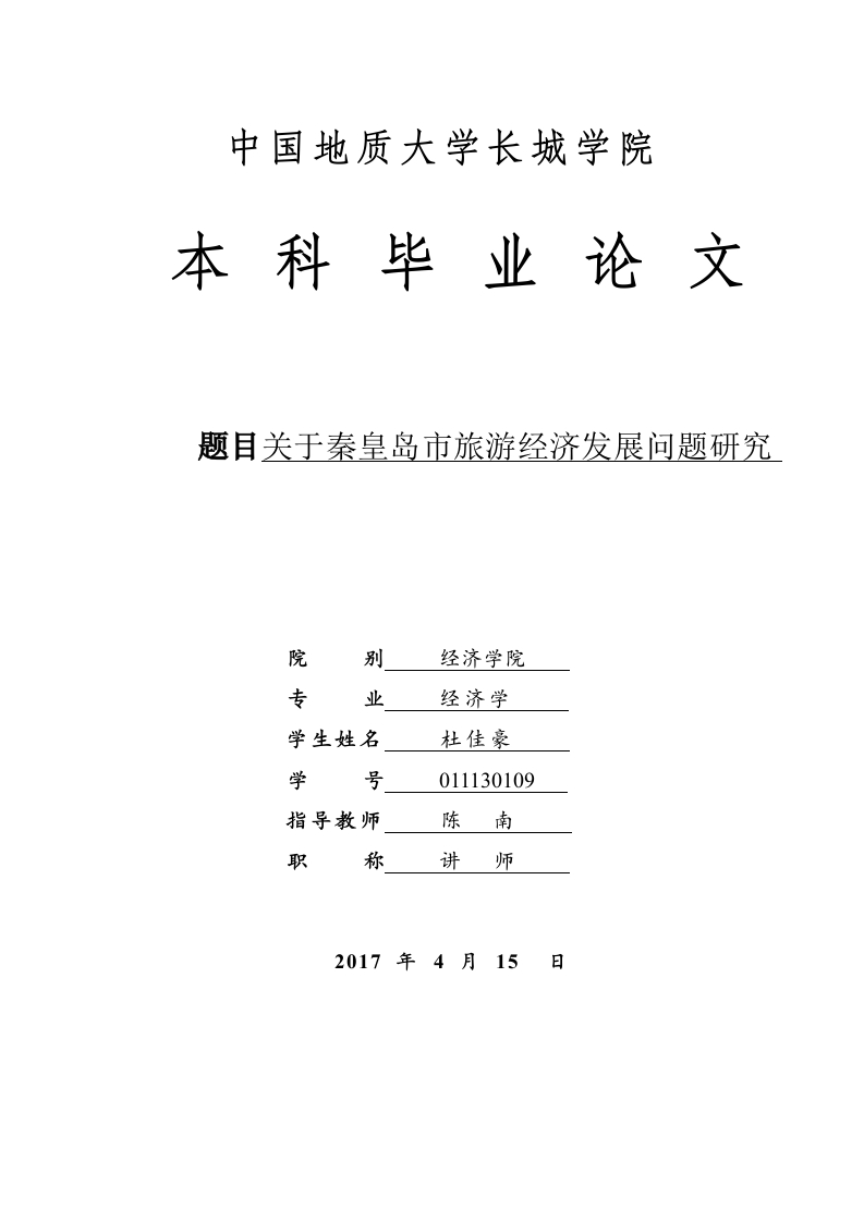 中国地质大学长城学院本科毕业论文题目关于秦皇岛市旅游经济发展问题研究院别经济学院专业经济学学生姓名杜佳豪学号011130109指导教师陈南职称讲师2017年4月15日关于秦皇岛市旅游经济发展问题研究摘要在人们不断增加的物质生活需求下,旅游产业应运而生,并在短时间内迅速发展壮大。在市场经济的发展的过程中,旅游行业的竞争越来越激烈,就秦皇岛市而言,是我国最早开放的十四个沿海城市之一。1984年至今,秦皇岛市成为我国首批对外沿海开放城市以来,凭借其优越的自然地理条件,积极发展旅游业。虽然在旅游发展方面取得了一些成就,但是与此同时也带来诸多问题。本文结合秦皇岛市旅游业发展现状,就存在的问题进行了深入的剖析,探寻问题的根源所在,从而制定相应的策略,为秦皇岛市旅游经济的进一步发展提供借鉴。关键词:秦皇岛区域:旅游资源:基础条件ABSTRACTTourism as the tertiary industry has made rapid development in our country.With thecontinuous improvement of people's living standard,tourism has become an important way oflife to modern human society and the social economic activities.In the process of thedevelopment of market economy,the tourism industry in the increasingly fierce competition,interms of qinhuangdao,is one of the earliest fourteen open coastal cities in China,since 1984 tobecome the first foreign open coastal city of qinhuangdao with natural geographical advantages,vigorously develop tourism.Although made some achievements in the field of tourismdevelopment,but also brings many problems.Combining with the qinhuangdao tourismdevelopment present situation,has carried on the thorough analysis of existing problems,explorethe root of the problem,so as to formulate the corresponding strategy,serve as a reference for thefurther development of tourism economy in qinhuangdao.Key words:Qinhuangdao:Tourism economy:Basic conditions目录2秦皇岛市旅游经济发展现状,12.1秦皇岛旅游产业发展总体情况12.2秦皇岛旅游产业的旅游资源22.3秦皇岛旅游经济产值情况.…3秦皇岛市旅游经济发展存在的问题33.1资金不足,基础设施不完善…33.2旅游业相关产业不发达…33.3客源市场狹窄43.4管理人才匮乏,旅游区环境条件差…43.5旅游品牌影响力小…44促进秦皇岛市旅游经济发展的建议…4.1市政府加大资金投入,兴建旅游配套基础设施.…54.2市政府提供旅游业优惠政策,加大力度扶植相关产业.4.3积极创新,开发旅游新项目64.4大力引进旅游业管理人才,保护旅游区环境.…4.5大力宣传本地区旅游特色,打造品牌特色旅游75结论.8参考文献9