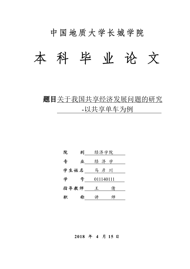 中国地质大学长城学院本科毕业论文题目关于我国共享经济发展问题的研究-以共享单车为例院别经济学院专业经济学学生姓名马彦川学号011140111指导教师王倩职称讲师2018年4月15日本科毕业生毕业论文(设计)诚信承诺书毕业论文关于我国共享经济发展问题的研究(设计)题目-以共享单车为例学生姓名马彦川专业经济学学号011140111指导老师王倩职称讲师所在院别经济学院诚信承诺本人慎重承诺和声明:我承诺在毕业论文(设计)活动中遵守学校有关规定,恪守学术规范,在本人的毕业论文中不剽窃、抄袭他人的学术观点、思想和成果,不篡改研究数据,如有违规行为发生,我愿承担一切责任,接受学校的处理。学生(签名):马彦川2018年4月15日中国地质大学长城学院毕业论文任务书学生姓名马彦川学号011140111专业班级经济学一班指导教师王倩职称讲师单位中国地质大学长城学院毕业论文关于我国共享经济发展现状的研究一以共享单车为例题目毕业论文主要内容和要求:主要内容:本文主要分析共享单车国内发展的现状,首先对共享单车的概念进行概述,分析共享单车行业所存在的问题,然后管理和使用等方面进行分析,剖析共享单车存在使用和管理等原因,最后提出宣传、管理、修复等防范措施。要求:论文撰写要求思路清晰、内容充实、论点明确,论据充分,论证严密,语言通顺。撰写论文前应首先阅读相关的研究资料,掌握学术前沿动态,对相关理论著作要很好的把握,提高理论水平及思想深度。根据开题报告和老师提出的意见对论文提纲进行修改,确定大纲后认真撰写毕业论文。撰写论文结束后要根据老师的修改意见,认真反复的修改论文,并按照要求参加毕业论文的答辩,严格按照论文进度安排进行论文的写作。论文的格式、字数等撰写方面的要求参照《中国地质大学长城学院毕业论文(设计)撰写规范》。毕业论文主要参考资料:[1]杨英,陈琳,刘雪飞.共享经济启示的非正式学习发展研究U.中国电化教育,2017(12)1418+52.[2]郑联盛.共享经济:本质、机制、模式与风险U.国际经济评论,2017(06):45-69+5.[3)乔桐.浅析交通类共享经济引发的治安问题及治理).北京警察学院学报,2017(06)31-36.[4范春蓉.共享经济下我国消费者参与协同消费的影响因素研究D).西南交通大学,2017.[5)]罗娟.我国“专车”类共享经济的法律规制D.西南交通大学,2017.[6李悦.我国共享经济时代下的劳动关系认定研究D]深圳大学,2017.董成惠.共享经济:理论与现实).广东财经大学学报,2016,31(05):415俞春阳.共享制造模式下的计划体系研究D].浙江大学,2016[9]潘敬萍.共享经济商业模式下共享单车发展路径研究).现代商业,2017(32)34-36.[10]马强共享经济在我国的发展现状、瓶颈及对策U.现代经济探讨,2016(10):20-24.[11]卢现祥共享经济:交易成本最小化、制度变革与制度供给社会科学战线,2016(09):51-61.[12]刘奕,夏杰长.共享经济理论与政策研究动态.经济学动态,2016(04):116-125.[13]Darl Hord.Tthe research of shared bike development.[J].Joumal ofAccounting Literature,2017,1(3):3141.