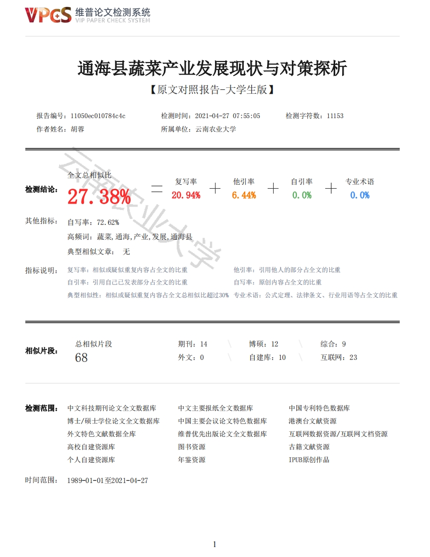 维普论文检测系统/IP PAPER CHECK SYSTEM通海县蔬菜产业发展现状与对策探析【原文对照报告-大学生版】报告编号:11050ec010784c4c检测时间:2021-04-2707:55:05检测字符数:11153作者姓名:胡蓉所属单位:云南农业大学全文总相似比复写率他引率自引率专业术语检测结论:27.38%20.94%6.44%0.0%0.0%其他指标:自写率:72.62%高频词:蔬菜,通海,产业,发展,通海县典型相似文章:无指标说明:复写率:相似或疑似重复内容占全文的比重他引率:引用他人的部分占全文的比重自引率:引用自己已发表部分占全文的比重自写率:原创内容占全文的比重典型相似性:相似或疑似重复内容占全文总相似比超过30%专业术语:公式定理、法律条文、行业用语等占全文的比重总相似片段期刊:14博硕:12综合:9相似片段:68外文:0自建库:10互联网:23检测范围:中文科技期刊论文全文数据库中文主要报纸全文数据库中国专利特色数据库博士/硕士学位论文全文数据库中国主要会议论文特色数据库港澳台文献资源外文特色文献数据全库维普优先出版论文全文数据库互联网数据资源/互联网文档资源高校自建资源库图书资源古籍文献资源个人自建资源库年鉴资源IPUB原创作品时间范围:1989-01-01至2021-04-27维普论文检测系统VIP PAPER CHECK SYSTEM原文对照颜色标注说明:■自写片段■复写片段(相似或疑似重复)口引用片段(引用)■专业术语(公式定理、法律条文、行业用语等)科类管理学编号(学号)2017314140本科生毕业论文(设计)通海县蔬菜产业发展现状与对策探析Analysis on the current situation and countermeasuresof vegetable industry development in Tonghai County胡蓉指导教师:李永前职称副教授云南农业大学昆明黑龙潭650201学院:国际学院专业:农林经济管理(中外合作办学)年级:2017级论文(设计)提交日期:2021年4月答辩日期:2021年5月答辩委员会主任:赵鸭桥云南农业大学2021年6月通海县蔬菜产业发展现状与对策探析胡蓉(云南农业大学国际学院,昆明650201)摘要农业作为国民经济基础的第一产业,是人民安身立命的根本,是对国家经济和社会发展有着重要地位的产业。现代农业作为市场经济新形势下我国农业发展的重要动能,用科学技术更替传统种植技术,使农业生产成为商品化、社会化、区域化、专业化的发展模式,是决定一个产业能否可持续发展的重要因素。因此,为了推进通海县蔬菜产业的长足发展和经济效益的稳定发展,本文将对通海县蔬菜产业的发展现状进行深入了解和分析,并找出产业发展中存在的问题,从而提出解决思路。本文以通海县蔬菜产业为例,以实地调查、文献研究和线上访问为主的研究方法,对当地的蔬菜产业发展现状和存在的问题及原因进行分析研究。结果表明,虽然通海县的蔬菜产业具有较强的系统性,优越的蔬菜种植条件和地域出口优势,但在发展过程中,多数农户还是以传统农业为主的经营模式,这极大的阻碍了当地蔬菜产业向农业现代化的转变。生产经营分散、种植品种局限,产品附加值低,种植技术落后,是当下通海县蔬菜产业面临的主要问题。在此基础上,结合当地的实际情况,提出通过优化产业布局、推动产业集群发展、加强新品种的试验示范,引进先进种植技术,鼓励和引导企业对蔬菜产品进行深加工。最终实现通海县蔬菜产业化发展,加快当地传统农业向现代农业的转变步伐。关键词:蔬菜;通海县;产业化:现代农业Analysis on the current situation and countermeasures of vegetable industry development in2维普论文检测系统VIP PAPER CHECK SYSTEMTonghai CountyHU Rong(International College of Yunnan Agricultural University,Kunming 650201)AbstractAs the first industry of national economy,it is the foundation of the people's living andliving,and it is an industry which plays an important role in the national economic and socialdevelopment.Modern agriculture,as an important driving force of agricultural development in thenew market economy,replaces traditional planting technology with science and technology,makingagricultural production a model of commercialization,socialization,regionalization andspecialization,and is an important factor to determine the sustainable development of an industry.Therefore,in order to promote the rapid development of the vegetable industry and the stabledevelopment of economic benefits,this paper will deeply understand and analyze the developmentstatus of the vegetable industry in Tonghai County,and find out the problems in the development ofthe industry,and then put forward the solution.This paper takes Tonghai vegetable industry as an example,and analyzes the current situationand existing problems and reasons of the local vegetable industry by means of field investigation,literature research and online visit.The results show that although the vegetable industry inTonghai County has strong system,superior vegetable planting conditions and regional exportadvantages,most farmers still take traditional agriculture as the main business mode in thedevelopment process,which greatly hinders the transformation of local vegetable industry toagricultural modernization.The main problems of Tonghai vegetable industry are scattered productionand management,limited varieties,low added value of products and backward planting technology.Onthis basis,combined with the local actual situation,the paper proposes to optimize the industriallayout,promote the development of industrial clusters,strengthen the experimental demonstration ofnew varieties,introduce advanced planting technology,encourage and guide enterprises to furtherprocess vegetable products.Finally,the industrialization of vegetables in T