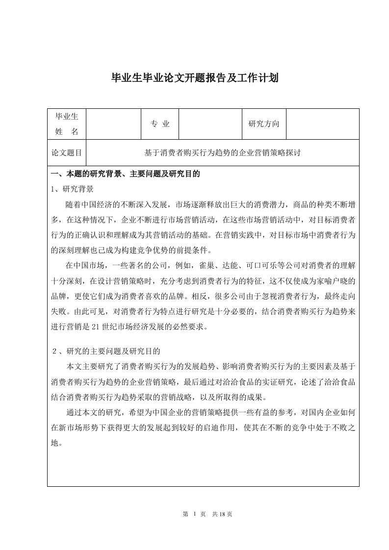 毕业生毕业论文开题报告及工作计划毕业生专业研究方向姓名论文题目基于消费者购买行为趋势的企业营销策略探讨一、本题的研究背景、主要问题及研究目的1、研究背景随着中国经济的不断深入发展,市场逐渐释放出巨大的消费潜力,商品的种类不断增多,在这种情况下,企业不断进行市场营销活动,在这些市场营销活动中,对目标消费者行为的正确认识和理解成为其营销活动的基础。在营销实践中,对目标市场中消费者行为的深刻理解也己成为构建竞争优势的前提条件。在中国市场,一些著名的公司,例如,雀巢、达能、可口可乐等公司对消费者的理解十分深刻,在设计营销策略时,充分考虑到消费者行为的特征,这不仅使成为家喻户晓的品牌,更使它们成为消费者喜欢的品牌。相反,很多公司由于忽视消费者行为,最终走向失败。由此可见,对消费者行为特点进行研究是十分必要的,结合消费者购买行为趋势来进行营销是21世纪市场经济发展的必然要求。2、研究的主要问题及研究目的本文主要研究了消费者购买行为的发展趋势、影响消费者购买行为的主要因素及基于消费者购买行为趋势的企业营销策略,最后通过对洽洽食品的实证研究,论述了洽洽食品结合消费者购买行为趋势采取的营销战略,以及所取得的成果。通过本文的研究,希望为中国企业的营销策略提供一些有益的参考,对国内企业如何在新市场形势下获得更大的发展起到较好的启迪作用,使其在不断的竞争中处于不败之地。第1页共18页二、本题的研究思路与主要工作研究思路本文的研究思路如下:第一章消费者购买行为的发展趋势第二章影响消费者购买行为的主要因素第三章基于消费者购买行为趋势的企业营销策略第四章对洽洽食品进行实证研究主要工作本文主要做了以下三方面的工作:1、理论学习笔者在参阅大量的参考文献后,对消费者购买行为趋势进行研究,对企业营销策略进行探讨。2、实证研究研究消费者行为离不开市场调查工作,理论必须与实践相结合才能正确的指导实践。通过实例研究可以检验对消费者购买行为趋势研究的适用性,以及可以使企业发现自身存在的问题并帮助其找到解决的方法。本文通过对洽洽食品的实证研究,论述了洽洽食品结合消费者购买行为趋势所采取的营销战略,以及所取得的成果。第2页共18页四、参考文献[1][美]菲利普·科特勒著,梅汝和,梅清和,周安柱译,营销管理(新前年版·第十版),北京,中国人民大学出版社,2001年.[2]阴国恩,梁福成,白学军编著,普通心理学,天津,南开大学出版社,1998年.[3][美]维瑟拉.R.拉奥,乔尔.H.斯特克尔著,张武养,张永宏等译,战略营销分析,北京,中国人民大学出版社,2001年.[4][美]瓦拉瑞尔·A·泽丝曼尔,玛丽·乔·比特纳著,张金成,白长虹译,服务营销(原书第二版),北京,机械工业出版社,2002年.[5]崔建华,成爱武主编,消费心理学,哈尔滨,哈尔滨工业大学出版社,1998年.[6][美]加里.L.利连,阿温德.朗格斯瓦米著,魏立原,成栋译,营销工程与应用,北京,中国人民大学出版社,2005年[7]陈文华主编,消费心理与营销对策,北京,中国国际广播出版社,2002年.[8]纪宝成著,市场营销学教程,北京,中国人民大学出版社,1989年.第3页共18页
