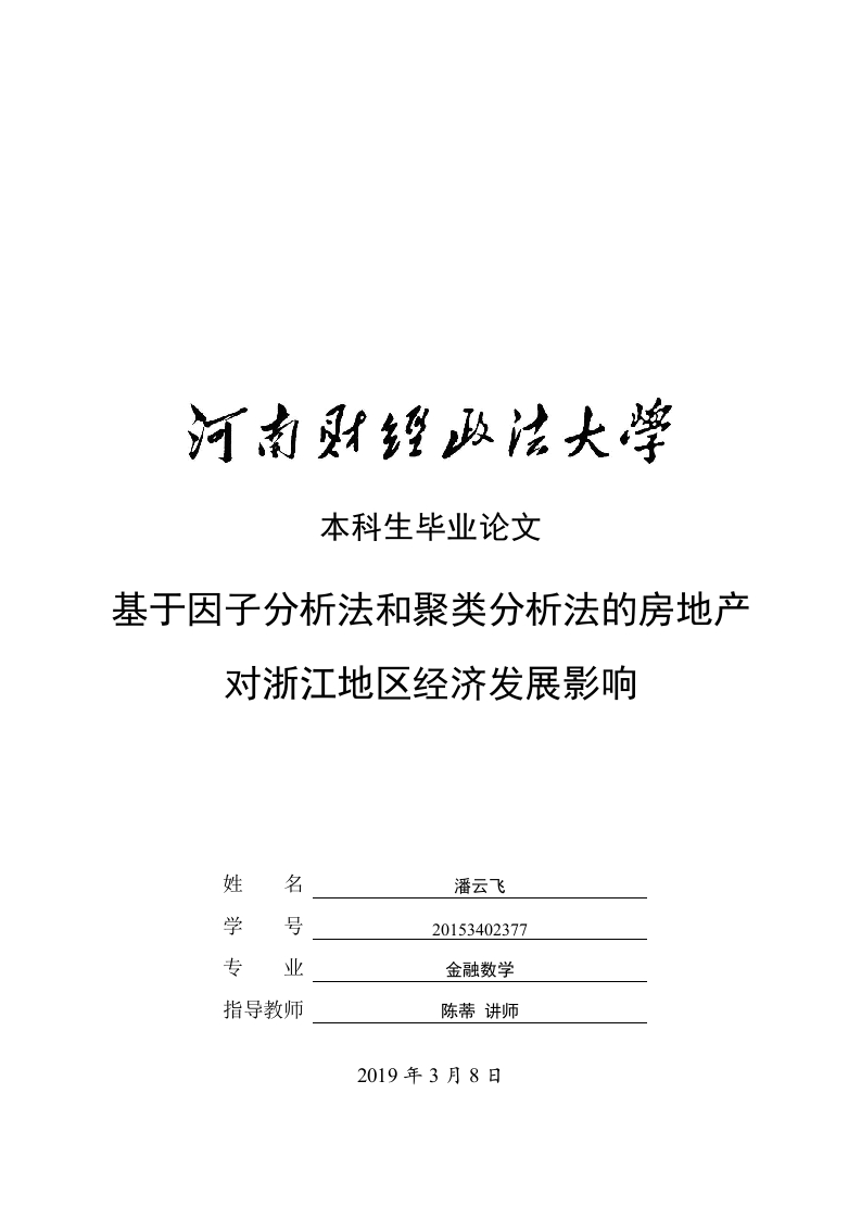 本科生毕业论文基于因子分析法和聚类分析法的房地产对浙江地区经济发展影响姓名潘云飞学号20153402377专业金融数学指导教师陈蒂讲师2019年3月8日摘要如今,我国的经济发展速度越来越快,由于房地产业是我国经济发展的重要组成部分,在我国的经济发展中起着无可代替的作用。本文首先阐述了房地产的定义,法律层面将房地产的概念规定成了财产权利,它主要由房产、经济利益与其拥有的权利组成。然后进一步分析了可能对房地产经济发展造成影响的因素。如居民家庭消费性支出(元/人),服务业(第三产业)占比,等诸多因素。但在这些因素中并不是所有的因素都是对房地产经济有巨大影响的。进而利用因子分析法分析各个相关因素对房地产经济的影响,解释他们的内在关联程度,分析出与房地产经济相互影响的因素。之后再利用聚类分析法,分析浙江衢州各个地区的房地产经济发展水品,深入对房地产业的认识,找出房地产经济对我国经济成长的影响,才可以将房地产业带来的经济效益发挥到最大,促进我国浙江地区经济迅速发展。关键词:房地产业:因子分析:聚类分析:经济发展AbstractChina's economic development is getting faster and faster.Since the real estateindustry is an important part of China's economic development,it plays anirreplaceable role in China's economic development.This article first elaborates onthe definition of real estate.The legal level defines the concept of real estate asproperty rights It is mainly composed of real estate,economic interests and therights it owns.Then further analyze the factors that may affect the real estateeconomic development,such as household consumption expenditure (yuan/person),service industry (third industry),and many other factors.But not all of these factorsThey all have a huge impact on the real estate economy.Then use factor analysis toanalyze the impact of various relevant factors on the real estate economy,explain theirinternal correlation,and analyze the factors that interact with the real estate economy.Then use the cluster analysis method.Analyze the real estate economic developmentwater products in various regions of Henan Province,deepen the understanding of thereal estate industry,find out the impact of the real estate economy on China'seconomic growth,and then maximize the economic benefits brought by the real estateindustry and promote the rapid economic development of Henan Provincedevelopment of。3