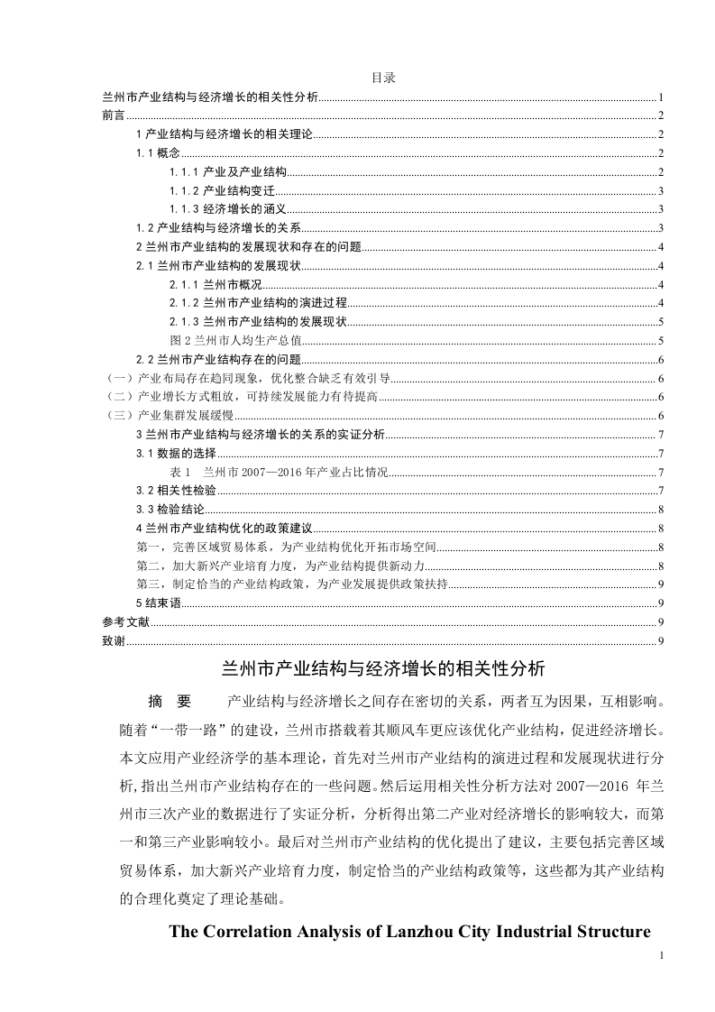 目录兰州市产业结构与经济增长的相关性分析…1产业结构与经济增长的相关理论.211概念21.1.1产业及产业结构21.1.2产业结构变迁.…31.1.3经济增长的涵义…31.2产业结构与经济增长的关系…32兰州市产业结构的发展现状和存在的问题…42.1兰州市产业结构的发展现状2.1.1兰州市概况….42.1.2兰州市产业结构的演进过程2.1.3兰州市产业结构的发展现状5图2兰州市人均生产总值52.2兰州市产业结构存在的问题…6(一)产业布局存在趋同现象,优化整合缺乏有效引导6(二)产业增长方式粗放,可持续发展能力有待提高….6(三)产业集群发展缓慢3兰州市产业结构与经济增长的关系的实证分析,73.1数据的选择…7表1兰州市2007一2016年产业占比情况.3.2相关性检验…73.3检验结论.4兰州市产业结构优化的政策建议….8第一,完善区域贸易体系,为产业结构优化开拓市场空间8第二,加大新兴产业培有力度,为产业结构提供新动力8第三,制定恰当的产业结构政策,为产业发展提供政策扶持5结束语.参考文献…9致谢…兰州市产业结构与经济增长的相关性分析摘要产业结构与经济增长之间存在密切的关系,两者互为因果,互相影响。随着“一带一路”的建设,兰州市搭载着其顺风车更应该优化产业结构,促进经济增长。本文应用产业经济学的基本理论,首先对兰州市产业结构的演进过程和发展现状进行分析,指出兰州市产业结构存在的一些问题。然后运用相关性分析方法对2007一2016年兰州市三次产业的数据进行了实证分析,分析得出第二产业对经济增长的影响较大,而第一和第三产业影响较小。最后对兰州市产业结构的优化提出了建议,主要包括完善区域贸易体系,加大新兴产业培育力度,制定恰当的产业结构政策等,这些都为其产业结构的合理化奠定了理论基础。The Correlation Analysis of Lanzhou City Industrial Structureand Economic GrowthAbstractThere is a close relationship between industrial structure and economicgrowth,both causal and influence each other As the area of construction,the Lanzhou citywith its lift should optimize the industrial structure,promoting economic growth,the basictheory of industry economics is applied in this article,first of all,Lanzhou city industrialstructure evolution process and development present situation analysis,points out someproblems of Lanzhou city industrial structure Then,using the correlation analysis method2007 to 2016 Lanzhou three industry has carried on the empirical analysis of data,analysisthe second industry have bigger influence on the economic growth,and the first and thirdindustry Finally puts forward some Suggestions for the optimization of industrial structure inLanzhou city,mainly including the regional trade system,increase the intensity of emergingindustries,to formulate appropriate policies of industrial structure,.Keywords industrial structure ;economic growth relation关键词产业结构:经济增长:关系前言近年来,国内外的经济形势较为复杂,各国经济运行压力较大,经济增长缓慢。面对恶劣的外部环境,兰州市一直坚持以推进供给侧结构性改革为出发点,同时坚持协调、绿色、创新的发展理念,以此作为经济稳中求进的总基调,所以经济运行从整体上来说趋于平稳。但还是存在一些问题,兰州市的产业层次与其他省会城市相比处于一个较低的水平,第三产业比重较低,但还有较大的发挥能力,因此兰州市产业结构需要调整升级,从而带动经济的进一步增长。作为西北地区重要的省会城市,其地理位置十分重要。随着国家“一带一路”战略的深入贯彻,兰州市应积极响应国家政策的指引,把握此机遇实现产业结构的优化升级,从而使地方经济更好的发展,在提高自身经济质量的同时,努力实现国家西部地区大力发展的战略。随着产业结构与经济增长之间的关系越来越明显,两者之间的矛盾也越来越突出,而调整和优化产业结构可以有效的化解与经济增长之间的矛盾,也已经成为不可避免的手段。1产业结构与经济增长的相关理论1.1概念1.1.1产业及产业结构(1)产业2产业的出现与社会分工紧密相连,产业是构成国民经济必不可少的成分。在国民经济发展过程中,产业被认为是具有某些共同特征的群体的集合,这些特征主要集中体现在产品、劳务的生产与经营的方面。现如今生活中各种行业不管是提供哪种服务都可以称为产业。(2)产业结构在国民经济发展过程中不同产业之间构成状况以及不同产业之间的联系区别即为产业结构。产业结构有广义和狭义之分。狭义的产业结构主要指各产业的发展状况以及其分类和相互组合的方式。而广义的产业结构包括了不同产业在数量比例上、在空间分布结构的联系和区别,这是狭义产业结构所没有的内容。1.1.2产业结构变迁(一)产业结构变迁的概念产业结构变迁是指产业的不断发展变化,第一、第二、第三产业占产业总值的比重的变化以及发展质量上的变化。随着经济水平的不断提高、制度的完善、科技的进步以及居民生活需求的不断改善,各产业之间原有的平衡被打破,形成适应新形势下经济需要的产业平衡状态,这种新形势下的平衡状态伴随着产业数量和地位的变化,从初期的量变到发生质的改变,从而构成新的产业数量和地位,进而形成一个新的产业结构水平。(二)产业结构变迁的规律资本主义国家产业结构的变迁是伴随着工业革命的脚步发生的,使得工业比重增加,农业比重减小,这一现象一直伴随至今。从这一现象我们可以发现一般的规