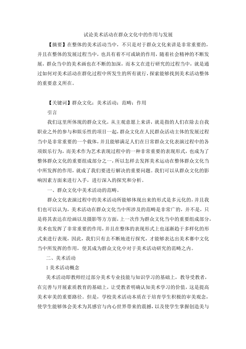 试论美术活动在群众文化中的作用与发展【摘要】在整体的美术活动当中,不只是对于群众文化来讲是非常重要的,并且在整体的发展过程当中,也具有着不可或缺的作用,随着社会精神的不断发展,群众当中的美术画也在不断的加深,而本文在进行研究的过程当中,就是通过如何对美术活动在群化过程中所发生的所有就行,探索能够找到美术活动整体的重要意义所在。【关键词】群众文化;美术活动:范畴:作用引言我们这里所体现的群众文化,从主观意愿上来讲,就是指的人们在除去自我职业之外的参与和娱乐性的项目一起,群众文化在人民群众活动主体的发展过程当中是非常重要的一个载体,并且能够满足人们在日常群众文化表演过程中的各项娱乐行为,而美术作为艺术表现过程中的一种非常重要的表现形式,也成为了整体群众文化的重要组成部分之一,所以怎样去发挥美术运动在整体群众文化当中所发挥的作用,就成了我们要进行解决的重要问题。我们可以从群众文化的影响因素方面来进行入手,进行深入的探究和分析。一、群众文化中美术活动的范畴。群众文化表演过程中的美术活动所能够体现出来的形式是多元化的,并且我们也可以认为,美术活动在群众文化当中所涉及的范畴是非常广的,并不是,只是将其表达在绘画以及摄影等方方面,上一次作为群众文化当中的重要组成部分,美术也发挥了非常重要的作用,并且在整体的表现形式上也逐渐趋于多样化的形式来进行表现,因此,我们只有去不断地进行探究,才能够表达出美术赛中文化当中所发挥的作用,使其成为群众文化中对于美术活动研究的范畴之内。二、美术活动1美术活动概念美术活动即教师经过部分美术专业技能与知识学习的基础上,教导受教者,在完善与开展素质教育的基础上,让受教者明确认知美术学习的价值,这是提高美术审美的重要路径。但是,学校美术活动本质在于培育学生积极的审美观念,使学生能够体会美术为其感官与内心世界带来的震撼,以及使学生掌握创造美与欣赏美的能力。教师要培育学生积极健康的审美观念,提升其审美水平,而学生经过感知美与不断训练思维能力,使其个性化得以全面发展。美术学习并非是单纯的课程与技能锻炼,更是文化学习,唯有在广泛的、不同的文化中领悟美术艺术、学习美术知识,才可切实感受到艺术的美。同时,学好美术对提升学生想象力、观察力和思维能力具有促进作用。另外,美术活动亦是提升学生艺术鉴赏力以及艺术修养的重要方式。通过美术活动,学生能够借助绘画表达个体情绪。美术活动可有效发挥美术的魅力,激发学生的学习兴趣。2群众文化中美术活动特征普通美术活动具备基础性与创新性特征,而基于群众文化的美术活动相对于普通美术活动而言,既具备共性,亦具备特殊性。唯有掌握这些特性,才可真正理解美术活动价值,以及美术活动与群众文化的关系。3群众美术活动作用现阶段,文化产业在国民经济增长中占据较大比重,文化产业的不断发展对于祖国整体经济实力提升起到不可替代的作用。伴随群众文化发展与进步,社会基层群体文化消费能力也随之提升,进而带动了国家文化产业的迅速发展。群众文化工作者在社会群体中实施美术活动,可以使广大社会群体了解美术艺术形式,加强自身艺术鉴赏力,进而拓展文化市场。同时,群众文化和美术活动的融合,能够推动美术作品逐步进入百姓生活中,促使人们不仅注重物质生活的追求与享受,还会对美术作品进行购买,来满足自身精神需要,这对于国家文化行业的发展发挥着推动作用。美术活动、群众文化两者间存在密切关联,并互相促进、互相影响。三、美术活动在群众文化中的重要作用。美术活动对于群众文化来讲是非常重要的有着不可或缺的作用。美术活动属于一种视觉艺术的活动,小学生在画画或者是做手工以前,首要就是通过视觉观察他所描绘的事物,从形状、结构、颜色、空间位置方面进行观察,然后在头脑中形成大概的轮廓,通过记忆和想象手动描绘出来。提高社会群体审美水平,美术即经过对作品的欣赏与理解,体会出思想情感的艺术。因而,美术活动在国家群众文化建设当中所饰演的角色极为重要,可有效提升群体审美水平,强化对于美术作品的理解与认知,满足群众文化生活诉求。美术活动对社会群体生活方式具有一定影响,可在无形中使社会群体成为艺术美的传递者,还可以提高社会群体的美术素养。积极实施美术活动,可以使得社会群体在欣赏美术作品的基础上,提高自身审美水准,陶治情操,从而实现提升社会群体综合素养的目标。通过对美术作品的深入了解,人们可以与美术活动建立起更为紧密的联系。这一联系在提升社会群体审美情趣的同时,还可提升其欣赏能力。社会群体作为国家的构成部分,提升其文化素质,加强文化自信,可提升国家文化软实力。美术活动中所包括的美术作品大多是作家在其生活当中的真实感受,也反映着社会具体发展方向。并且,我国美术领域发展多以政治发展为背景,美术作品蕴含着强烈的教育价值,可推动爱国主义相关教育实施,维护社会安定及经济增长。美术作品可反映一定的社会环境,促使群众对于文化发展态势有所把握,从而提高文化自信,发展具备中国特点的群众文化。另外,文化软实力象征着祖国面貌,实施美术活动是提