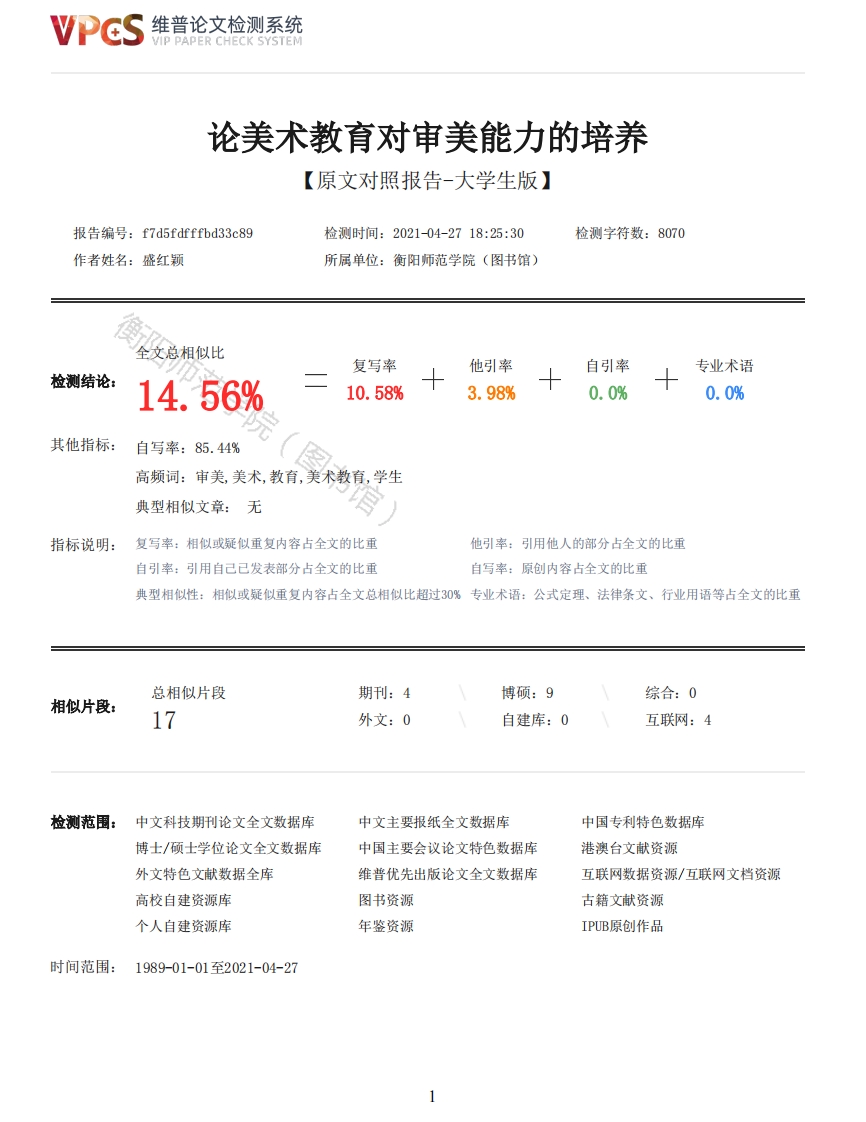 维普论文检测系统VIP PAPER CHECK SYSTEM论美术教育对审美能力的培养【原文对照报告-大学生版】报告编号:f7d5 fdfffbd33c89检测时间:2021-04-2718:25:30检测字符数:8070作者姓名:盛红颖所属单位:衡阳师范学院(图书馆)全文总相似比复写率他引率自引率专业术语检测结论:14.56%10.58%3.98%0.0%0.0%其他指标:自写率:85.44%高频词:审美,美术,教育,美术教育,学生典型相似文章:无指标说明:复写率:相似或疑似重复内容占全文的比重他引率:引用他人的部分占全文的比重自引率:引用自己已发表部分占全文的比重自写率:原创内容占全文的比重典型相似性:相似或疑似重复内容占全文总相似比超过30%专业术语:公式定理、法律条文、行业用语等占全文的比重总相似片段期刊:4博硕:9综合:0相似片段:17外文:0自建库:0互联网:4检测范围:中文科技期刊论文全文数据库中文主要报纸全文数据库中国专利特色数据库博士/硕士学位论文全文数据库中国主要会议论文特色数据库港澳台文献资源外文特色文献数据全库维普优先出版论文全文数据库互联网数据资源/互联网文档资源高校自建资源库图书资源古籍文献资源个人自建资源库年鉴资源IPUB原创作品时间范围:1989-01-01至2021-04-27维普论文检测系统VIP PAPER CHECK SYSTEM原文对照颜色标注说明:■自写片段■复写片段(相似或疑似重复)口引用片段(引用)■专业术语(公式定理、法律条文、行业用语等)衡阳师范学院毕业论文题目:论美术教育对审美能力的培养所在学院:美术学院专业:美术学学号:N17320218作者姓名:盛红颖(图书馆)指导教师:孙诗谦2021年3月21日论美术教育对审美能力的培养系:美术系专业:美术学学号:N17320218姓名:盛红颖指导教师:孙诗谦摘要:审美力,是对美的感受和鉴赏能力。美术教育是提高审美力的途径之一,对当代大学生群体发放线上调查问卷,使用SPSS23.0对数据进行分析,数据符合正态分布,使用T检验和卡方检验进行分析。我们发现当代大学生的审美程度一般:当代大学生提高审美力的途径大多数是通过第三方平台,如抖音、小红书、淘宝等和阅读书籍,并且女生相对于男生更愿意在其上投入时间和精力:大学生中女生群体更愿意通过专业的途径来提升审美力:当代大学生中女性更愿意尝试以美术教育的形式,本科生认为美术教育主要存在培训机构参差不齐的现状,研究生更加认为美术教育主要存在学校的师资力量不够以及其它的现状。综上所述,当代大学生中女生更愿意通过美术教育这个专业途径提高自己的审美力。关键词:美术教育审美力专业途径Abstract:Aesthetic power is the ability to feel and appreciate beauty.Art education is one ofthe ways to improve aesthetics.Online questionnaires are issued to contemporary college students,and SPSS 23.0 is used to analyze the data.The data conform to the normal distribution,and the Ttest and Chi-square test are used for analysis.We found that the aesthetic level of contemporarycollege students is average;most of the ways for contemporary college students to improve theiraesthetic ability are through third-party platforms,such as Douyin,Xiaohongshu,Taobao,etc.andreading books,and girls are more willing to invest time on them than boys And energy;girls amongcollege students are more willing to improve their aesthetics through professional means;womenamong contemporary college students are more willing to try art education in the form of arteducation.Undergraduates believe that art education is mainly due to the uneven status of traininginstitutions,and graduate students think more of art Education mainly exists in the school's lackof teachers and other status quo.In summary,girls among contemporary college students are morewilling to improve their aesthetics through the professional approach of art education.2维普论文检测系统VIP PAPER CHECK SYSTEMKeyword:art education,aesthetics,professional approach目录引言11.我国大学生审美现状调查11.1调查范围11.2调查过程21.3调查结果分析22.当代大学生提高审美力的途径42.1理论分析42.2调查分析42.3结果53.当代大学生对美术教育的看法6结论8参考文献9引言审美力,就是对美的感受和鉴赏能力。[1]审美能力包括感知力、直觉力、理解力、想象力等,是多种能力的综合体现。[2]在审美能力的构成中,感知力是最为基础的,在整个审美能力中起着奠基的作用,能推动其他审美能力的发展[1,2]。审美感知是指处于审美状态中的感觉和知觉。[3]审美感知力包括两个层面,一是对审美对象的外在表现形式的感知,包括美的事物的声音颜色、形状及气味的感知:二是对审美对象的内在意蕴的感知,[4]包括美的事物所传达的情感体现、象征意义乃至于价值取向等[3]。审美教育是以艺术和各种美好的形态作为具体的媒介手段,直接或间接的作用于接受者的各种感觉器官,[5]作用于接受者的情感,接受者通过反复的审美实践活动,通过耳濡目染,完成对个体审美意识的完善。[6]1.大学生审美现状调查以美育人,视觉冲击力的美有舞蹈,著名舞蹈家张继钢说:“用艺术美感唤醒生命美感”,就是通过舞蹈审美教育使学生能够“爱艺术,创造美”审美力[4,5]。音乐是舞蹈的灵魂,舞者在音乐中翩翩起舞,队形之美,传递一种主题。[7]文学创作是刻画人物、刻画它的人物关系,刻画它的核心事件,刻画其中的情感含量。比如说《百合花》,好多人去解剖它。从一床被子作为一个结构核,到一个破洞作为情感结构核。我们能够通过阅读优秀的文学作品和写作,可以读到非常喜爱的、让
