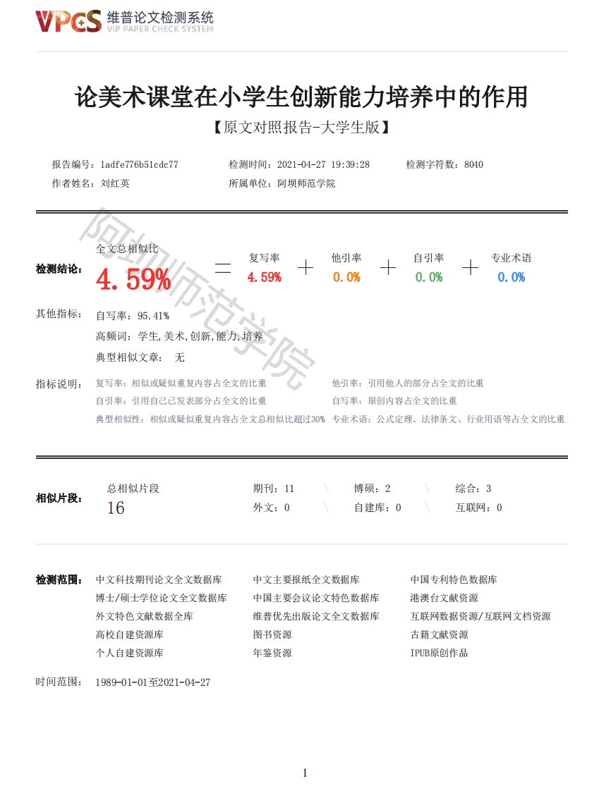 维普论文检测系统/IP PAPER CHECK SYSTEM论美术课堂在小学生创新能力培养中的作用【原文对照报告-大学生版】报告编号:1adfe776b51cdc77检测时间:2021-04-2719:39:28检测字符数:8040作者姓名:刘红英所属单位:阿坝师范学院全文总相似比复写率他引率自引率专业术语检测结论:4.59%4.59%0.0%0.0%0.0%其他指标:自写率:95.41%高频词:学生,美术,创新,能力,培养典型相似文章:无指标说明:复写率:相似或疑似重复内容占全文的比重他引率:引用他人的部分占全文的比重自引率:引用自己已发表部分占全文的比重自写率:原创内容占全文的比重典型相似性:相似或疑似重复内容占全文总相似比超过30%专业术语:公式定理、法律条文、行业用语等占全文的比重总相似片段期刊:11博硕:2综合:3相似片段:16外文:0自建库:0互联网:0检测范围:中文科技期刊论文全文数据库中文主要报纸全文数据库中国专利特色数据库博士/硕士学位论文全文数据库中国主要会议论文特色数据库港澳台文献资源外文特色文献数据全库维普优先出版论文全文数据库互联网数据资源/互联网文档资源高校自建资源库图书资源古籍文献资源个人自建资源库年鉴资源IPUB原创作品时间范围:1989-01-01至2021-04-27维普论文检测系统VIP PAPER CHECK SYSTEM原文对照颜色标注说明:■自写片段■复写片段(相似或疑似重复)口引用片段(引用)■专业术语(公式定理、法律条文、行业用语等)A BA TEACHERS UNIVERSITY本科毕业论文(设计)题目论美术课堂在小学生创新能力培养中的作用二级学院美术学院专业年级2017级学生姓名刘红英学号20176243指导教师王世琴职称教授完成时间:2020年4月7日阿坝师范学院本科毕业论文原创性声明本人郑重声明:所呈交的毕业论文,是本人在指导教师的的指导下,独立进行研究工作所取得的成果。除文中已经注明引用的内容外,本论文不含任何其他个人或集体已经发表或撰写过的作品或成果。对本文的研究做出重要贡献的个人和集体,均已在文中以明确方式标明。本人完全意识到本声明的法律结果由本人承担。毕业论文作者签名:日期:年月日关于论文使用授权的声明毕业论文作者完全了解阿坝师范学院有关保留和使用毕业论文的规定,即:本科生在校学习期间论文工作的知识产权单位属阿坝师范学院。学校有权保留并向国家有关部门或机构送交论文的复印件和电子版,允许毕业论文被查阅和借阅:学校可以公布论文的全部或部分内容,可以采用影印、缩印或其它复制手段保存、汇编毕业论文。保密的毕业论文在解密后遵守此规定。本人签名:日期:指导教师签名:日期:论美术课堂在小学生创新能力培养中的作用2维普论文检测系统VIP PAPER CHECK SYSTEM作者:刘红英摘要:小学教育是人生教育过程的基础阶段,对于今后人生的成长学习都具有重要作用。伴随着经济社会的发展,社会对于人才的需求也更加多样化,综合性的人才培养是学校教育的重要方向。如今小学美术教育的发展仍然较为落后,地区发展的不平衡在美术教育上体现得更加明显。但是美术课程由于其课程设置不同于普通学科,可以通过其多样性的课堂教学模式,教师的合理引导,使学生增强动手能力,提高创新能力,促进学生的全面发展和提高,这对学生的综合素质的培养有极大的帮助,美术课堂一方面可以直接有效的提高学生绘画能力,同时也间接的发展学生对于事物的理解与想象,这里的理解和想象会因为学生个人认知和经历的不同而展现出极大的差异,也就是体现出不同学生的想象力,不断运用美术课堂的实践活动来不断的刺激学生的多维想象和多面的理解,从而使得学生的创新能力的不断提高和完善,这就是本文所谈论的美术课堂对小学生创新能力培养的作用。关键词:美术课堂:创新;小学教育:能力培养一、绪论(一)研究背景随着21世纪国家大力推行素质教育以来,美术教育对于学生创新能力培养的作用被更加重视,同时美术教育也进入了快速发展的时期,然而在当前,美术课堂的内容仍然较为单一,教师水平参差不齐,同时美术课堂中过于重视对于技巧性的介绍,忽视了对于学生创新能力以的培养,同时城乡地区之间的差异大,这些因素都不利于小学生创新能力的培养,导致美术课堂未能充分发挥其优势。当今快速发展的世界背景下,创新能力尤为重要,小学生作为思维活跃、可塑性强的主要群体,在教育过程中应当着重加强其创新思维,不断增强其创新精神。在现代课程体系中,美术课在培养小学生创新思维方面具有特殊的优势,一方面美术可以综合地调动人的审美能力与情感思维,这些都是一个人思维状态活跃度的前提,是开拓创新思维的引导,另一方面,美术课程大多需要动手,而对于制作过程中手的参与可以锻炼右脑,有利于学生思维发散的培养。因此通过美术课堂,加强美术课堂的规范化以及学生的参与积极性,可以对小学生的创新能力的增强发挥重要作用。(二)研究目的及意义在如今各种科技加速变革的时代,创新能力是一个国家的发展的动力,创新型人才是当前社会各个行业都亟需的资源,而在我国基础教育过程中,对于创新能力的专门培养少之又少,专门依靠天分型人才去满足当前市场化需求已经落伍,因此,为国家的将来创新人才的培养,应当从基础教育阶段抓起,小学生时间充裕、思维活跃是开展创新能力培养的优先人群,美术课堂作为当前课程设置下最符