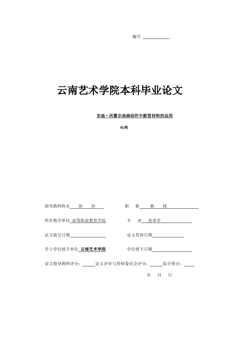 编号云南艺术学院本科毕业论文安迪·沃霍尔油画创作中新型材料的运用赵鹏指导教师姓名邱剑职称教授所在教学单位高等职业教育学院业美术学论文提交日期论文答辩日期学士学位授予单位云南艺术学院学位授予日期论文指导教师评分:论文评审与答辩委员会评分:综合得分:年月日云南艺术学院本科毕业论文诚信承诺书我是云南艺术学院应届本科毕业生,即将开始毕业论文的撰写,现郑重承诺:1.在撰写毕业论文的过程中,我将根据学院的要求,遵守学术研究和学术活动的基本规范,树立法制观念,尊重他人的劳动和权益,诚实守信,不弄虚作假。2不侵占、抄袭、别窃他人的学术成果,所写论文不包含他人已经发表的研究成果,也不包含他人为获得学位和证书而使用过的材料,凡引用他人成果均说明并列出有关文献的名称、作者、年份、出版机构等。若因版权、抄袭、剥窃等而导致的任何法律纠纷,由我本人负责,与学院无关。3.不请他人代写或帮他人代写毕业论文。4.不以不正当手段影响毕业论文的评审和答辩。5.以上各条如有违反,本人接受学院按有关规定作出的成绩处理和校纪校规处分。承诺人:学号:201708122012年月日目录关键词:安迪·沃霍尔:油画:新型材料。一、安迪·沃霍尔油画及新型材料概述.1二、安迪·沃霍尔油画创作中新型材料的运用2(一)日常用品类油画作品…(二)人物类油画作品.(三)瀕危动物类油画作品…参考文献致谢8