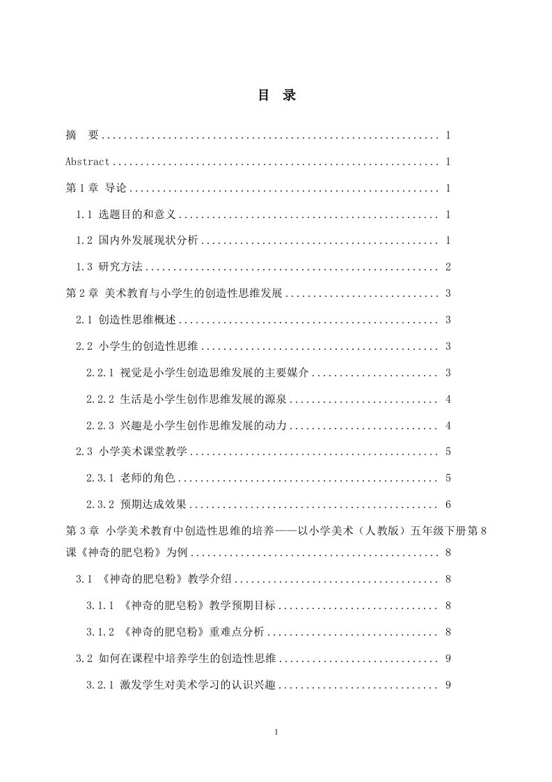 目录Abstract...........1.1选题目的和意义.1.2国内外发展现状分析...2第2章美术教育与小学生的创造性思维发展…32.2小学生的创造性思维.。3442.3小学美术课堂教学…556第3章小学美术教育中创造性思维的培养一一以小学美术(人教版)五年级下册第883.1《神奇的肥皂粉》教学介绍.....83.1.1《神奇的肥皂粉》教学预期目标.…83.2如何在课程中培养学生的创造性思维.·93.2.1激发学生对美术学习的认识兴趣.·91103.2.3加强学生的发散思维能力..123.2.4启发学生的想象力..·12第4章结论及培养建议.·134.1构建学生创新思维培养的教学情境.·131314162