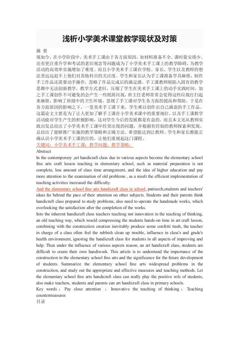 浅析小学美术课堂教学现状及对策摘要现如今,在小学阶段中,美术手工课由于各方面原因,如材料准备不全、课时量安排少、还有更注重升学和考试的老旧观念等问题成为了小学美术手工课上的教学障碍,为教学活动的高效率实施增加了难度。而且小学美术手工课在学校、家长、学生以及教师的想法里远远赶不上他们对其他科目的关注度。学生和家长认为手工课准备学具麻烦,制作手工作品还需要动手操作,忽略了作品完成后的满足感。手工课教师则陷入固有的教学思维中无法创新教学,教学方式老旧,压缩了学生在美术手工课上的动手实践时间,加之手工课创作不可避免的会产生一些纸屑垃圾,班主任老师常常会觉得这些垃圾打扫起来麻烦,影响了班级中的卫生环境,忽视了手工课对学生各方面的提高和帮助。于是在各方面原因的影响之下,一堂美术手工课下来,学生难以创作出自己满意的手工作品。这篇论文主要是为了让人更加了解手工课在小学美术课中的重要地位,以及手工课教学活动能对学生产生的积极影响,这对学生今后的发展都是有益的。而且本文还从教师实践出发总结出了小学美术手工课中经常出现的问题,并根据有经验的教师探索和发现,总结出了能够推广实施的教学策略和正确方法。希望能达到让教师、学生和家长都能正确认识小学美术手工课的目的,让他们重视起这门课程。关键词:小学美术手工课:教学问题:教学策略:AbstractIn the contemporary ,art handicraft class due to various aspects become the elementary schoolfine arts craft lesson teaching in elementary school,such as material preparation is notcomplete,less amount of class time arrangement,and the idea of higher education and paymore attention to the examination of old problems,as a result the efficient implementation ofteaching activities increased the difficulty.And the elementary school fine arts handicraft class in school,patriarch,students and teachers'ideas far behind the pace of their attention on other subjects.Students and their parents thinkhandicraft class prepared to study problems,also need to operate the handmade works,whichoverlooking the satisfaction after the completion of the works.Into the inherent handicraft class teachers teaching not innovation in the teaching of thinking,an old teaching way,which would compressing the students hands-on time in art craft lesson,combining with the construction creation inevitably produce some confetti trash,the teacherin charge of a class often feel the rubbish clean up trouble,influence in class's and grade'shealth environment,ignoring the handicraft class for students in all aspects of improving andhelp.Then under the influence of various aspects reason,an art handicraft class,students aredifficult to create their own handiwork.This article is to understand the importance of theconstruction in the elementary school fine arts and the significance for the future developmentof students.Summarize the elementary school fine arts widespread problems in theconstruction,and study out the appropriate and effective measures and teaching methods.Letthe elementary school fine arts handicraft class can really play the positive role of students,also make teachers,students and parents can art handicraft class in primary schoolsKey words Pay close attention Innovative the teaching of thinking Teaching目录TOCo"1-3"hzu摘要IAbstractⅡ一、小学美术手工课的重要性1(一)什么是小学美术手工课1(二)小学美术手工课的意义21.激发学生兴趣22.培养学生独立自主的能力23.培养团队互助精神34.有利于学生将美术和生活融为一体35.加强教师交流沟通能力46.提高教师在课堂中采用适当的应急措施的能力47.有效的开发学生想象力4二、小学美术手工课当前的现状6(一)小学美术手工课不受重视的问题6(二)在小学美术手工课课堂中出现的问题71.教师主控型角色阻碍教学目标的实现72.传统的教学模式过于僵化73.课堂互动效能低下8三、小学美术手工课的改进策略9(一)针对学生出现的问题所提出的改进策略9(二)针对课堂上出现的问题所提出的改进策略10结语11参考文献12谢辞13一、小学美术手工课的重要性(一)什么是小学美术手工课小学美术手工课跟学生的各方面都有着不可替代的联系,可以说它在学生一生的众多学科中是十分重要的一门,小学美术课总共可以分成绘画、欣赏以及手工,这是小学美术教学的三大部分。绘画培养学生对美术学习中最基本的知识点的认识,欣赏主要是培养学生认识到什么是美,而本文主要谈就是手工课对学生的培养。在手工课程当中,积极有效的教学活动能使学生的思维发散能力、想象创新精神和手工实践能力得到大幅提高,还可以使学生积极融入到合作、团结的氛围中去,尽量让整个学生集体共同进步,为小学生创造出一个质量高、又放松、又自在的学习环境,这样的环境更利于学生高效学习,来达到教学目标。手工课无疑能够对达到此目标要求做出很大贡献。而且小学美术手工课其实跟综合实践课程有着很深的联系,手工课程和实践课程这两门课的教学和活动的目标是有一定的相似性的。小学美术手工课要在达到课堂目标的基础上提高课堂上的作品完成程度。尽量让学生在课堂时间内完成手工作品,这样的要求可以培养学生的动手能力和完成任务的速度,还能够培养学生的时间观念。除了这些,提高效率还能有效加强学生的观察能力。同时,小孩子们稚气未脱,有着天马行空的想象力,手工课程正好可以将课堂内容结合学生的想法,以此来激发出学