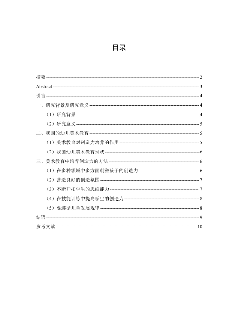 目录-2Abstract34一、研究背景及研究意义4(1)研究背景4(2)研究意义5二、我国的幼儿美术教育-5(1)美术教育对创造力培养的作用5(2)我国幼儿美术教育现状6三、美术教育中培养创造力的方法6(1)在多种领域中多方面刺激孩子的创造力6(2)营造良好的创造氛围7(3)不断开拓学生的思维能力7(4)在技能训练中提高学生的创造力(5)要遵循儿童发展规律结语9参考文献10浅析幼儿美术教育中创造力的培养摘要随着知识经济的不断发展,为了能与社会经济的发展步伐保持一致,我国的美术教育体制为也在不断地进行着改革。本文通过对美术教育的论述及我国美术教育现状的描述,反映出我国美术教育存在的问题,并引出笔者对幼儿美术教育中创造力的培养的几点建议。关键词:美术教育:创造力:培养AbstractWith the development of knowledge economy,the pace of development ofsociety and economy in order to maintain consistent,China's art education system isalso a reform constantly.In this paper,the current situation of art education in arteducation in our country is discussed and described,which reflects some problems ofart education in China,some suggestions and leads the author to cultivate creativity inchildren's art education.Keywords:art education;creativity;culture