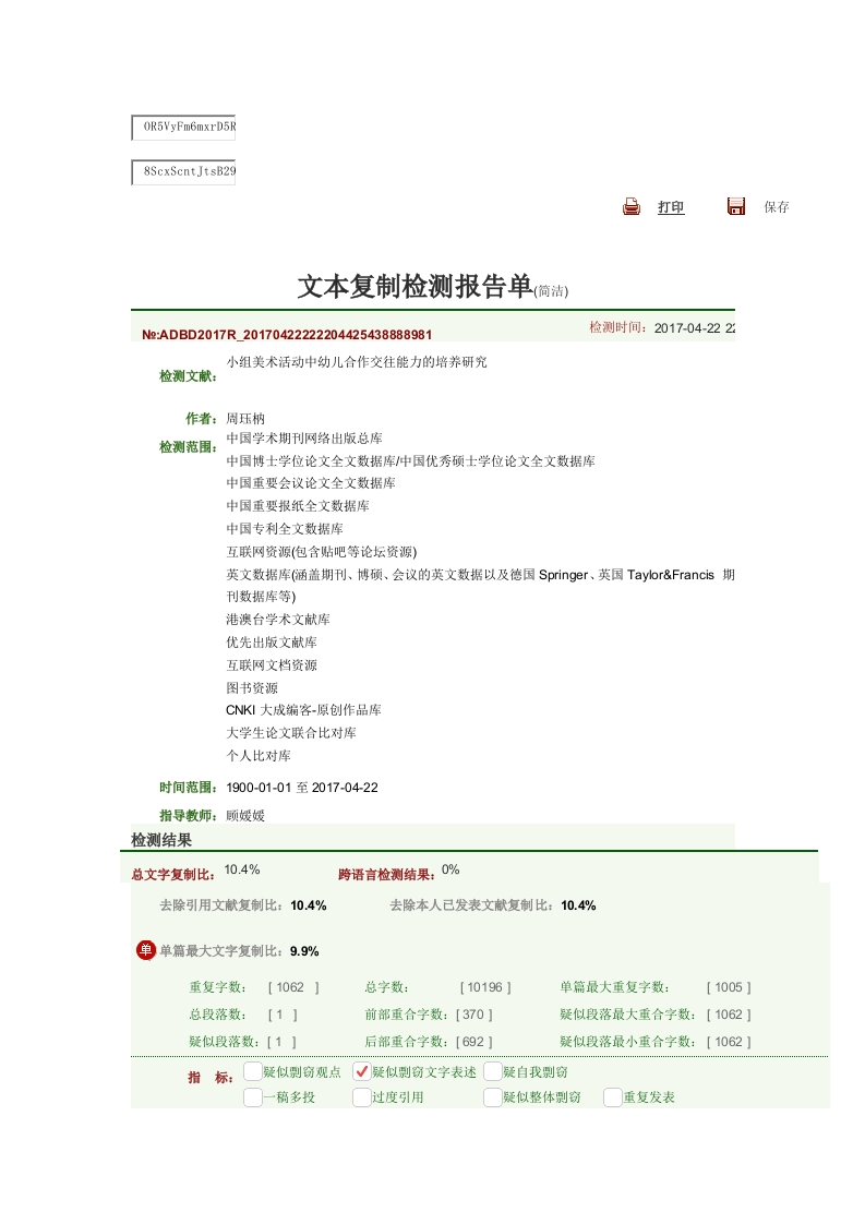 8ScxScntJtsB29保存文本复制检测报告单简油N:ADBD2017R20170422222204425438888981检测时间:2017-04-222小组美术活动中幼儿合作交往能力的培养研究检测文献:作者:周压枘检测范围:中国学术期刊网络出版总库中国博士学位论文全文数据库中国优秀硕士学位论文全文数据库中国重要会议论文全文数据库中国重要报纸全文数据库中国专利全文数据库互联网资源(包含贴吧等论坛资源)英文数据库函盖期刊、博硕、会议的英文数据以及德国Springer、.英国Taylor&Francis期刊数据库等)港澳台学术文献库优先出版文献库互联网文档资源图书资源CNKI大成编客-原创作品库大学生论文联合比对库个人比对库时间范围:1900-01-01至2017-0422指导教师:顾媛媛检测结果总文字复制比:10.4%跨语言检测结果:0%去除引用文献复制比:10.4%去除本人已发表文献复制比:10.4%单单篇最大文字复制比:9.9%重复字数:【1062】总字数:[10196】单篇最大重复字数:总段落数:前部重合字数:[370】疑似段落最大重合字数:【1062】疑似段落数:【1】后部重合字数:【692】疑似段落最小重合字数:【1062】指标:√疑似别窃文字表述疑自我别窃一稿多投过度引用疑似整体别窃重复发表表格:0脚注与尾注:01.小组美术活动中幼儿合作交往能力的培养研究总字数:10196相似文献列表文字复制比:10.4%(1062)疑似别窃观点(0)1打击乐器演奏活动中幼儿合作交往能力的培养研究9.9%(1005)《大学生论文联合比对库》-2016-04-26是否引证:否2闻静0.9%(88)闻静·《大学生论文联合比对库》-2016-05-31是否引证:否3闻静0.9%(88)闻静·《大学生论文联合比对库》-2016-05-31是否引证:否说明:1指标是由系统根据《学术论文不端行为的界定标准》自动生成的2.本报告单仅对您所选择比对资源范围内检测结果负责3.Email:amlc@cnki.net今htp:∥e.weibo.comu/3194559873http://t.qq.com/CNKI_kycxhttp://check.cnki.net/