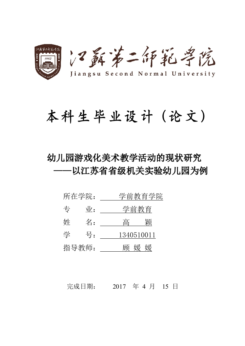 1952本科生毕业设计(论文)幼儿园游戏化美术教学活动的现状研究以江苏省省级机关实验幼儿园为例所在学院:学前教育学院专业:学前教育姓名:高颖学号:1340510011指导教师:完成日期:2017年4月15日江苏第二师范学院2013届本科生毕业设计(论文)目录摘要…ABSTRACT……3(一)问题提出…31、研究目的与意义…2、研究背景…(二)研究设计…1、研究对象…42、研究方法…53、研究过程……6(三)核心概念界定……6幼儿园美术教学…课程游戏化……6现状……7二、研究结果与分析…7(一)美术活动游戏化的形式,对于幼儿有效开展美术活动的重要意义……71、通过游戏激起幼儿的美术兴趣…72、游戏能够帮助幼儿提升美术色感…83、以游戏促进幼儿的美术技能的发展…8(二)开展幼儿园游戏化美术活动的策略分析…91、选择游戏化的美术教材…91江苏第二师范学院2013届本科生毕业设计(论文)2、运用游戏化的美术材料…3、以游戏的方式对美术活动进行评价……11(三)幼儿园美术教育游戏化面临的问题…111、理念层面,教师对于美术教学游戏化的重视不够…112、行动层面,教师在美术游戏中存在极端化现象…113、资源层面,幼儿园美术活动中的游戏资源有限…12三、相关问题的讨论及建议……12(一)如何推动游戏形式多样化…12(二)让美术成为游戏,游戏成为生活…14(三)对幼儿园教师在美术教学方面的两点建议…14四、研究的反思与展望……14(一)研究反思……14(二)研究展望……15致谢……16参考文献…17附录…18