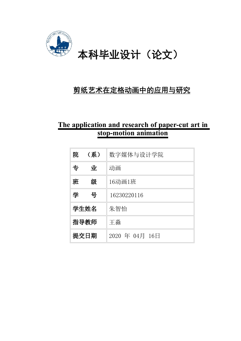 本科毕业设计(论文)剪纸艺术在定格动画中的应用与研究The application and research of paper-cut art instop-motion animation院(系)数字媒体与设计学院专业动画班级16动画1班学号16230220116学生姓名朱智怡指导教师王淼提交日期2020年04月16日毕业设计(论文)原创性声明本人郑重声明:所呈交的毕业设计(论文),是本人在指导老师的指导下,独立进行的设计(研究)工作及取得的成果,论文中引用他人的文献、数据、图件、资料均已明确标注出,论文中的结论和结果为本人独立完成,不包含他人已经发表或撰写的作品及成果。对本文的研究作出贡献的个人和集体,均已在论文中作了明确的说明。本人完全意识到本声明的法律结果由本人承担。毕业论文作者(签字):朱智怡签字日期:2020年4月16日指导教师评分:评阅教师评分:答辩小组评分:总评成绩:系主任签字(盖章):年月