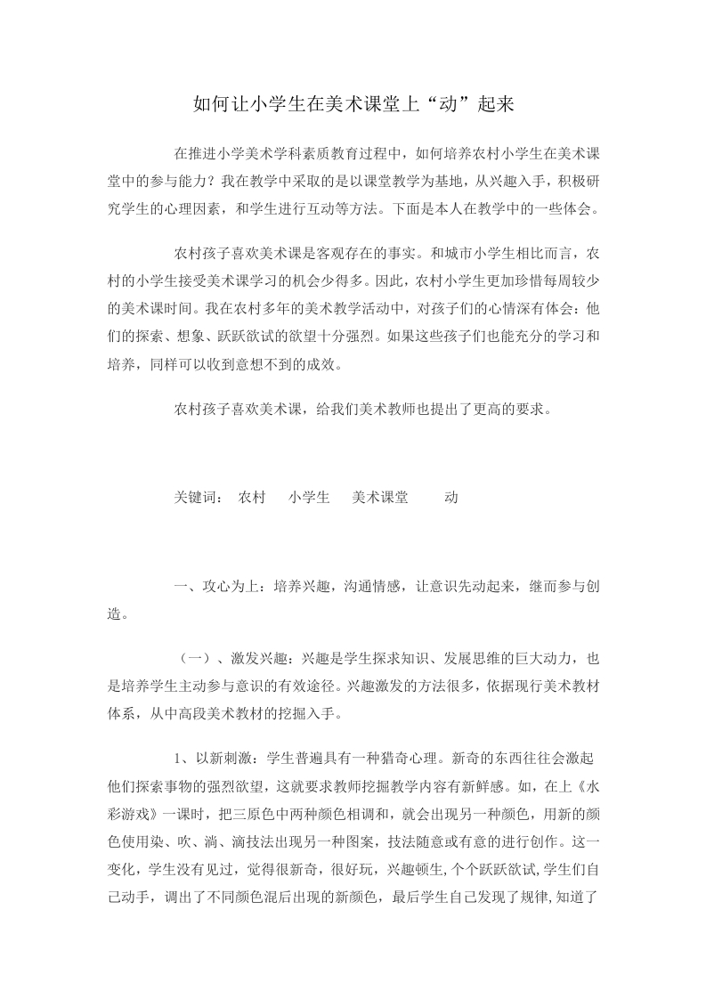 如何让小学生在美术课堂上“动”起来在推进小学美术学科素质教育过程中,如何培养农村小学生在美术课堂中的参与能力?我在教学中采取的是以课堂教学为基地,从兴趣入手,积极研究学生的心理因素,和学生进行互动等方法。下面是本人在教学中的一些体会。农村孩子喜欢美术课是客观存在的事实。和城市小学生相比而言,农村的小学生接受美术课学习的机会少得多。因此,农村小学生更加珍惜每周较少的美术课时间。我在农村多年的美术教学活动中,对孩子们的心情深有体会:他们的探索、想象、跃跃欲试的欲望十分强烈。如果这些孩子们也能充分的学习和培养,同样可以收到意想不到的成效。农村孩子喜欢美术课,给我们美术教师也提出了更高的要求。关键词:农村小学生美术课堂动一、攻心为上:培养兴趣,沟通情感,让意识先动起来,继而参与创造。(一)、激发兴趣:兴趣是学生探求知识、发展思维的巨大动力,也是培养学生主动参与意识的有效途径。兴趣激发的方法很多,依据现行美术教材体系,从中高段美术教材的挖掘入手。1、以新刺激:学生普遍具有一种猎奇心理。新奇的东西往往会激起他们探索事物的强烈欲望,这就要求教师挖掘教学内容有新鲜感。如,在上《水彩游戏》一课时,把三原色中两种颜色相调和,就会出现另一种颜色,用新的颜色使用染、吹、淌、滴技法出现另一种图案,技法随意或有意的进行创作。这一变化,学生没有见过,觉得很新奇,很好玩,兴趣顿生,个个跃跃欲试,学生们自己动手,调出了不同颜色混后出现的新颜色,最后学生自己发现了规律,知道了红加黄变为橙,红加蓝变为紫,黄加蓝变为绿,而橙绿紫三种色又叫三间色,学生们在动手中学到知识,在实践中得出结论。2、以情刺激:在绘画教学中,有许多内容都包含着一定的思想性,加上中高段学生的情感发展很快,教师要努力去拨响学生学习后的“情弦”。学生动了情,继而就有了情趣,有了与教师、作品同频共振的情趣,教育效果可想而知。从而以情造像,图情并茂。就会收到“唯恐聆听之不周,不知铃声之响”的效果。(二)、在沟通中了解学生的心理特点,与他们进行情感交流,有助于学生的动手参与,有助于学生创新意识的培养。1、注重距离感。实践表明,教师在教学中与学生之间的空间距离,很大程度上影响学生主动参与教学的强度及时间。因此,教师可采用主动在教室里来回走动的方式接近坐在后面的学生,缩短与他们之间的空间距离,从而缩短师生的心理距离,为全体学生积极主动动手参与创造条件。2、注重安全感。绝大部分学生对教师有一种畏惧心理,为了使学生积极动手参与教学活动,在课堂教学中必须使学生从心理上感到是安全的,其创作的作品不论好坏,都不会影响老师和同学对自己的看法,特别是做得不好时不会受到批评与嘲笑。针对这点,多鼓励所有学生积极动手参与,给学生改正错误的机会,使用一些使人轻松愉快的幽默,给学生安全感,那么,即使没把握,学生也会争先恐后地参与。3、注重成就感。为了让学生获得成就感,教师应把难度定在一个适当的水平。如何控制这个度,这就需要根据实际情况,因材施教,随机调节难度。当难度小时.教师可设置一些障碍:当难度过大时,教师要适当处理,分步进行。同时,当学生失败时,教师应给予帮助和鼓励:当学生成功时,教师要给予表扬肯定,使每个学生都能体验到成功的乐趣,从而愿意动手动脑、参与创造。二、且教且学:重视学生的学法指导,培养学生动手能力。教学是教和学的活动的统一体。教学方法既包含教师的教法,又包含学生的学法。重视学生的学法指导是实现从教到学的关键,是实施素质教育的重要途径。因此在教学中,应有系统地把学法指导与学习过程联系起来,使学生有愿望也有能力动手动脑参与学习、进行创造。1、千方百计提高技法训练。美术课对技法的要求很高,这是学生正确描绘制作对象,进行创作的基础。技法训练包含的内容较多,如:蜡笔水彩的造型、勾线、上色:泥塑课的揉搓粘画:手工课的折纸、裁剪、粘贴…因此,技法训练既要扣紧每节课的重点,又要胸有全局,点面结合:既要着眼于全班同学,又要照顾个别成绩突出或能力较弱的同学,因材施教:既要表扬鼓励,又要具体辅导,帮助他们解决技术上的困难。2、想方设法拓展想象空间。想象也是创作的源泉。古往今来许多创造发明都是从想象开始的。美术教学中,我们可用创设情境的方法来拓展想象空间,在教学内容与学生求知心理间创设一种“不协调”,使学生在探索的乐趣中寻求知识,培养动手能力,提高智力。三、对症下药:根据学生实际,最终达到学生“动”起来,推进小学美术学科素质教育。学生有了动手参与的兴趣、能力,还必须有参与机会,教师要善于根据教材内容特点和学生实际,创造条件。为学生提供更多的动手参与机会。1、课堂展览,让学生若有所思。绘画和手工是由外在形式构成的可视图像,学生可以直接感受,也易接受。在上课前,拿一些前几届或平行班的作品当范例,或把自己班的优秀作品展览,请同学按小组分别上讲台去看。学生对此较感兴趣,看得仔细,学得认真,因为这时的看,关系到自己的具体操作。教师若再在此基础上介绍一下那些作品各方面的优点,学生掌握得就越快,越全面。同时教师提出要求,布置任务,学生就会主