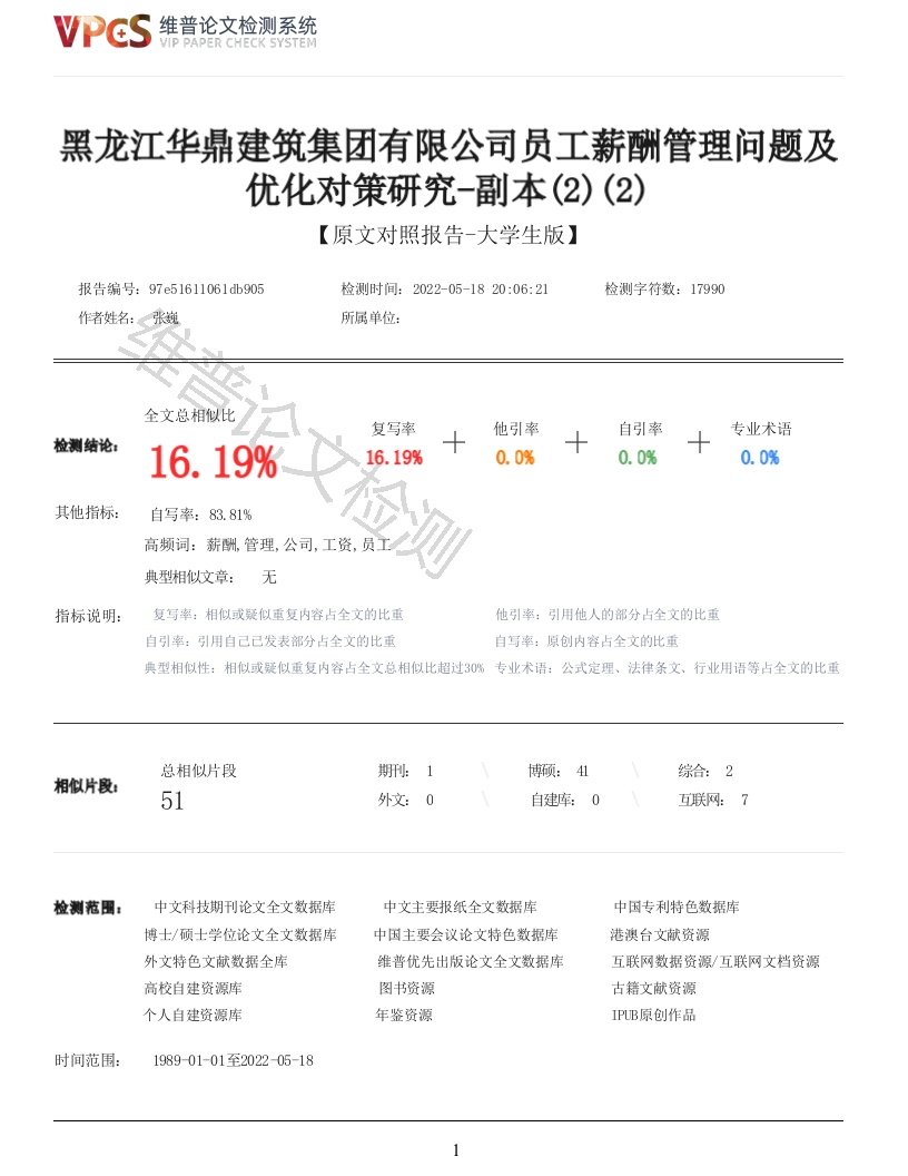维普论文检测系统VIP PAPER CHECK SYSTEM黑龙江华鼎建筑集团有限公司员工薪酬管理问题及优化对策研究-副本(2)(2)【原文对照报告-大学生版】报告编号:97e51611061db905检测时间:2022-05-1820:06:21检测字符数:17990作者姓名:张巍所属单位:全文总相似比复写率他引率自引率专业术语检测结论:16.19%16.19%0.0%0.0%0.0%其他指标:自写率:83.81%高频词:薪酬,管理,公司,工资,员工典型相似文章:无指标说明:复写率:相似或疑似重复内容占全文的比重他引率:引用他人的部分占全文的比重自引率:引用自己已发表部分占全文的比重自写率:原创内容占全文的此重典型相似性:相似或疑似重复内容占全文总相似比超过3%专业术语:公式定理、法律条文、行业用语等占全文的比重总相似片段综合:2相似片段:51外文:0互联网:7检测范围:中文科技期刊论文全文数据库中文主要报纸全文数据库中国专利特色数据库博士/硕士学位论文全文数据库中国主要会议论文特色数据库港澳台文献资源外文特色文献数据全库维普优先出版论文全文数据库互联网数据资源/互联网文档资源高校自建资源库图书资源古籍文献资源个人自建资源库年鉴资源IPB原创作品时间范围:198901-01至202205-181VPCS维普论文检测系统VIP PAPER CHECK SYSTEM原文对照颜色标注说明:■自写片段■复写片段(相似或疑似重复)引用片段(引用)专业术语(公式定理、法律条文、行业用语等)中华人民共和国教育部东北林业大学毕业设计(论文)论文题目:黑龙江华鼎建筑集团有限公司员工薪酬管理问题及优化对策研究学生:张巍指导教师:田国双教授学院:继续教育学院专业年级:工商管理2022年6月黑龙江华鼎建筑集团有限公司员工薪酬管理问题及优化对策研究摘要随着市场的日益变化和发展,公司薪酬管理工作对公司发展带来的影响作用日益突出,通过薪酬管理的改善不仅可以使员工的工作积极能动性得以有效增强,同时还可以使其绩效得以进一步改善,这对于公司人员的录用和留住、员工满意度的提升和公司的长远稳健发展都有着巨大的影响意义。本文将以黑龙江华鼎公司为主要调研对象,通过对其实际薪酬管理工作状况进行全方位的剖析,并对面临的问题及其问题形成的主要成因展开了深入性的调研,并以此为公司薪酬管理制度的健全提出针对性的改进意见,这将对于公司人员工作积极性及其绩效的改善有着很大的影响意义,同时也可以进一步推动公司内部市场竞争能力的增强。文章中首次介绍了薪酬管理体系的相关概念以及期望理论、完善基础理论和社会公平基础理论等关键知识:随后,重点介绍了黑龙江省华鼎建设集团的发展概况、组织架构与管理人才状况等,对黑龙江省华鼎薪酬结构的形成、薪酬管理体系建立状况、职工总体待遇水平、奖励措施和企业待遇管理状况等四个方面的实际工作状况展开了剖析,提出黑龙江省华鼎薪酬管理工作中面临的主要问题,并剖析了形成问题的主要成因:在此基础上,明确提出了对基本薪酬、浮动薪酬、福利待遇、工资调节机制等方面内容,做出了具体优化。通过改善黑龙江华鼎薪酬水平,以提升公司人员工作积极性,提升公司职工责任心与公平感,从而做到人工成本与费用控制,以保障公司的战略实施。关键词:薪酬管理:优化建议:员工激励:建设公司Research on employee salary management and Optimization Countermeasures of Heilongjiang HuadingConstruction Group Co.,LtdAbstract维普论文检测系统VIP PAPER CHECK SYSTEMWith the increasing changes and development of the market,the influence of the company'scompensation management on the company's development has become increasingly prominent.Theimprovement of compensation management can not only effectively enhance employees'work enthusiasm,but also further improve their performance.,which has a huge impact on the recruitment andretention of company personnel,the improvement of employee satisfaction and the long-term stabledevelopment of the company.This article will take Heilongjiang Huading Company as the main research object,conduct an all-round analysis of its actual salary management work status,and conduct in-depth research on theproblems it faces and the main causes of its formation,and take this as the company's Theimprovement of the compensation management system will put forward targeted improvement suggestions,which will have a great impact on the improvement of the company's staff's work enthusiasm andperformance,and can also further promote the company's internal market competitiveness.The article first introduces the relevant concepts of the salary management system and keyknowledge such as expectation theory,basic theory of improvement and basic theory of social equity:then,it focuses on the development overview,organizational structure and management personnelstatus of Heilongjiang Huading Construction Group.It analyzes the actual working conditions in fouraspects,including the formation of the salary structure of Heilongjiang Huading,the establishmentof the salary management system,the overall treatment level of employees,the incentive measuresand the management of enterprise treatment,and proposes that the salary management of HeilongjiangHuading faces the On this basis,it clearly proposes and optimizes the basic salary,floatingsalary,welfare treatment,salary adjustment mechanism and other aspects.By improving the salarylevel of Heilongjiang Huading,it can enhance the enthusiasm of the company's employees,enhance thesense of responsibility and fairness of the company's employees,so as to control labor costs andexpenses to ensure the implementation of th