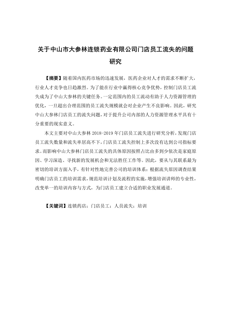 关于中山市大参林连锁药业有限公司门店员工流失的问题研究【摘要】随着国内医药市场的迅速发展,医药企业对人才的需求不断扩大,行业人才竞争也日趋激烈。为了能在行业中赢得核心竞争优势,控制门店员工流失成为了中山大参林的关键任务。一定范围内的员工流动有助于人力资源管理的优化,一旦超出合理范围的员工流失规模就会对企业产生不良影响。因此,研究中山大参林门店员工的流失问题,对于提升公司内部的人力资源管理水平具有十分重要的现实意义。本文主要对中山大参林2018-2019年门店员工流失进行研究分析,发现门店员工流失数量和流失率居高不下,门店员工流失控制上多次没有达到公司指标要求。而影响中山大参林门店员工流失的具体原因按照占比由多到少依次是家庭原因、学习深造、寻找新的发展机会和无法胜任工作等。因此,要从与其联系最为密切的培训方面入手,有针对性地完善公司的培训体系:根据流失原因调查结果明确门店员工的培训需求,规范培训计划及流程的实施,增强培训讲师的专业性,改变单一的培训内容与方式,为门店员工建立合适的职业发展通道。【关键词】连锁药店:门店员工:人员流失:培训Research on Zhongshan Dashenlin Chain PharmaceuticalCo.,Ltd.pharmacy staff turnover problems[Abstract]With the rapid development of the domestic pharmaceutical market,the demand for talents by pharmaceutical companies continues to expand,andcompetition for talents in the industry is becoming increasingly fierce.In order to gaina core competitive advantage in the industry,controlling the turnover of storeemployees has become a key task for Zhongshan Dashenlin.Employee mobilitywithin a certain range helps optimize human resource management,and once the scaleof employee turnover exceeds a reasonable range,it will have an adverse impact onthe enterprise.Therefore,it is of great practical significance to study the problem ofemployee turnover in Zhongshan Dashenlin store to improve the internal humanresources management level of the company.This paper mainly studies and analyzes the turnover of store employees inZhongshan Dashenlin from 2018 to 2019,and finds that the number and turnover rateof store employees are high,and the store employee turnover control has not met thecompany's index requirements many times.The specific reasons that affect the staffturnover of Zhongshan Dashenlin Pharmacy are the family reasons,the further study,the search for new development opportunities and the incompetence of the job inorder of increasing proportion.Therefore,we must start with the training that is mostclosely related to it and improve the company's training system in a targeted manner:According to the result of the investigation of the cause of the loss,the training needsof store employees are clarified,the implementation of training plans and processes isstandardized,the professionalism of training instructors is enhanced,the singletraining content and method are changed,and suitable career development channelsare established for store employees.[Keywords]Pharmacy chainPharmacy employee loss of employeestraining目录111.2研究目的与意义..…1.2.1研究目的......1.2.2研究意义21.3研究内容…21.4研究方法与技术路线21.4.1研究方法2.1员工流失的涵义.·42.2国内外文献综述..…42.2.1国内文献综述..2.2.2国外文献综述3中山大参林门店员工流失现状.773.1.1中山大参林企业简介....3.1.2中山大参林人力资源结构3.2中山大参林门店员工流失现状…703.3.1中山大参林门店员工流失的积极影响3.32中山大参林门店员工流失的消极影响..114中山大参林门店员工流失原因调查分析…124.1中山大参林门店员工流失原因调查.4.1.1调查问卷设计............4.2中山大参林门店员工流失原因分析.…144.2.2企业因素.…
