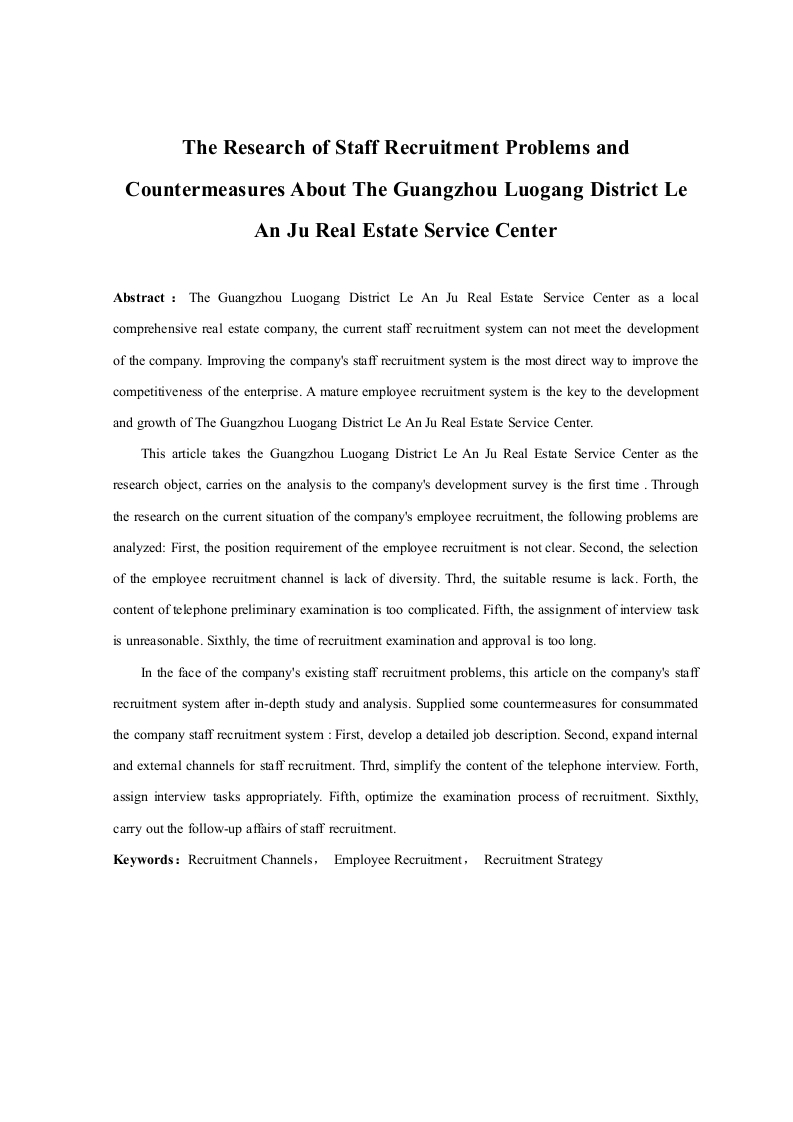 The Research of Staff Recruitment Problems andCountermeasures About The Guangzhou Luogang District LeAn Ju Real Estate Service CenterAbstract The Guangzhou Luogang District Le An Ju Real Estate Service Center as a localcomprehensive real estate company,the current staff recruitment system can not meet the developmentof the company.Improving the company's staff recruitment system is the most direct way to improve thecompetitiveness of the enterprise.A mature employee recruitment system is the key to the developmentand growth of The Guangzhou Luogang District Le An Ju Real Estate Service Center.This article takes the Guangzhou Luogang District Le An Ju Real Estate Service Center as theresearch object,carries on the analysis to the company's development survey is the first time.Throughthe research on the current situation of the company's employee recruitment,the following problems areanalyzed:First,the position requirement of the employee recruitment is not clear.Second,the selectionof the employee recruitment channel is lack of diversity.Thrd,the suitable resume is lack.Forth,thecontent of telephone preliminary examination is too complicated.Fifth,the assignment of interview taskis unreasonable.Sixthly,the time of recruitment examination and approval is too long.In the face of the company's existing staff recruitment problems,this article on the company's staffrecruitment system after in-depth study and analysis.Supplied some countermeasures for consummatedthe company staff recruitment system:First,develop a detailed job description.Second,expand internaland extemal channels for staff recruitment.Thrd,simplify the content of the telephone interview.Forth,assign interview tasks appropriately.Fifth,optimize the examination process of recruitment.Sixthly,carry out the follow-up aflairs of staff recruitment.Keywords:Recruitment Channels,Employee Recruitment,Recruitment Strategy目录第1章绪1.1研究背景和意义.。11.1.2研究意义…1.2文献综述…21.2.1国内研究。1.2.2国外研究.31.3课题研究方法和内容。31.3.1研究方法.31.3.2研究内容…4第2章广州市萝岗区乐安居房地产服务中心的发展概况..5第3章广州市萝岗区乐安居房地产服务中心员工招聘的现状…63.1广州市萝岗区乐安居房地产服务中心现行的员工招聘体系..·63.2广州市萝岗区乐安居房地产服务中心员工招聘存在的问题及原因分析.·73.2.1员工招聘岗位要求不明确。3.2.2员工招聘渠道的选择缺乏多样性...。83.2.3缺少员工招聘的有效简历.。93.2.4电话初试的内容过于繁琐.。93.2.5面试任务分配不合理.…103.2.6录用审核时间过长。11第4章完善广州市萝岗区乐安居房地产服务中心员工招聘的对策…124.1制定详细的岗位说明书.…124.2拓展员工招聘内、外部渠道…134.3简化电话初试的内容.…13144.5优化录用的审核流程.1415第5章总结.…16参考文献:第1章绪论1.1研究背景和意义1.1.1研究背景企业的全面发展依靠的不仅是业务的增加,还得拥有完善的员工招聘体系。在目前的社会大环境下,企业之间的竞争已从业务能力的竞争演变成为员工招聘之间的竞争。随着时代变化,经济快速发展,员工招聘的竞争也越演越烈。广州市萝岗区乐安居房地产服务中心作为一家综合性房地产公司,员工招聘的质量决定了企业在行业中的竞争力,能否招聘并选拔出合适的员工是广州市萝岗区乐安居房地产服务中心发展壮大的关键。成熟的员工招聘体系是广州市萝岗区乐安居房地产服务中心对员工招聘管理及开发的行动指南,对于员工招聘工作的开展具有至关重要的作用。广州市萝岗区乐安居房地产服务中心现有的员工招聘体系存在着弊端,员工招聘体系不完善,员工招聘时间过长,员工招聘效果达不到同行业的基本水准,造成员工招聘质量低下。公司在传统的招聘渠道和面试任务里存在着一些现实的漏洞与不足,员工招聘体系没有做到与时俱进,没有及时的反馈和处理机制,也没有后续的跟踪机制,造成了广州市萝岗区乐安居房地产服务中心人员结构现有的一个不稳定不合适的局面。为了广州市萝岗区乐安居房地产服务中心员工招聘管理得到优化,改善现有的员工招聘体系,提升企业员工招聘水平,因此对广州市萝岗区乐安居房地产服务中心员工招聘问题及对策进行研究是势在必行。1.1.2研究意义如今的时代,企业的竞争日渐激烈,员工招聘之间的竞争成了未来企业发展的关键。在这个大社会环境的情况下,广州市萝岗区乐安居房地产服务中心在研究其企业发展受阻的原因,归咎于还是在于员工招聘工作缺乏竞争力,员工招聘体系不完善,以及缺少后续的更新机制。就目前而言广州市萝岗区乐安居房地产