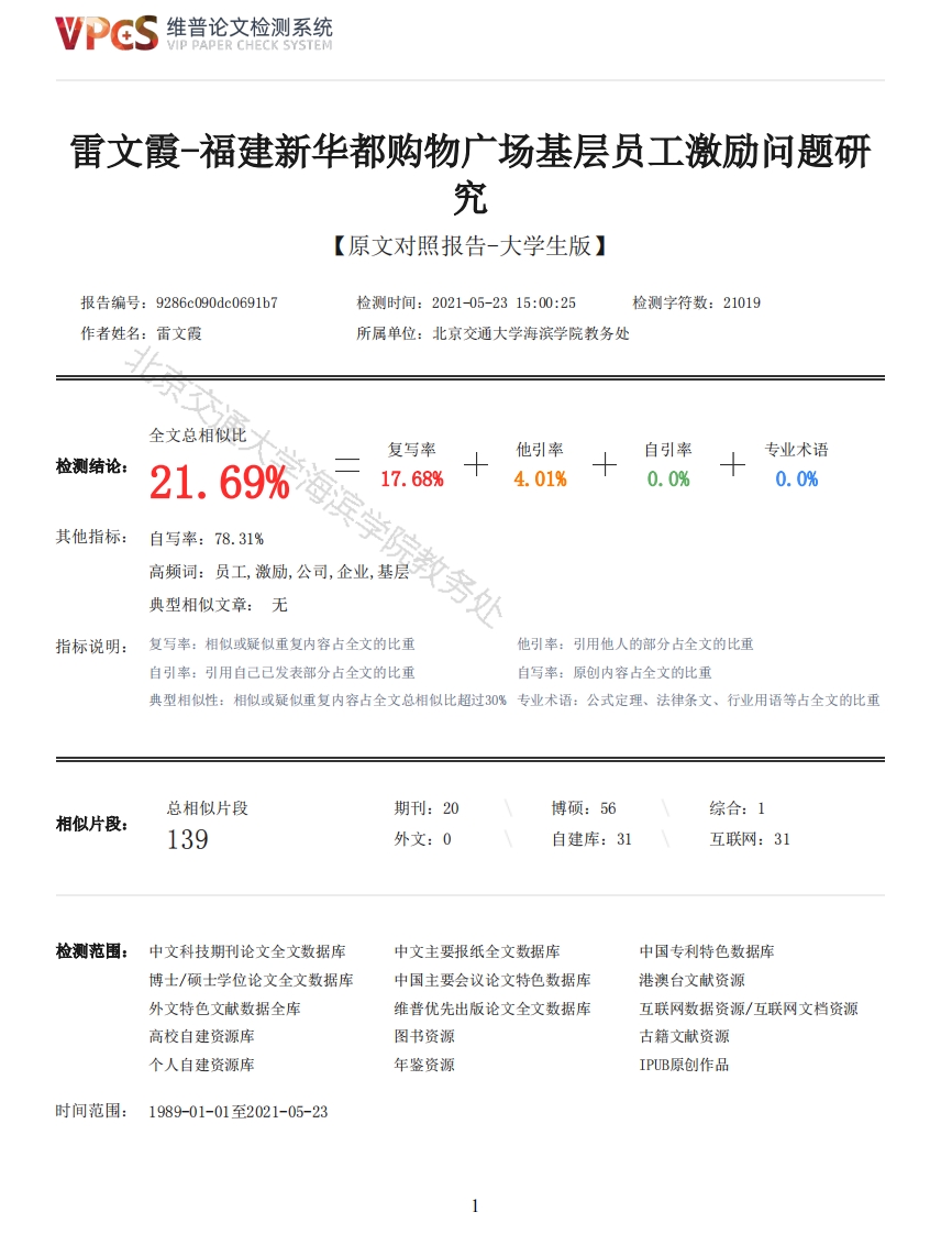 维普论文检测系统VIP PAPER CHECK SYSTEM雷文霞-福建新华都购物广场基层员工激励问题研究【原文对照报告-大学生版】报告编号:9286c090dc0691b7检测时间:2021-05-2315:00:25检测字符数:21019作者姓名:雷文霞所属单位:北京交通大学海滨学院教务处全文总相似比复写率他引率自引率专业术语检测结论:21.69%母17.68%4.01%0.0%0.0%其他指标:自写率:78.31%高频词:员工,激励,公司,企业,基层》典型相似文章:无务处指标说明:复写率:相似或疑似重复内容占全文的比重他引率:引用他人的部分占全文的比重自引率:引用自己已发表部分占全文的比重自写率:原创内容占全文的比重典型相似性:相似或疑似重复内容占全文总相似比超过30%专业术语:公式定理、法律条文、行业用语等占全文的比重总相似片段期刊:20博硕:56综合:1相似片段:139外文:0自建库:31互联网:31检测范围:中文科技期刊论文全文数据库中文主要报纸全文数据库中国专利特色数据库博士/硕士学位论文全文数据库中国主要会议论文特色数据库港澳台文献资源外文特色文献数据全库维普优先出版论文全文数据库互联网数据资源/互联网文档资源高校自建资源库图书资源古籍文献资源个人自建资源库年鉴资源IPUB原创作品时间范围:1989-01-01至2021-05-23维普论文检测系统VIP PAPER CHECK SYSTEM原文对照颜色标注说明:■自写片段■复写片段(相似或疑似重复)口引用片段(引用)■专业术语(公式定理、法律条文、行业用语等)交通大学海滨学院学士学位论文福建新华都购物广场基层员工激励问题研究姓名雷文霞学号17871096院系经济管理学院专业工商管理指导老师刘旻职称副教授二零二一年六月六日学位论文原创性声明本人所提交的学位论文《福建新华都购物广场基层员工激励问题研究》,是在导师的指导下,独立进行研究工作所取得的原创性成果。除文中已经注明引用的内容外,本论文不包含任何其他个人或集体已经发表或撰写过的研究成果。对本文的研究做出重要贡献的个人和集体,均已在文中标明。本声明的法律后果由本人承担。论文作者(签名):指导教师确认(签名):2021年5月31日2021年5月31日学位论文版权使用授权书2维普论文检测系统VIP PAPER CHECK SYSTEM本学位论文作者完全了解北京交通大学海滨学院有权保留并向国家有关部门或机构送交学位论文的复印件和磁盘,允许论文被查阅和借阅。本人授权北京交通大学海滨学院可以将学位论文的全部或部分内容编入有关数据库进行检索,可以采用影印、缩印或其它复制手段保存、汇编学位论文。论文作者(签名):指导教师(签名):2021年5月31日2021年5月31日摘要企业的快速发展离不开人的努力,而线下零售商受到了电子商务的沉重打击,企业人力资源的开发就格外重要。而购物广场的基层人员流动性大,人才流失严重,企业要想留住优秀的基层人才,企业必须建立合理的人才培养策略。为了提高福建新华都购物广场股份有限公司基层员工的工作积极性,本文主要研究了公司基层员工激励现状问题。首先,在研究的目的和背景的基础上,采用文献法对国内外的员工激励现状和相关理论进行分析整合:然后,从人力资源的角度出发,设计了一套关于公司基层员工满意度的调查问卷。之后,按照发现问题、分析问题、解决问题的思路,分析了福建新华都购物广场股份有限公司在薪酬激励、员工晋升制度和激励方式等方面的问题及缘由,发现公司存在薪酬制度缺乏科学性、物资激励与精神激励不平衡和员工晋升制度不完善等问题。最后希望通过提出合理化建议和对策,充分发挥员工激励对公司的作用,提高公司的行业竞争力,从而为同类问题的公司制订激励机制提供参考。关键词:基层员工;员工激励:激励理论ABSTRACTThe rapid development of enterprises cannot be achieved without the efforts of people,and withoffline retailers being hit hard by e-commerce,the development of enterprise human resources isparticularly important.While the grassroots staff of shopping plazas are highly mobile and there isserious brain drain,in order to retain excellent grassroots talents,enterprises must establish areasonable talent development strategy.In order to improve the work motivation of the grassroots staff of Fujian Xinhuadu ShoppingPlaza Company Limited,this paper focuses on the current situation of the company's grassroots staffmotivation.Firstly,based on the purpose and background of the study,the literature method wasused to analyze and integrate the current situation of employee motivation and related theories athome and abroad;then,from the perspective of human resources,a set of questionnaires on thesatisfaction of the company's grassroots employees was designed.After that,according to the ideaof problem identification,problem analysis and problem solving,the problems and causes of theremuneration incentive,staff promotion system and incentive methods of Fujian Xinhuadu ShoppingPlaza Company Limited.were analyzed,and it was found that the company had problems such as lowsatisfaction of remuneration incentive,imbalance between material incentive and spiritual incentiveand imperfect staff promotion system.Finally,it is hoped that by putting forward rationalizedsuggestions and countermeasures,the company will give full play to the role of employee motivationto the company and improve its competitiveness in the industry,so as to provide reference forcompanies with similar problems to develop incentive mechanisms.Key Words:Grassroots employees;Employee Motivation;Motivation Theory目录第1章绪论11.1选题背景、研