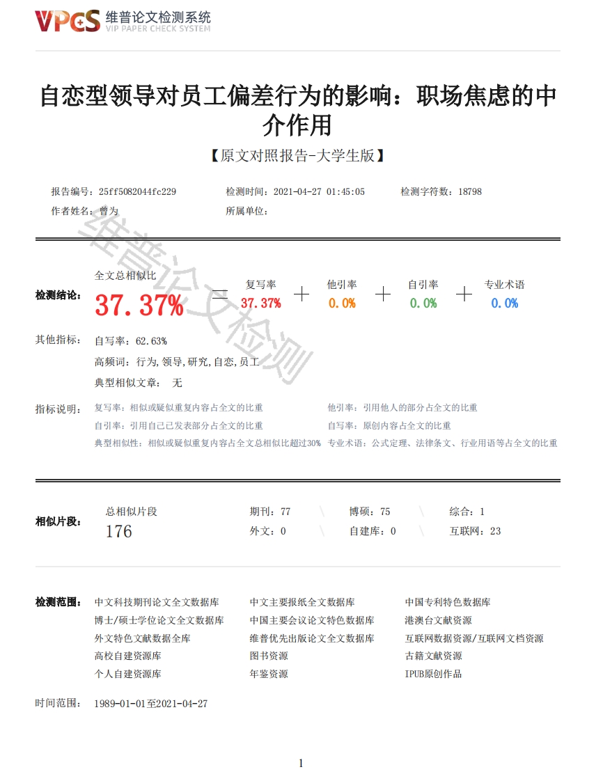 维普论文检测系统/IP PAPER CHECK SYSTEM自恋型领导对员工偏差行为的影响:职场焦虑的中介作用【原文对照报告-大学生版】报告编号:25ff5082044fc229检测时间:2021-04-2701:45:05检测字符数:18798作者姓名:曾为所属单位:全文总相似比复写率他引率自引率专业术语检测结论:37.37%37.37%0.0%0.0%十0.0%其他指标:自写率:62.63%高频词:行为,领导,研究,自恋,员工典型相似文章:无指标说明:复写率:相似或疑似重复内容占全文的比重他引率:引用他人的部分占全文的比重自引率:引用自己已发表部分占全文的比重自写率:原创内容占全文的比重典型相似性:相似或疑似重复内容占全文总相似比超过30%专业术语:公式定理、法律条文、行业用语等占全文的比重总相似片段期刊:77博硕:75综合:1相似片段:176外文:0自建库:0互联网:23检测范围:中文科技期刊论文全文数据库中文主要报纸全文数据库中国专利特色数据库博士/硕士学位论文全文数据库中国主要会议论文特色数据库港澳台文献资源外文特色文献数据全库维普优先出版论文全文数据库互联网数据资源/互联网文档资源高校自建资源库图书资源古籍文献资源个人自建资源库年鉴资源IPUB原创作品时间范围:1989-01-01至2021-04-27维普论文检测系统VIP PAPER CHECK SYSTEM原文对照颜色标注说明:■自写片段■复写片段(相似或疑似重复)引用片段(引用)■专业术语(公式定理、法律条文、行业用语等)州州大学本科毕业论文(设计)课题名称自恋型领导对员工偏差行为的影响:职场焦虑的中介作用学院工商管理学院专业人力资源管理班级名称人力172学生姓名曾为学号1765700048指导教师史丽华完成日期2021.4.11教务处制自恋型领导对员工偏差行为的影响:职场焦虑的中介作用人力172曾为指导教师:史丽华摘要以自我为中心、伴有侵略性、自夸等著名的自恋型领导,其负面行为被大量研究证明对组织的发展具有不利影响,引起了学术界和企业界的重视。本研究基于情感事件理论,探讨自恋型领导对员工偏差行为的影响效应,以及员工职场焦虑扮演的中介机制。基于267份样本的研究结果显示,自恋型领导和员工偏差行为之间的正向关系显著,职场焦虑在自恋型领导与员工偏差行为的关系中起完全中介的作用。本文将结合研究发现从各个变量间的相关方面给企业提出有效重视和管理员工偏差行为的建议,从而使企业能够长远健康地发展,促进营造良性的劳动力市场。本研究一方面丰富了自恋型领导和员工偏差行为理论体系,另一方面也对减少自恋型领导负面影响提供了有益的借鉴。关键词自恋型领导:职场焦虑:偏差行为:情感事件理论ABSTRACT Self centered,aggressive,boastful and other well-known narcissistic leaders,whosenegative behaviors have been proved to have adverse effects on the development of organizations by a2维普论文检测系统VIP PAPER CHECK SYSTEMlarge number of studies,have attracted the attention of academic and business circles.Based onaffective event theory,this study explores the influence of narcissistic leadership on employeedeviant behavior and the mediating mechanism of employee anxiety.Based on 267 samples,the resultsshow that there is a significant positive relationship between narcissistic leadership and employeedeviant behavior,and anxiety plays a completely mediating role in the relationship betweennarcissistic leadership and employee deviant behavior.Based on the research findings,this paperputs forward suggestions for enterprises to effectively pay attention to and manage employees'deviant behavior from the relevant aspects of various variables,so as to enable enterprises todevelop healthily in the long run and promote the construction of a benign labor market.On the onehand,this study enriches the theoretical system of narcissistic leadership and employee deviantbehavior,on the other hand,it also provides a useful reference for reducing the negative impact ofnarcissistic leadership.KEY WORDS Narcissistic leadership:anxiety:proactive personality:Emotional event theory目录第1章绪论11.1研究背景11.2研究目的21.3研究意义31.3.1理论意义31.3.2现实意义31.4研究方法与内容31.4.1研究方法3普论文检测1.4.2研究内容4第2章国内外文献综述62.1自恋型领导的相关文献综述62.1.1自恋型领导的概念及测量62.1.2自恋型领导的影响效应72.1.3小结72.2职场焦虑的相关文献综述72.2.1职场焦虑的概念及测量72.2.2职场焦虑的影响效应82.2.3小结82.3员工偏差行为的相关文献综述92.3.1员工偏差行为的概念及测量92.3.2员工偏差行为的影响因素92.3.3小结10第3章研究假设与理论模型113.1研究假设113.1.1自恋型领导与员工员工偏差行为113.1.2职场焦虑的中介作用123.2理论模型13第4章研究设计144.1数据收集与样本描述性统计分析144.2测量工具154.2.1自恋型领导量表154.2.2职场焦虑量表154.2.3员工偏差行为量表163