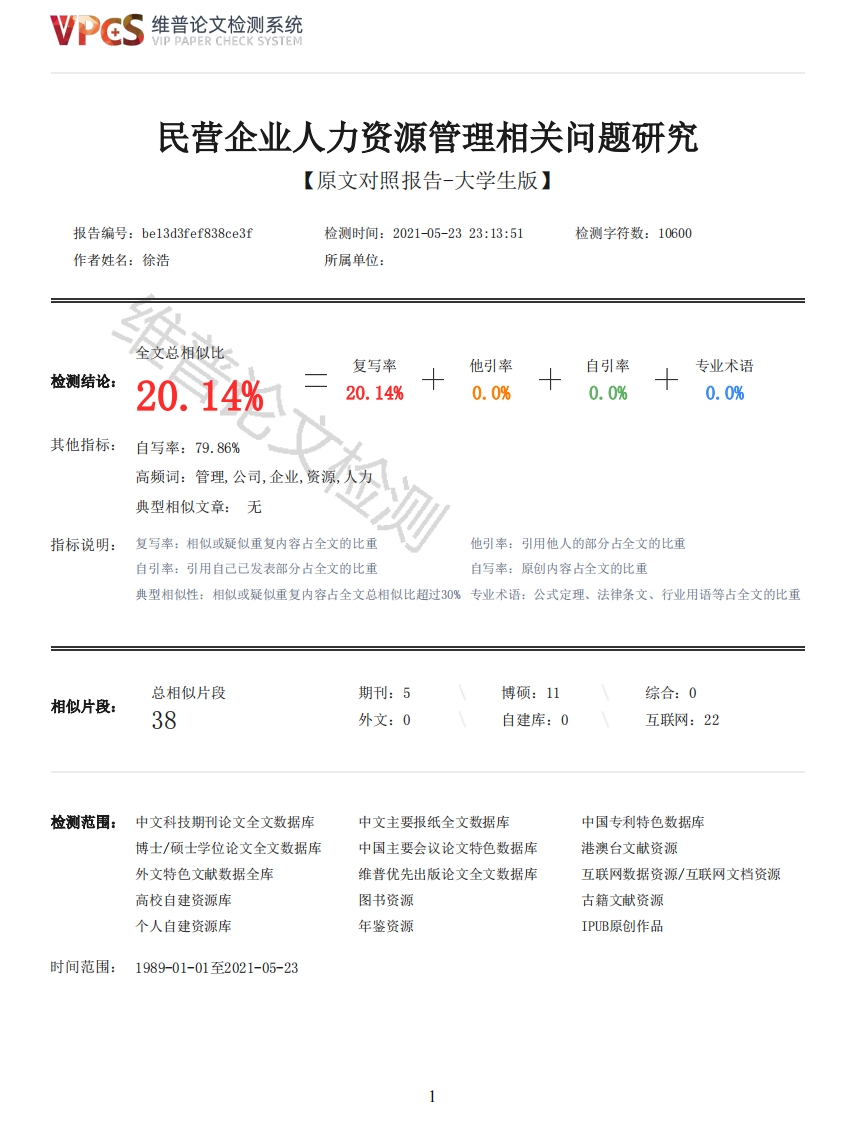 维普论文检测系统/IP PAPER CHECK SYSTEM民营企业人力资源管理相关问题研究【原文对照报告-大学生版】报告编号:be13d3fef838ce3f检测时间:2021-05-2323:13:51检测字符数:10600作者姓名:徐浩所属单位:全文总相似比复写率他引率自引率专业术语检测结论:20.14%20.14%0.0%0.0%0.0%其他指标:自写率:79.86%高频词:管理,公司,企业,资源,人典型相似文章:无指标说明:复写率:相似或疑似重复内容占全文的比重他引率:引用他人的部分占全文的比重自引率:引用自己已发表部分占全文的比重自写率:原创内容占全文的比重典型相似性:相似或疑似重复内容占全文总相似比超过30%专业术语:公式定理、法律条文、行业用语等占全文的比重总相似片段期刊:5博硕:11综合:0相似片段:38外文:0自建库:0互联网:22检测范围:中文科技期刊论文全文数据库中文主要报纸全文数据库中国专利特色数据库博士/硕士学位论文全文数据库中国主要会议论文特色数据库港澳台文献资源外文特色文献数据全库维普优先出版论文全文数据库互联网数据资源/互联网文档资源高校自建资源库图书资源古籍文献资源个人自建资源库年鉴资源IPUB原创作品时间范围:1989-01-01至2021-05-23维普论文检测系统VIP PAPER CHECK SYSTEM原文对照颜色标注说明:■自写片段■复写片段(相似或疑似重复)口引用片段(引用)■专业术语(公式定理、法律条文、行业用语等)武汉理工大学毕业设计(论文)民营企业人力资源管理相关问题研究学习中心(函授站):珠海函授站(深圳教学点)专业:工商企业管理年级层次:2019春季专升本学生姓名:徐浩导师姓名:邓文明学位论文原创性声明本人郑重声明:所呈交的论文是本人在导师的指导下独立进行研究所取得的研究成果。除了文中特别加以标注引用的内容外,本论文不包括任何其他个人或集体已经发表或撰写的成果作品。本人完全意识到本声明的法律后果由本人承担。作者签名:徐浩2021年5月23日学位论文版权使用授权书本学位论文作者完全了解学校有关保障、使用学位论文的规定,同意学校保留并向有关学位论文管理部门或机构送交论文的复印件和电子版,允许论文被查阅和借阅。本人授权省级优秀学士论文评选机构将本学位论文的全部或部分内容编入有关数据进行检索,可以采用影印、缩印或扫描等复制手段保存和汇编本学位论文。本学位论文属于1、保密口,在年解密后适用本授权书2、不保密口。(请在以上相应方框内打“√”)作者签名:徐浩2021年5月23日导师签名:年月日(注:此页内容装订在论文扉页)摘要进入新时代后,经济发展的全球化进程不断推进,社会发展中的市场竞争已经达到越来越激烈的环节。每个人的日常生活和工作节奏都在不断变化。私营企业具有那个时代的特征。要充分发挥话语权,就必须继续提高优化人力资源配置的能力,因为人是私营企业最宝贵的资源,也是公司必须高度重视的资源。在此基础上,文章首先详细介绍了本课题的研究背景和意义。第二部分是基础理论部分,它分析了与人力资源优化配置有关的基础知识。第三部分以实际的假日旅游公司为例。分析企业人力资源优化配置的现状。第四部分对企业人力资源优化配置进行了综2维普论文检测系统VIP PAPER CHECK SYSTEM合分析,并阐述了企业人力资源优化配置的不足。第五部分整合了基础知识与社会。经验清楚地提出了切实可行的对策和建议。根据本文的描述,为了对提高民营企业人力资源配置的优化有一定程度的基础理论和实践指导。关键词:民营企业:人力资源管理问题;解决措施:目录第1章绪论1第2章相关理论介绍22.1人力资源的含义22.2弗洛姆的期望理论22.3公平理论2第3章民营企业人力资源管理现状一一以M公司为例43.1M公司简介4◆3.2M公司人力资源管理现状53.2.1对晋升奖励制度的认可53.2.2绩效考核体系63.2.3薪酬体系管理分类体系的不断完善73.2.4注重新员工培训7第4章公司人力资源管理存在的问题84.1人力资源管理观念落后84.2人才激励机制体系不完善84.3企业绩效考核体系不完善8检测4.4企业薪酬体系不完善94.5公司人才培训机制有待健全9第5章完善民营企业人力资源管理发展的措施105.1制定人力资源发展规划并规范管理模式105.2完善企业激励机制建设105.2.1实施差异性激励政策105.2.2同等对待精神激励和物质激励115.3完善企业考核体系建设115.4完善企业薪酬体系建设115.5完善员工培训体系建设12参考文献13致谢14第1章绪论优化人力资源配置是民营企业成功的关键因素之一。长期以来,许多民营企业并未引起人们的高度关注。现在,它已成为民营企业可持续发展的主要障碍。因此,有必要根据当今人力资源管理的新特点和民营企业整合的具体情况,采取相应、有效、合理的防范措施,以应对民营企业最优配置中的关键问题。对私营企业有利的可持续发展概念现在是一个专业知识时期。此外,在人力资源管理时期,民营企业要想顺应发展趋势或取得成功,就会加剧在中国和国际市场上的激烈竞争和销售。市场是它的优势,因此人力资源管理必须是公司资源中最重要的要素。在现阶段,我国的企业还没有建立一套科学,规范的人力资源管理智能管理系统,因此在人力资源的优化配置中存在着一种或另一种问题。基本上如下:1落后的意识导致对人力资源管理缺乏及时的了解1人力资源的优化配置缺乏基本理论的应用,缺乏基本的