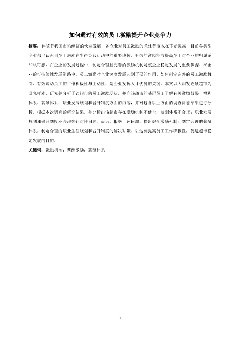 如何通过有效的员工激励提升企业竞争力摘要:伴随着我国市场经济的快速发展,各企业对员工激励的关注程度也在不断提高,目前各类型企业都己认识到员工激励在生产经营活动中的重要地位。有效的激励能够提高员工对企业的归属感和认可感,在企业的发展过程中,制定合理且完善的激励机制是使企业稳定发展的重要步骤。在企业的可持续性发展道路中,员工激励对企业深度发展起到了要的作用。如何制定完善的员工激励机制、有效调动员工的工作积极性与主动性、是企业发挥人才优势的关键。本文以大润发连锁超市为研究样本,研究并分析了该超市的员工激励现状。并向该超市的基层员工了解有关激励效果、福利体系、薪酬体系、职业发展规划和晋升制度方面的内容,并对包含以上方面的调查问卷结果进行分析。根据本次调查的研究结果,并分析出该超市存在激励机制不健全:薪酬体系不合理:职业发展规划和晋升制度不合理等针对性问题。最后,根据上述问题,提出健全激励机制:制定合理的薪酬体系:制定合理的职业生涯规划和晋升制度的解决对策。以达到提高员工工作积极性,促进超市稳定发展的目的。关键词:激励机制:薪酬激励:薪酬体系目录引言…1.1激励的原则和方法...1.1.1激励的原则...1.2薪酬水平和薪酬制度..1.2.1薪酬水平.52大润发连锁超市简介及员工激励现状2.1大润发连锁超市简介.....2.2大润发连锁超市员工激励现状2.2.1激励机制现状......62.2.2福利体系现状..62.2.4职业发展规划与晋升制度现状73大润发连锁超市员工激励存在的问题73.1.1激励机制单一...73.1.2激励机制无差异化..73.3职业发展规划和晋升制度不合理83.3.1职业发展规划不清晰...83.3.2晋升制度不公平....84大润发连锁超市员工激励机制问题对策.4.1.1建立新的激励机制...84.1.2实行差异化激励..…94.3制定合理的职业发展规划和晋升制度.94.3.1完善职业发展规划4.3.2实行公平的晋升制度10结论…113