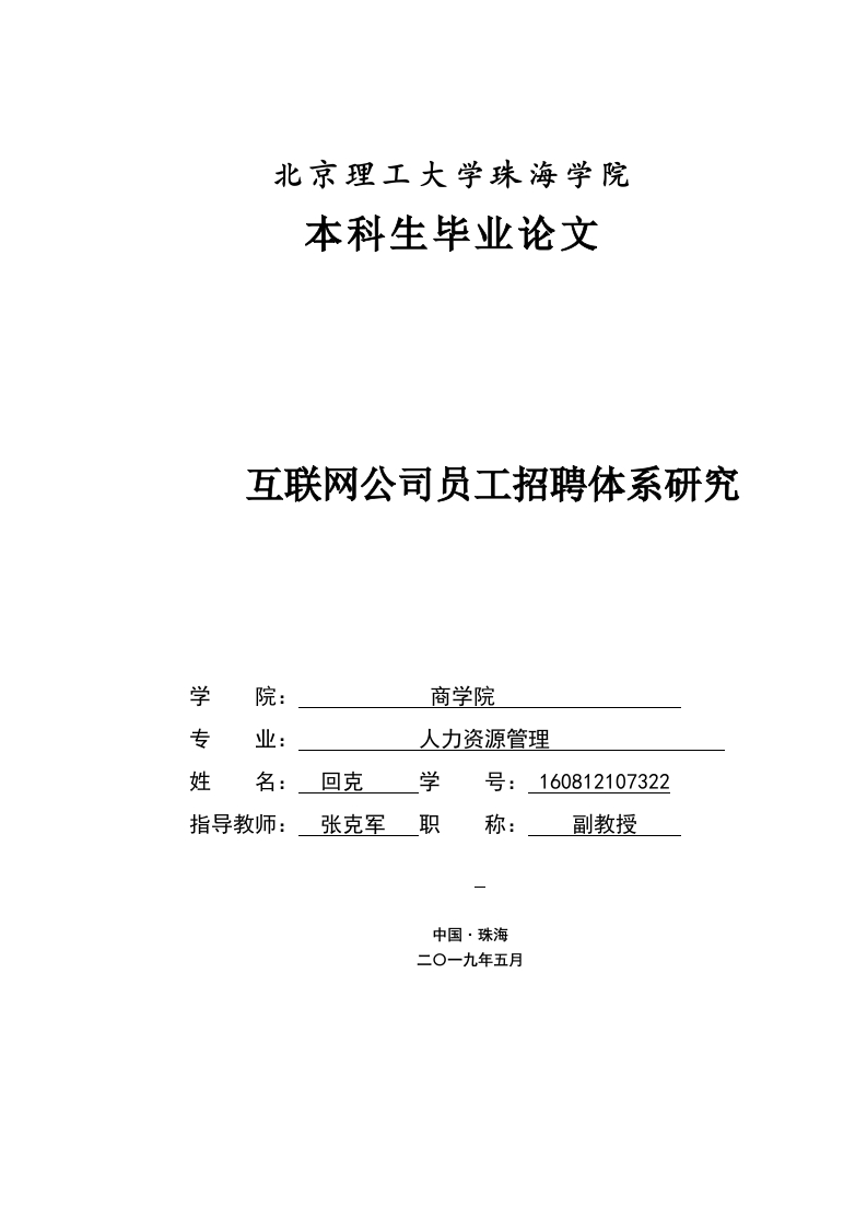 北京理工大学珠海学院本科生毕业论文互联网公司员工招聘体系研究学院:商学院专业:人力资源管理姓名:回克学号:160812107322指导教师:张克军职称:副教授北京理工大学珠海学院2020届本科生毕业论文诚信承诺书本人郑重承诺:我所呈交的毕业论文《互联网公司员工招聘体系研究》是在指导教师的指导下,独立开展研究取得的成果,文中引用他人的观点和材料,均在文后按顺序列出其参考文献,论文使用的数据真实可靠。承诺人签名:回克日期:2020年5月1日北京理工大学珠海学院2020届本科生毕业论文摘要现如今随着我国社会经济的迅速发展以及我国企业现代化进程的逐渐加深,企业之间的竞争开始逐渐向科技的竞争、创新的竞争发展,但究其根本还是人才的竞争。尤其是近几年新兴的互联网企业,其相关领域的人才竞争已经进入到了白热化阶段,甚至在很大程度上,左右了企业的发展与稳定,所以人力资源招聘工作的开展程度以及质量,是互联网企业人才竞争中的重要关键。本文以近几年在短视频领域发展迅猛的互联网H公司为研究案例,并以其现阶段的员工招聘体系为研究对象,首先对本文所需的方法进行总结,并对一些理论进行概述,从而为本文打下坚实的基础,然后集中对企业员工招聘体系进行研究分析,对存在如招聘基础不完善、招聘计划不合理、筛选环节以及招聘评估不全面等问题原因进行分析,并结合相关成因,有针对性的对问题提出解决建议,从而完善该企业的招聘体系,使之能够更好的为企业引入大批量的专业人才。关键词:人力资源:招聘体系:招聘方法